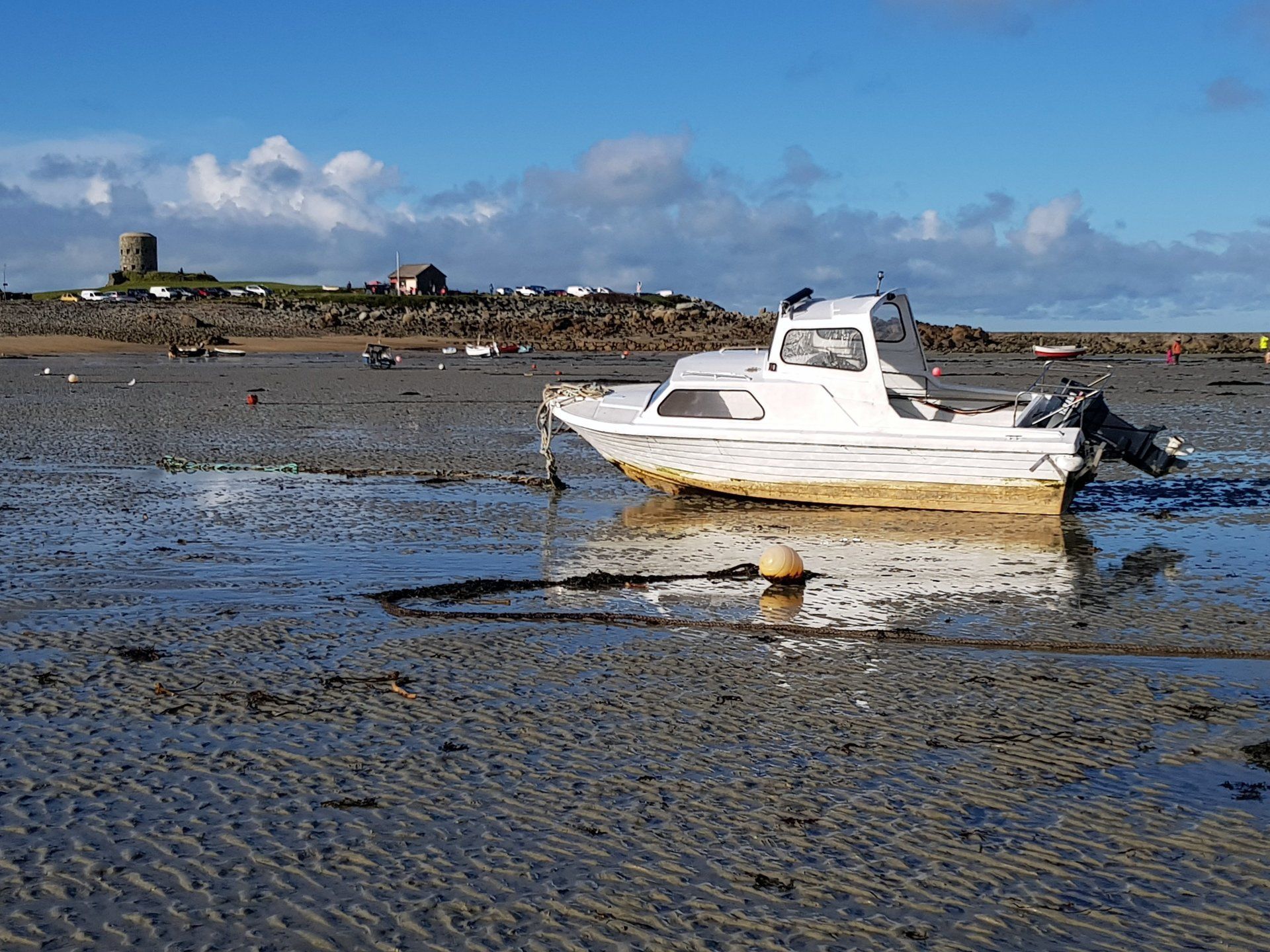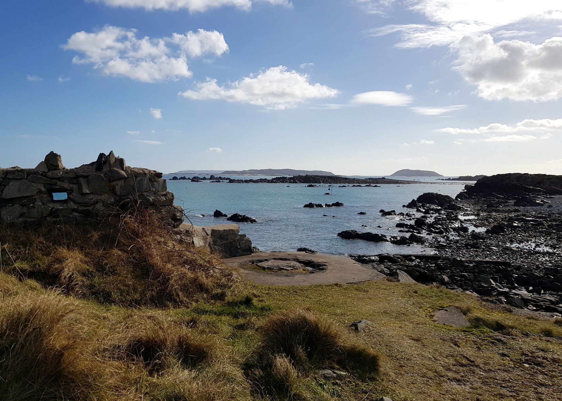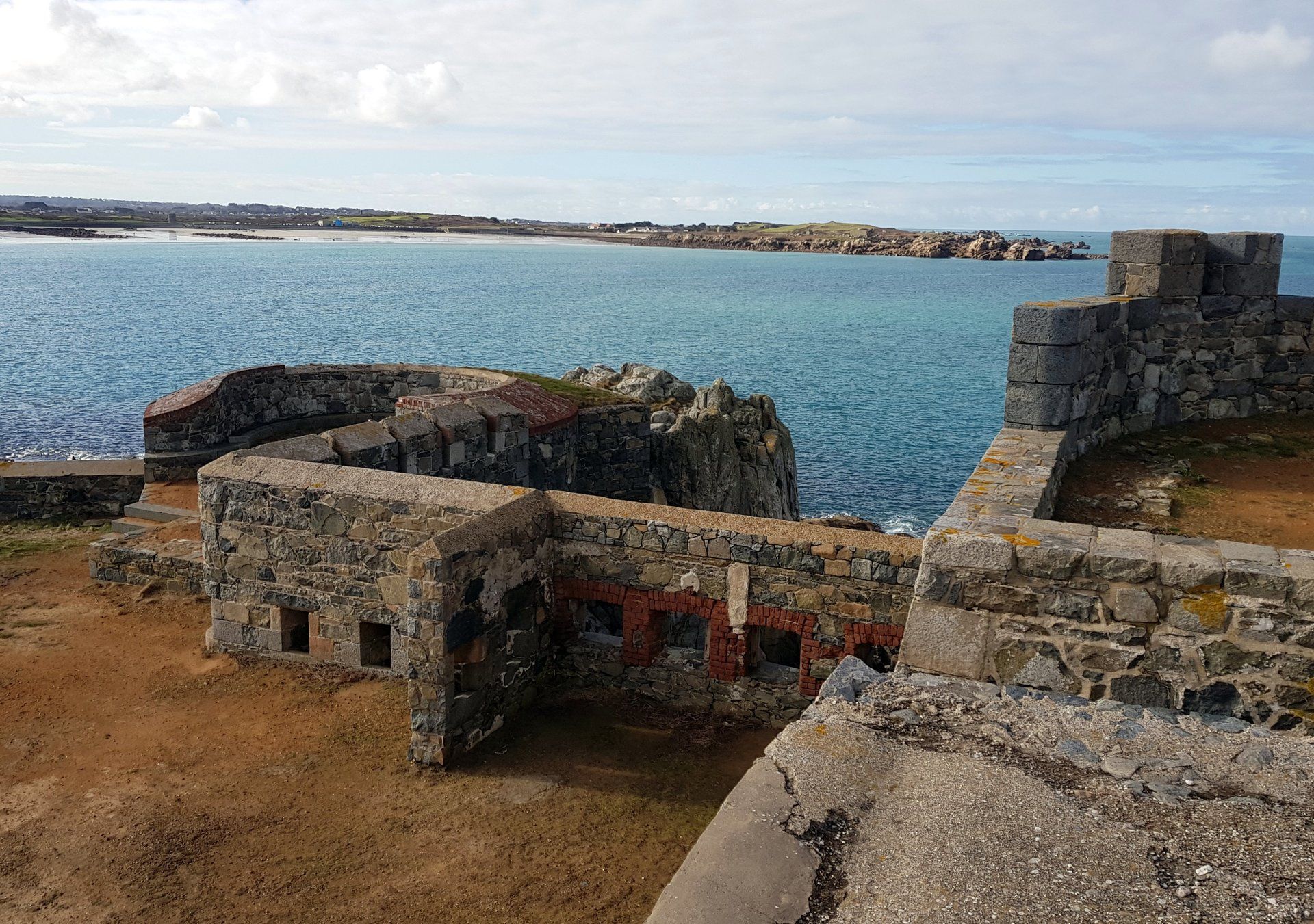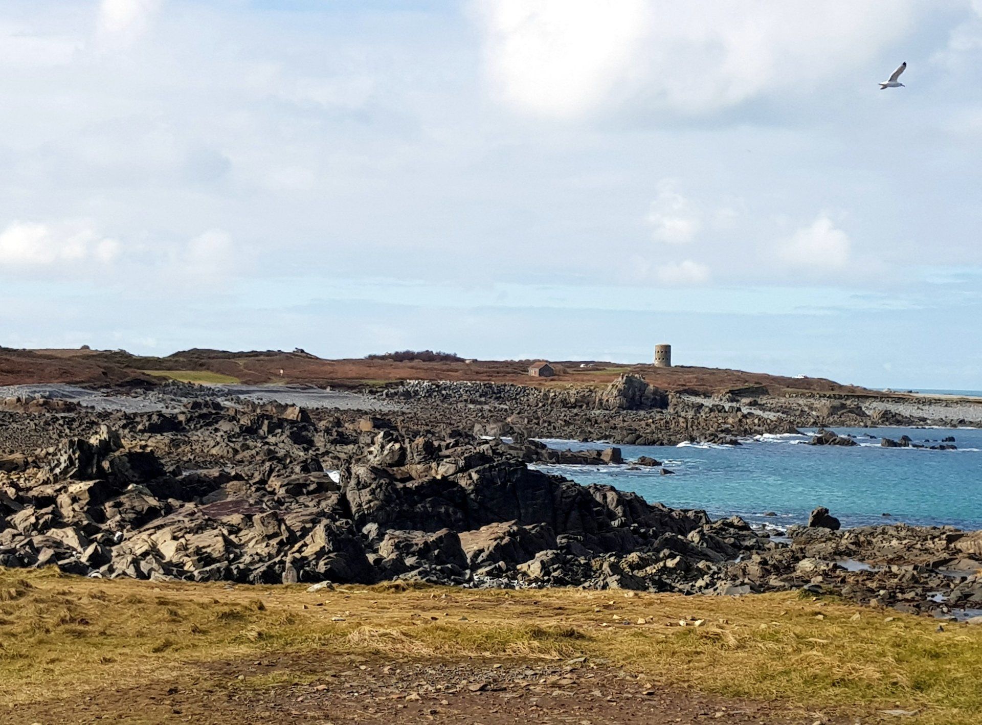 Arriving at Beaucette Marina is a marked contrast from where I left off 3 weeks ago, now sunshine and blue skies – same place but suddenly welcoming! Herm and the other Islands peak over as backdrop and look inviting again. The Platte Fougere lighthouse stands out white & black against the blue sky as I walk towards Fort Doyle and around the northerly points of the Island.