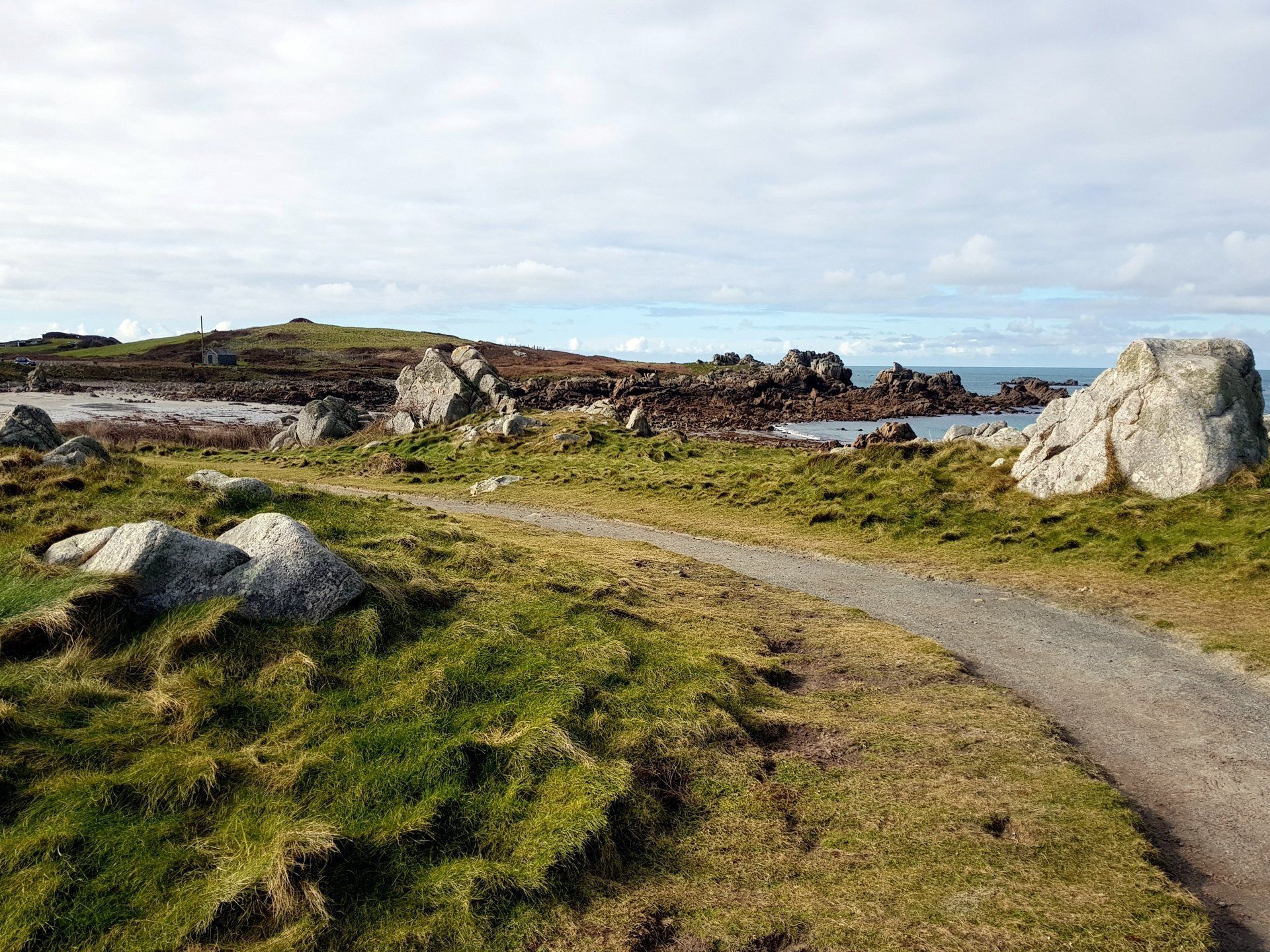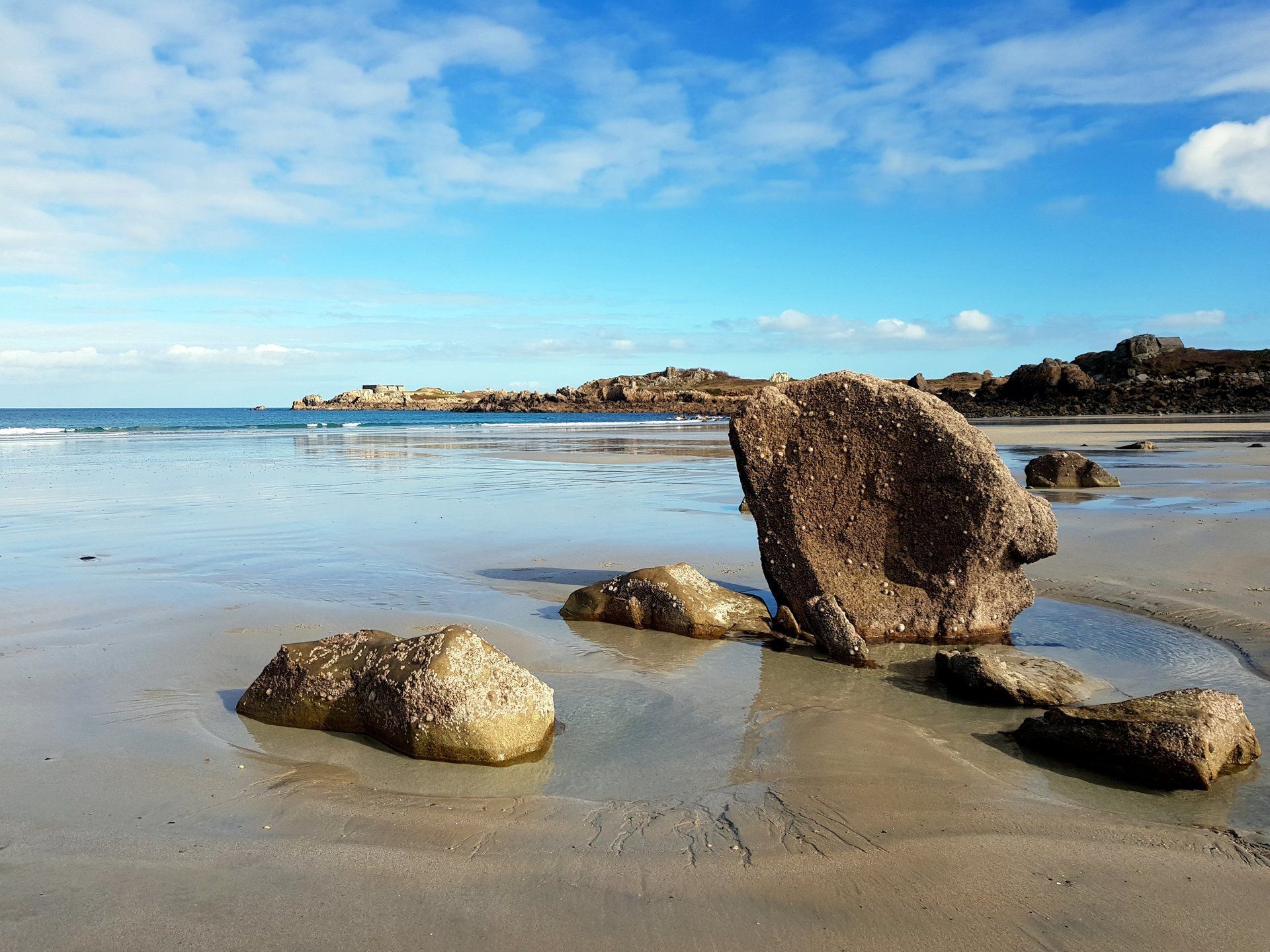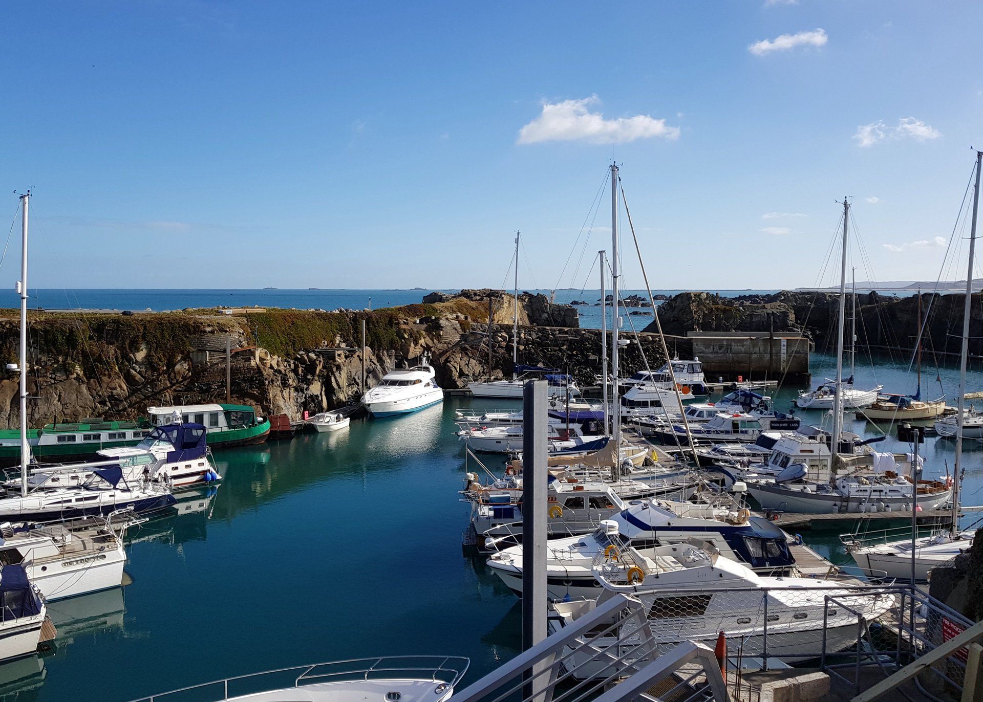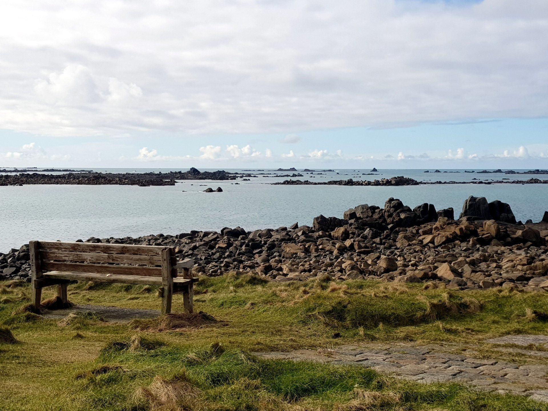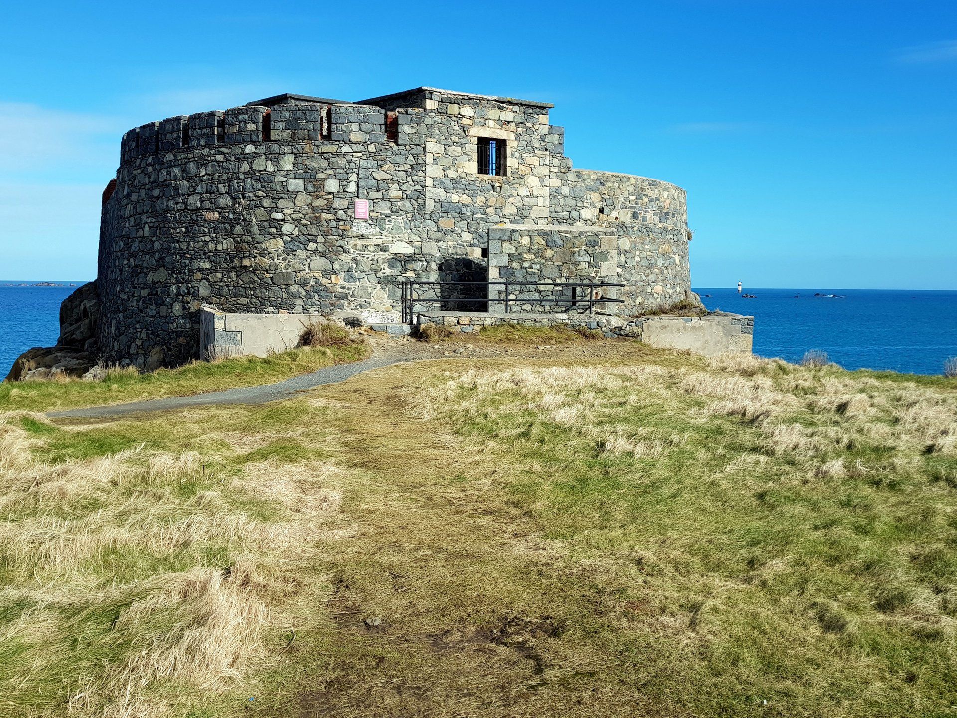 Arriving at Beaucette Marina is a marked contrast from where I left off 3 weeks ago, now sunshine and blue skies – same place but suddenly welcoming! Herm and the other Islands peak over as backdrop and look inviting again. The Platte Fougere lighthouse stands out white & black against the blue sky as I walk towards Fort Doyle and around the northerly points of the Island.
