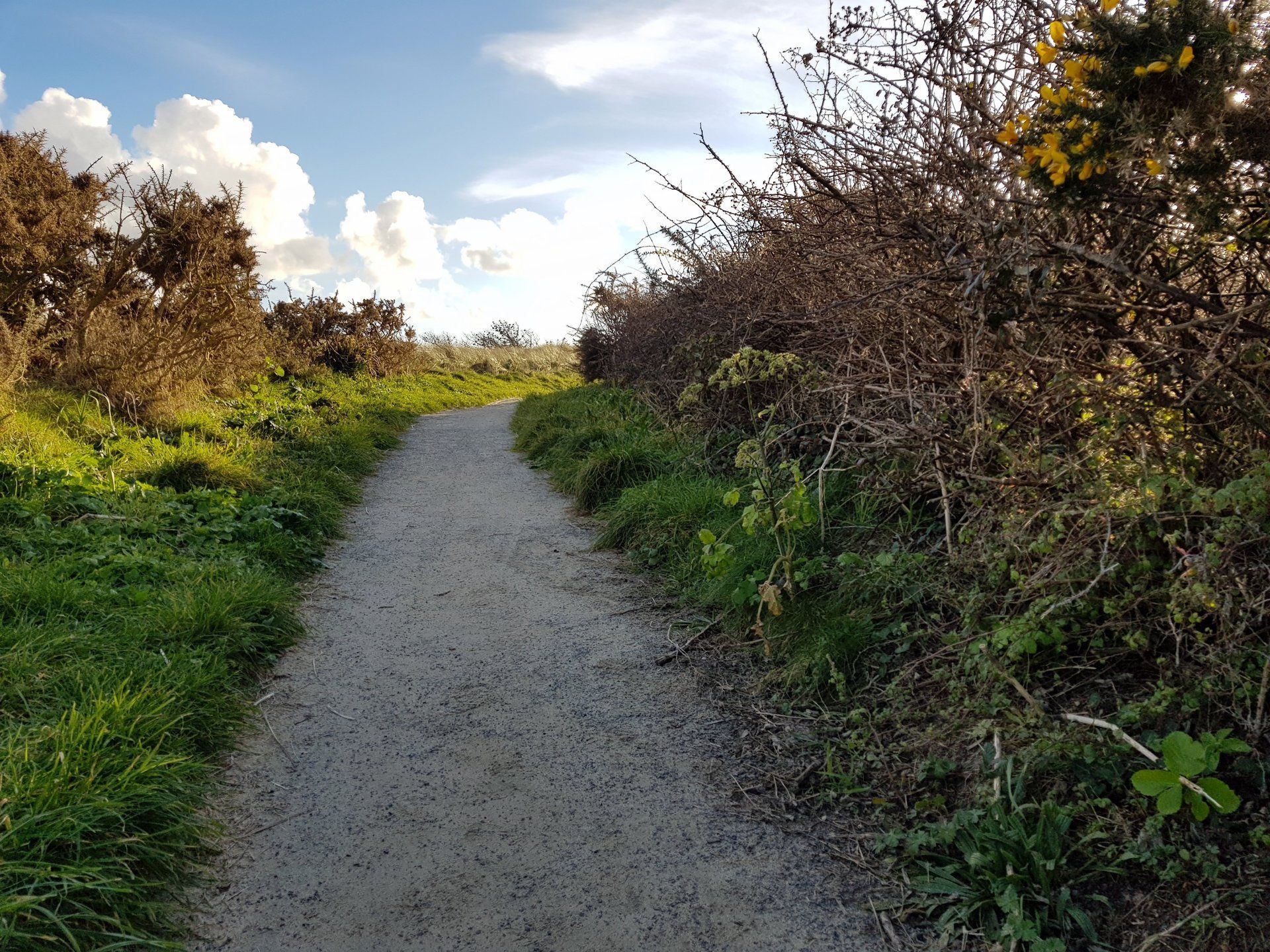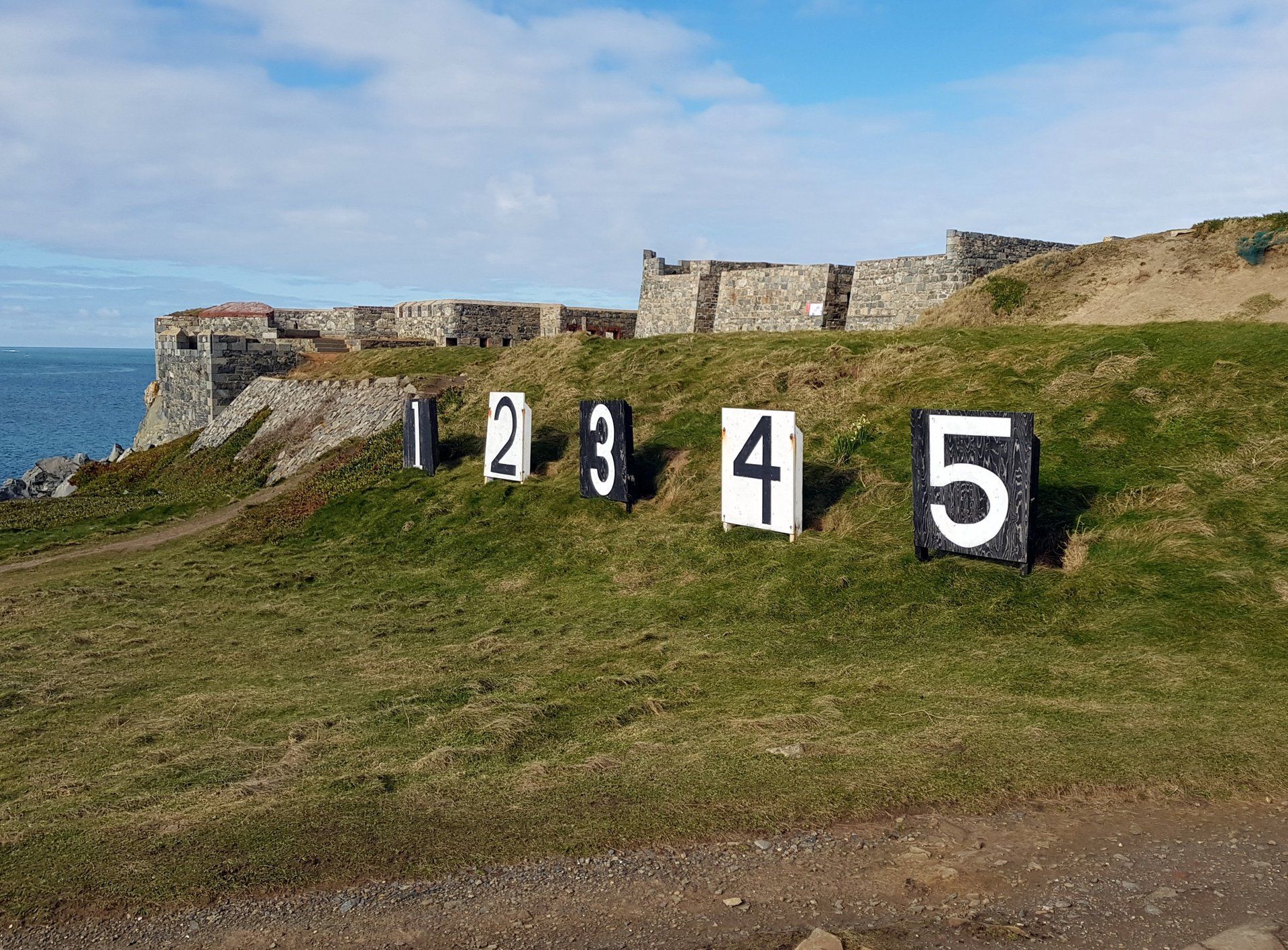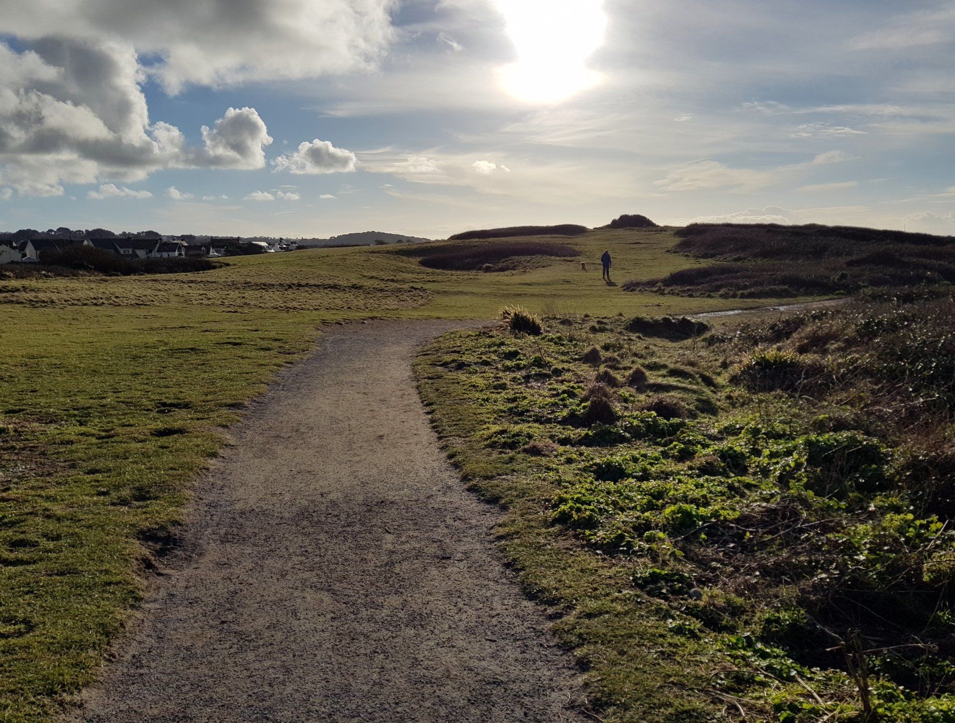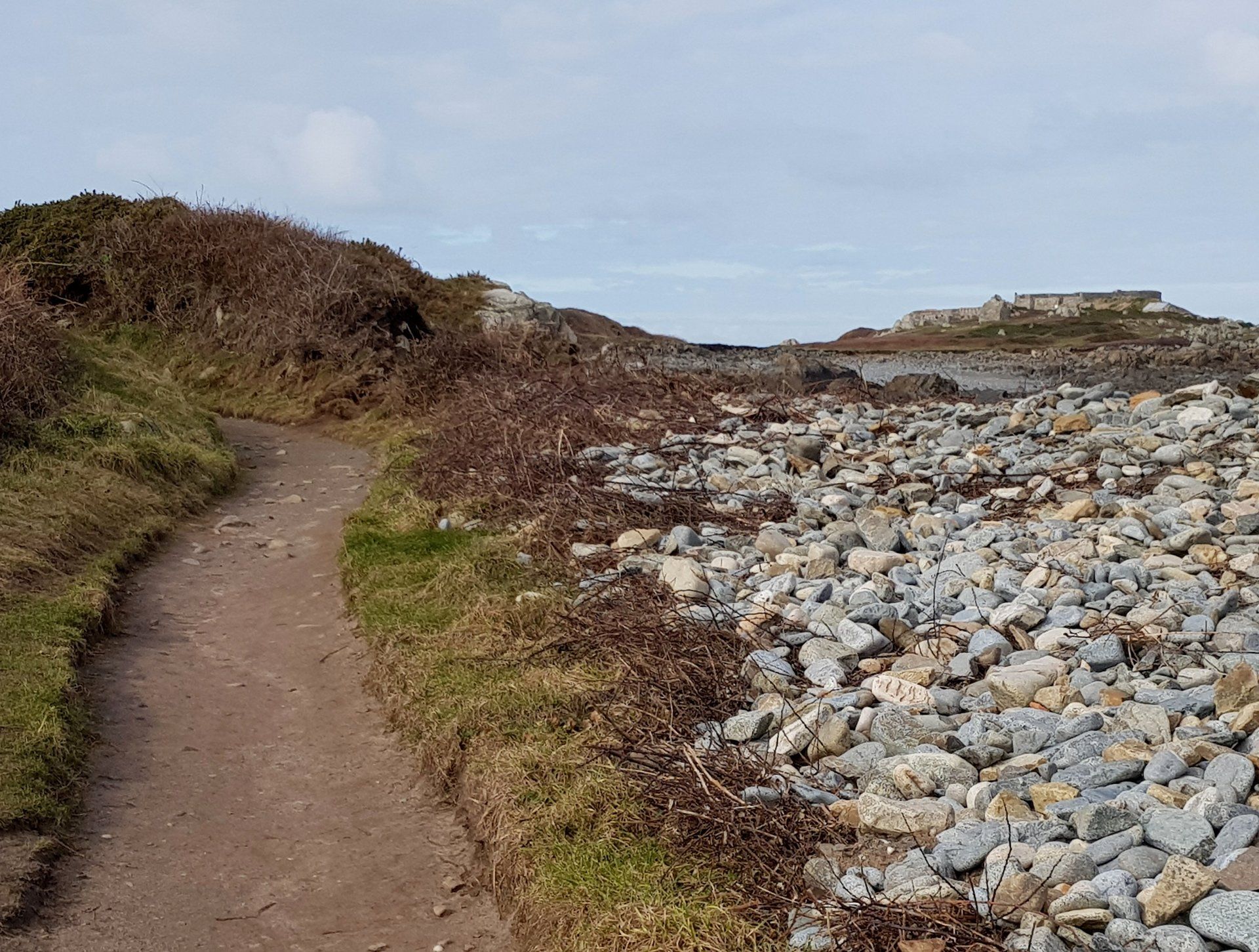Another month, another walk, hopefully an improvement on the last!. February 17th has decent forecast – a cool 9 degrees, light westerly wind and a fair amount of sun amongst patchy cloud. Sounds ok. Even given the poor conditions, the January route was not the most inspiring, being mostly roadside walking, but this month we head off around the northern tip of the Island, home to the common land, golf course, beaches and our old Napoleonic era fortifications.