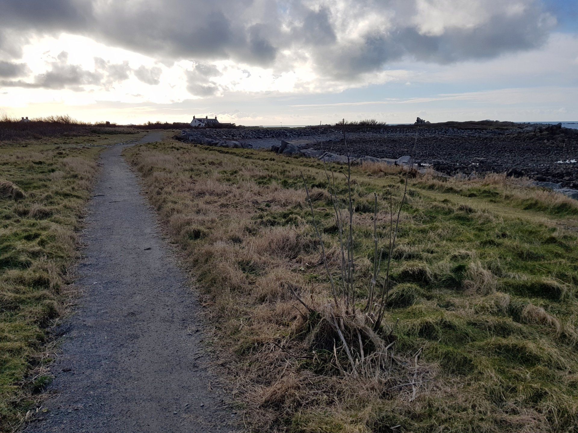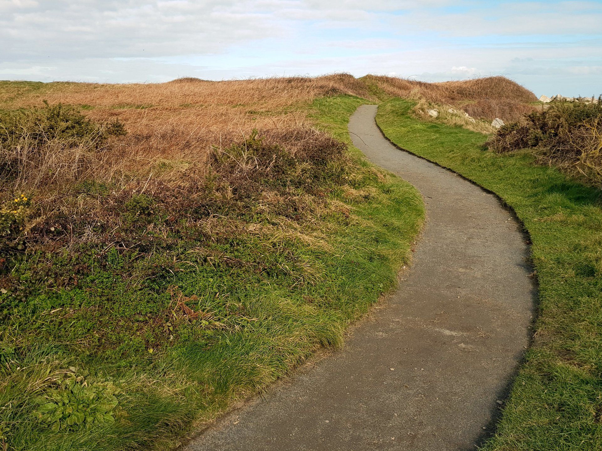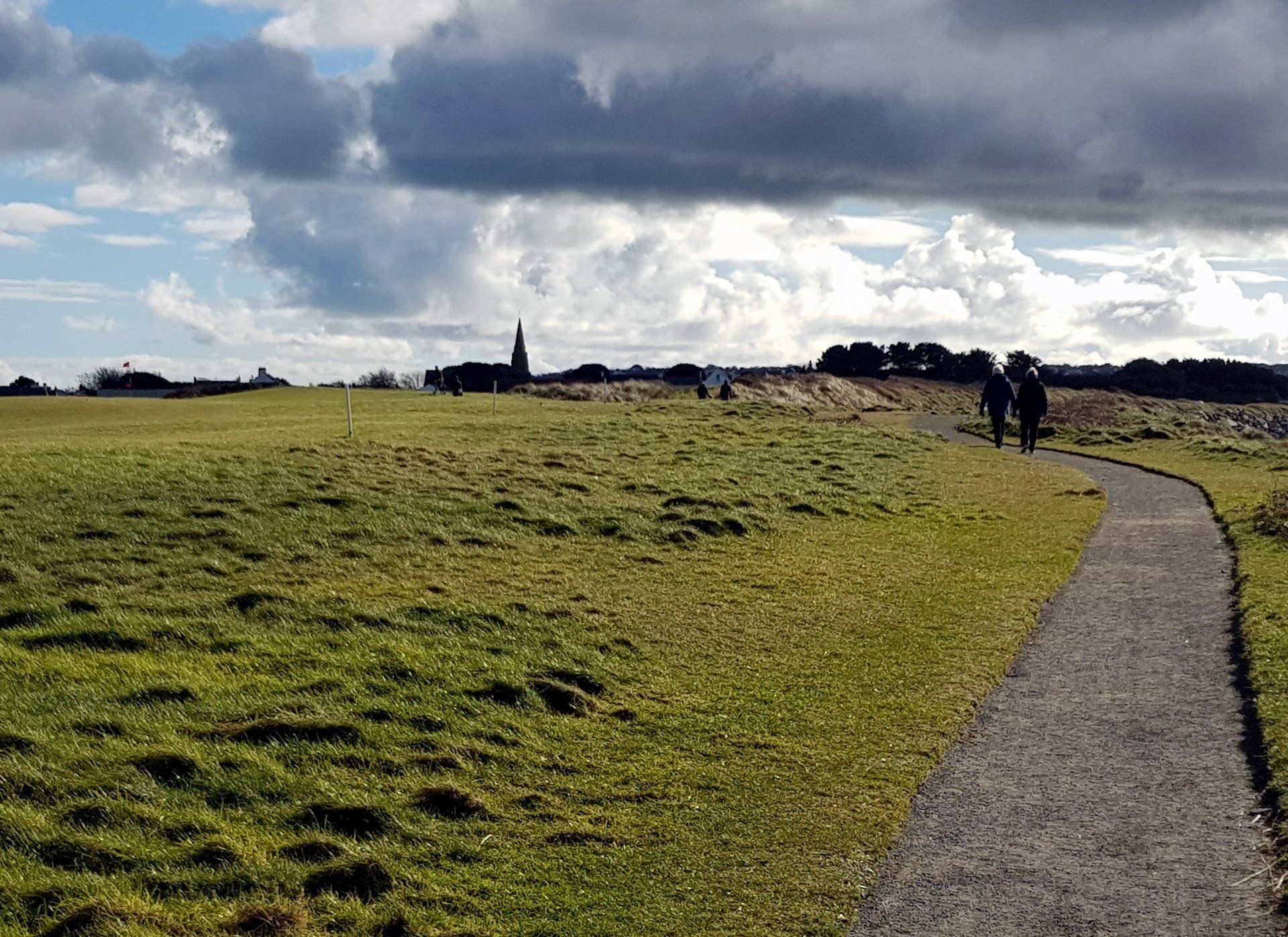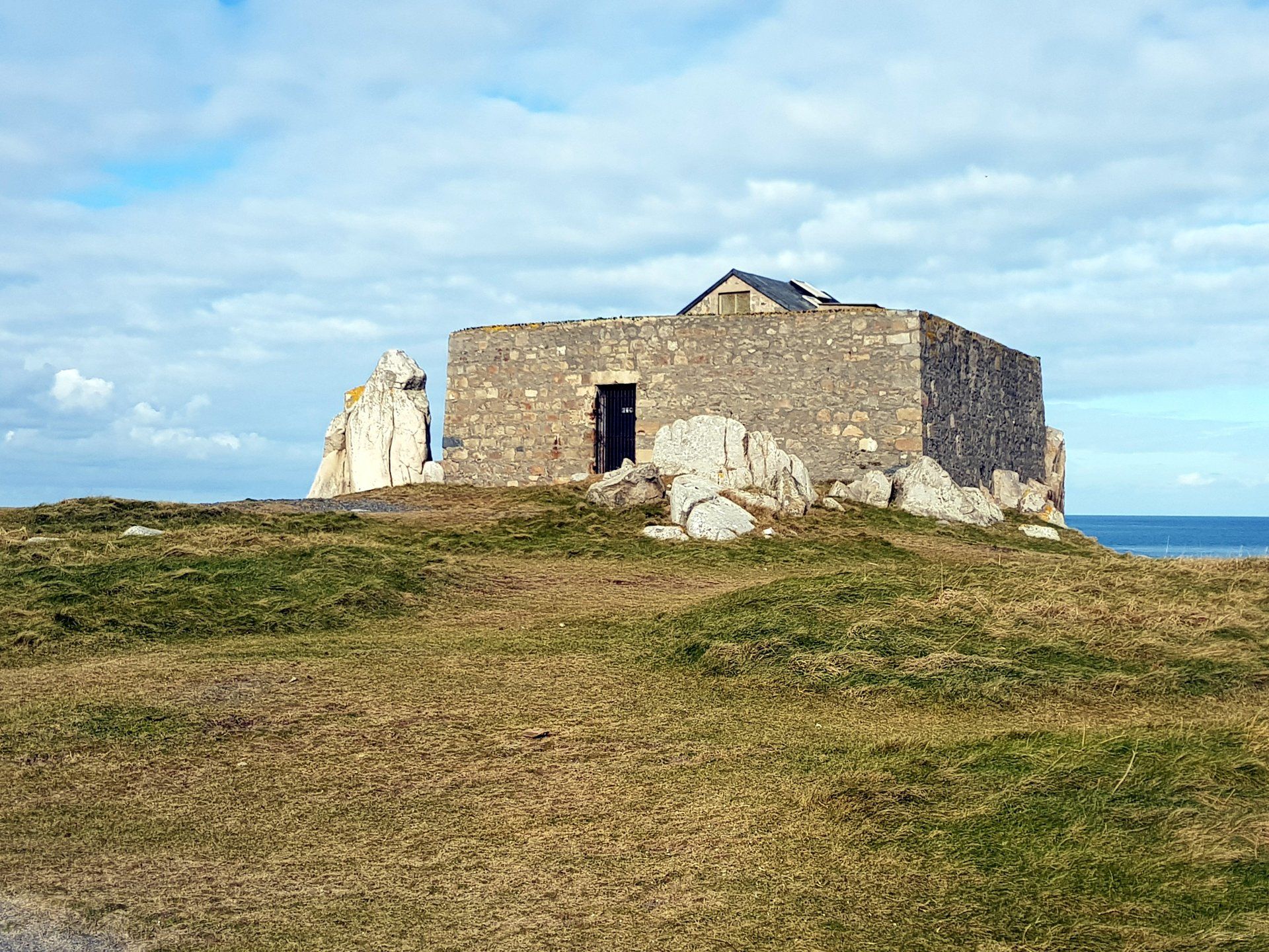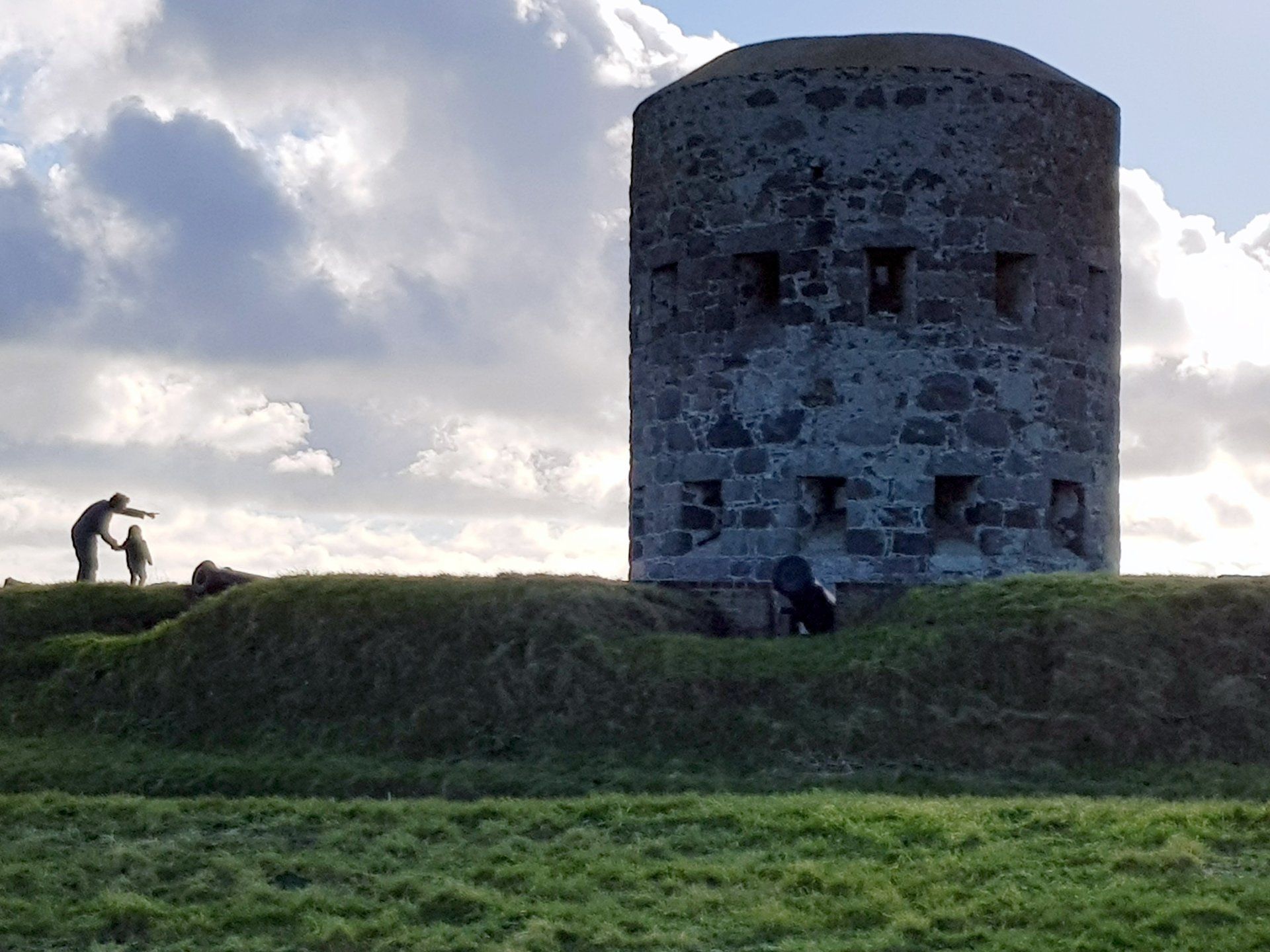 Another month, another walk, hopefully an improvement on the last!. February 17th has decent forecast – a cool 9 degrees, light westerly wind and a fair amount of sun amongst patchy cloud. Sounds ok. Even given the poor conditions, the January route was not the most inspiring, being mostly roadside walking, but this month we head off around the northern tip of the Island, home to the common land, golf course, beaches and our old Napoleonic era fortifications.