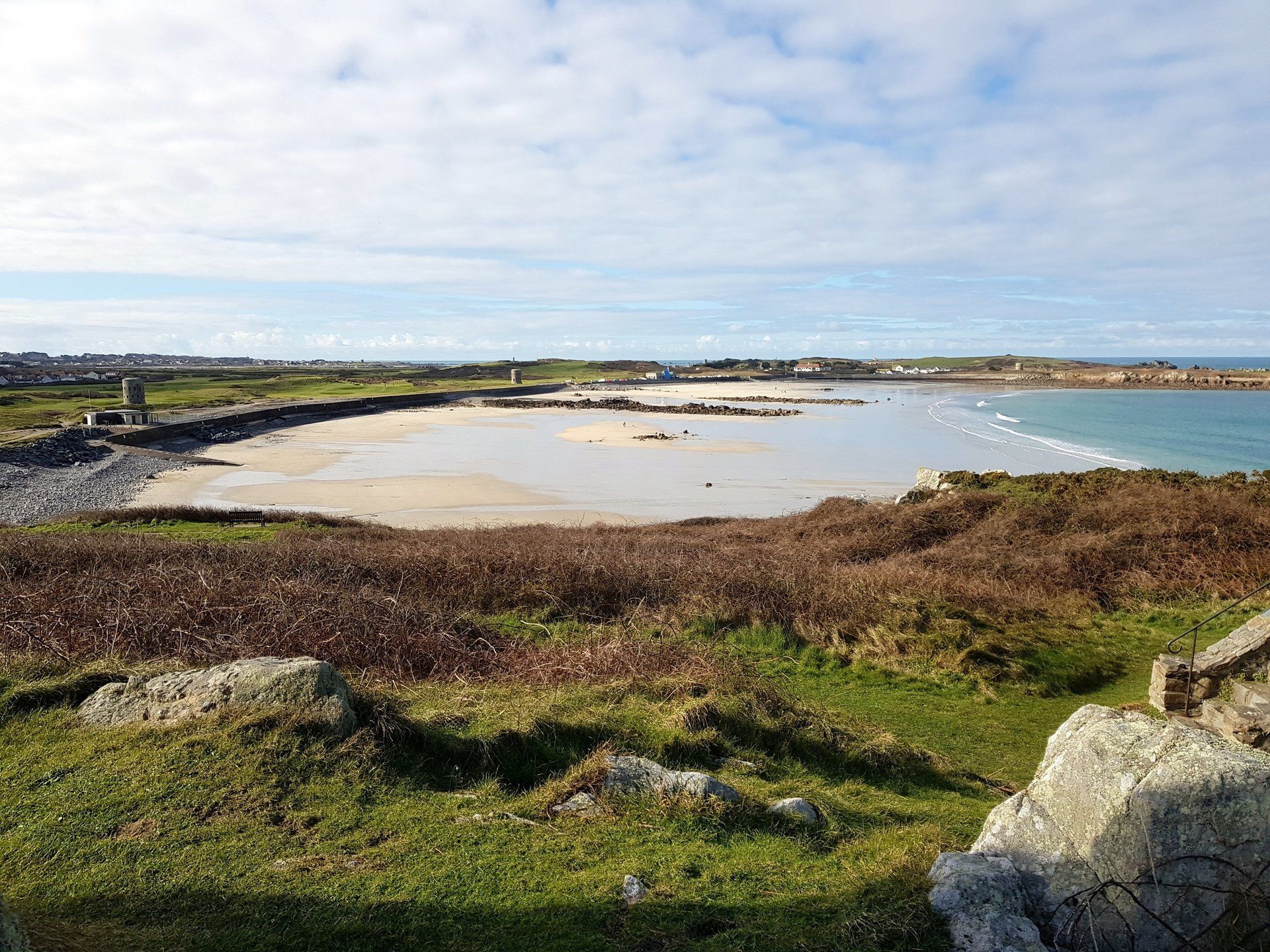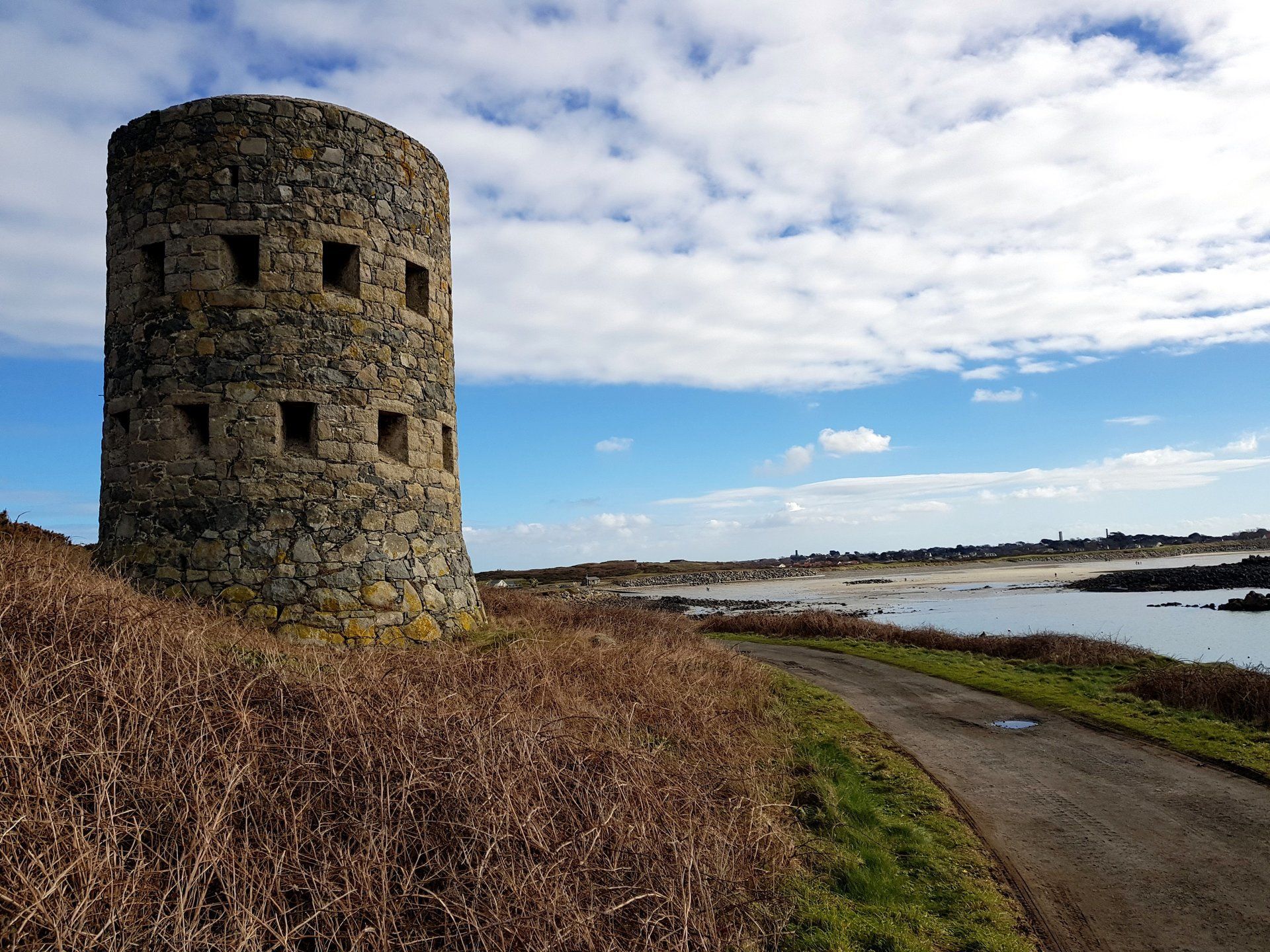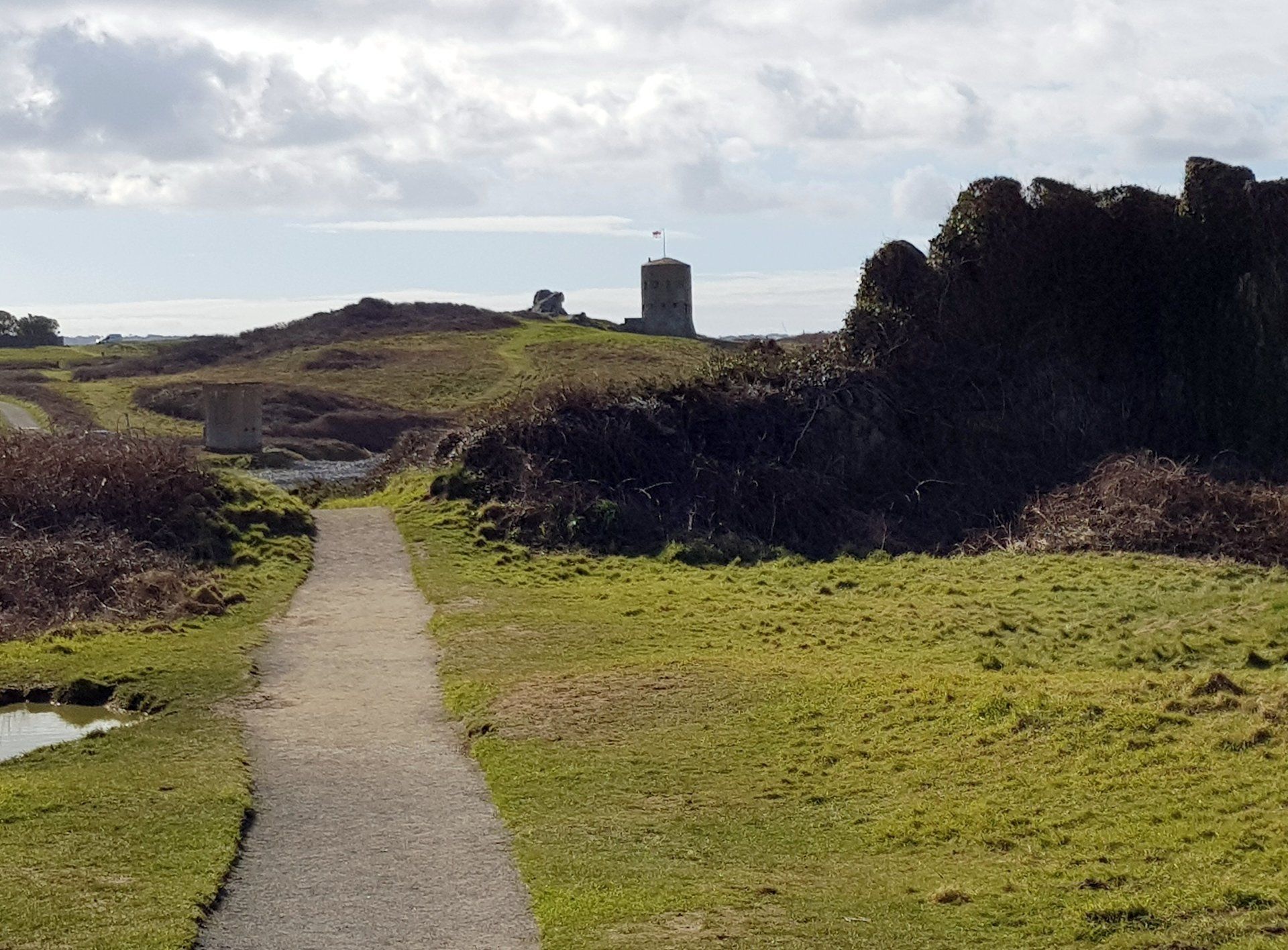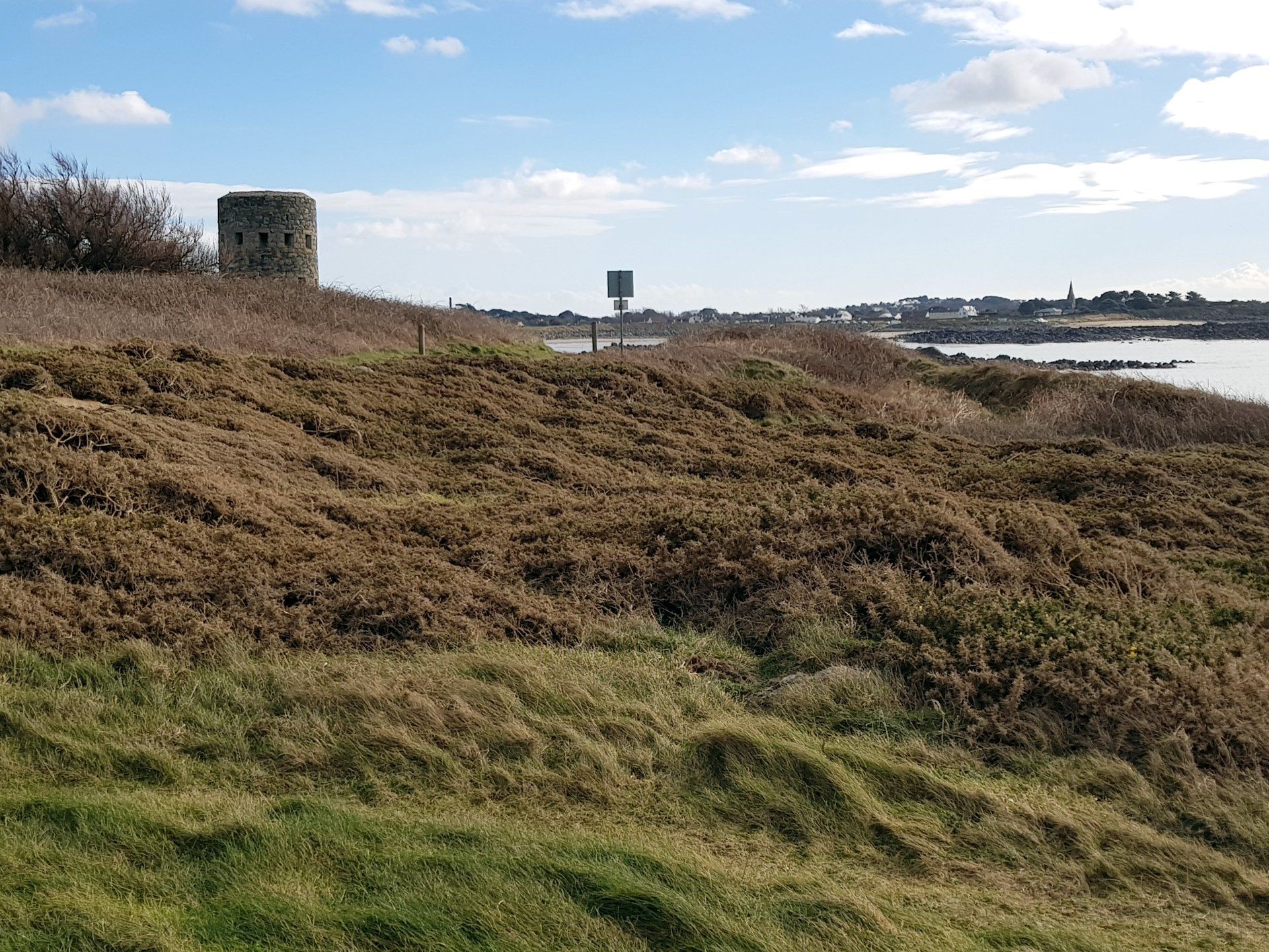 The route is interrupted by Fort Le Marchant, another defence raised from fears of French invasion, mainly in the early 1800’s, now home to the local shooting range. I have a mooch around and take in the views – just making out Alderney in the distance Back on track and the trail heads towards the more civilised Pembroke Bay, but before that I have a stroll up to Loophole Tower No. 5. There were originally 15 of the towers built in the late 1700’s as defence against the French, with 12 remaining to this day. They are an iconic sight in Guernsey (and Jersey, although slightly different in design). I passed the first surviving tower on my January walk (No. 3 at Mont Crevelt) but today I see a total of 7.