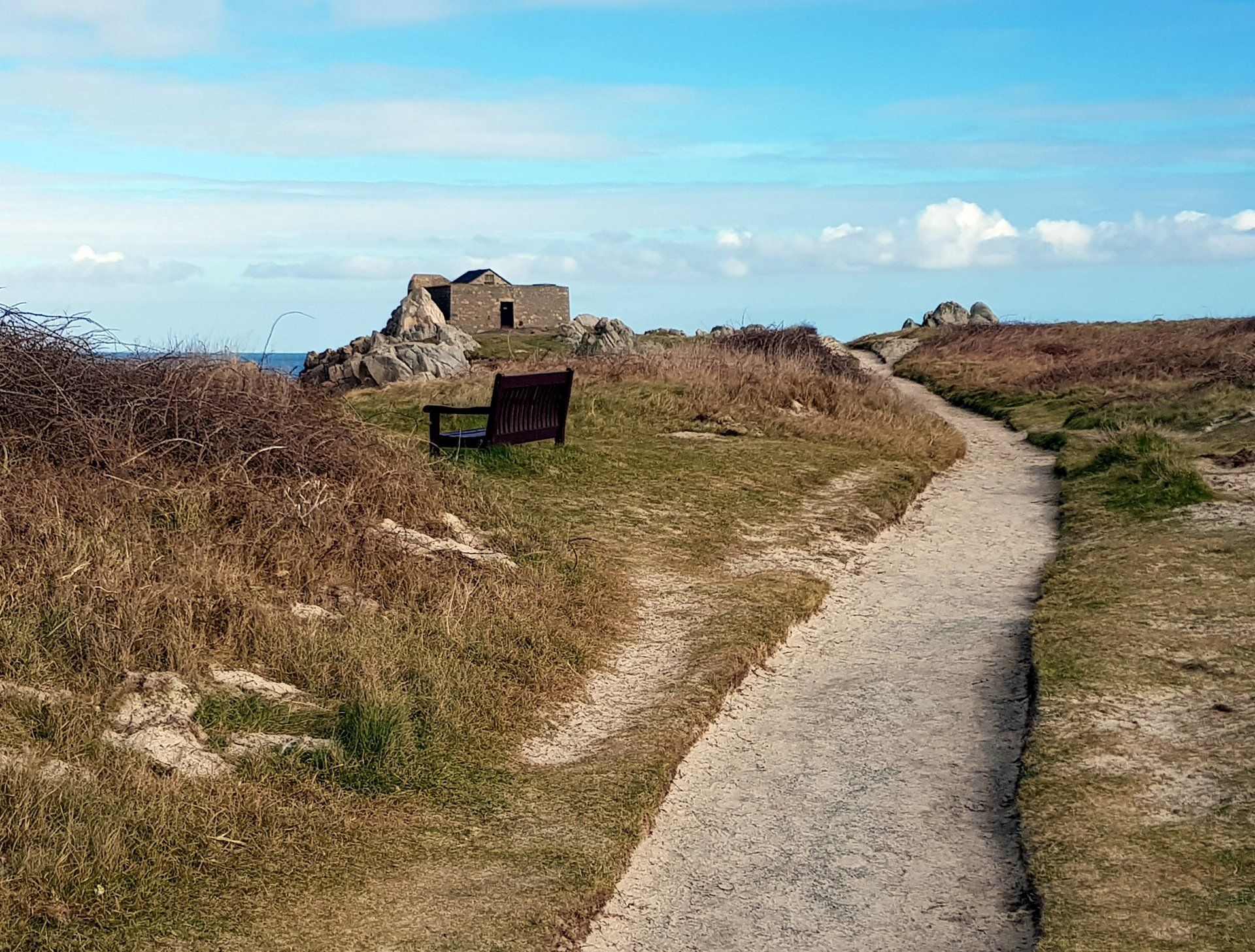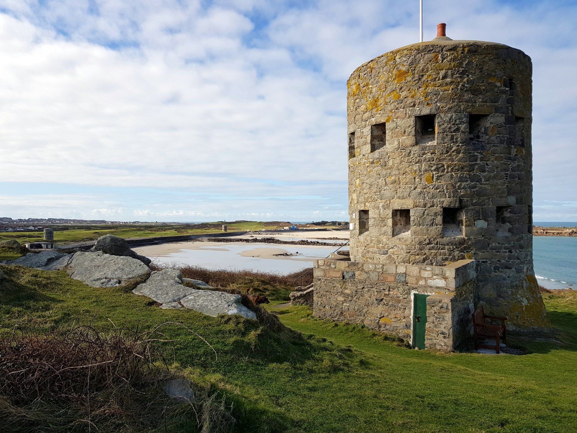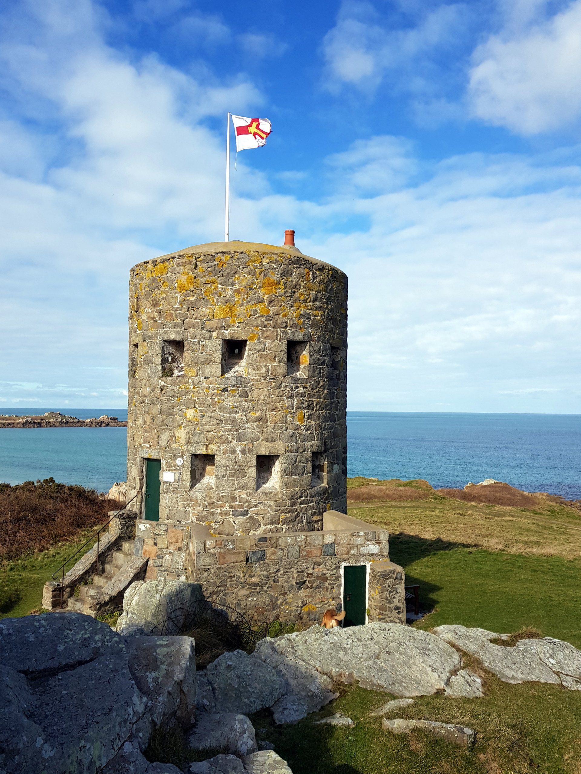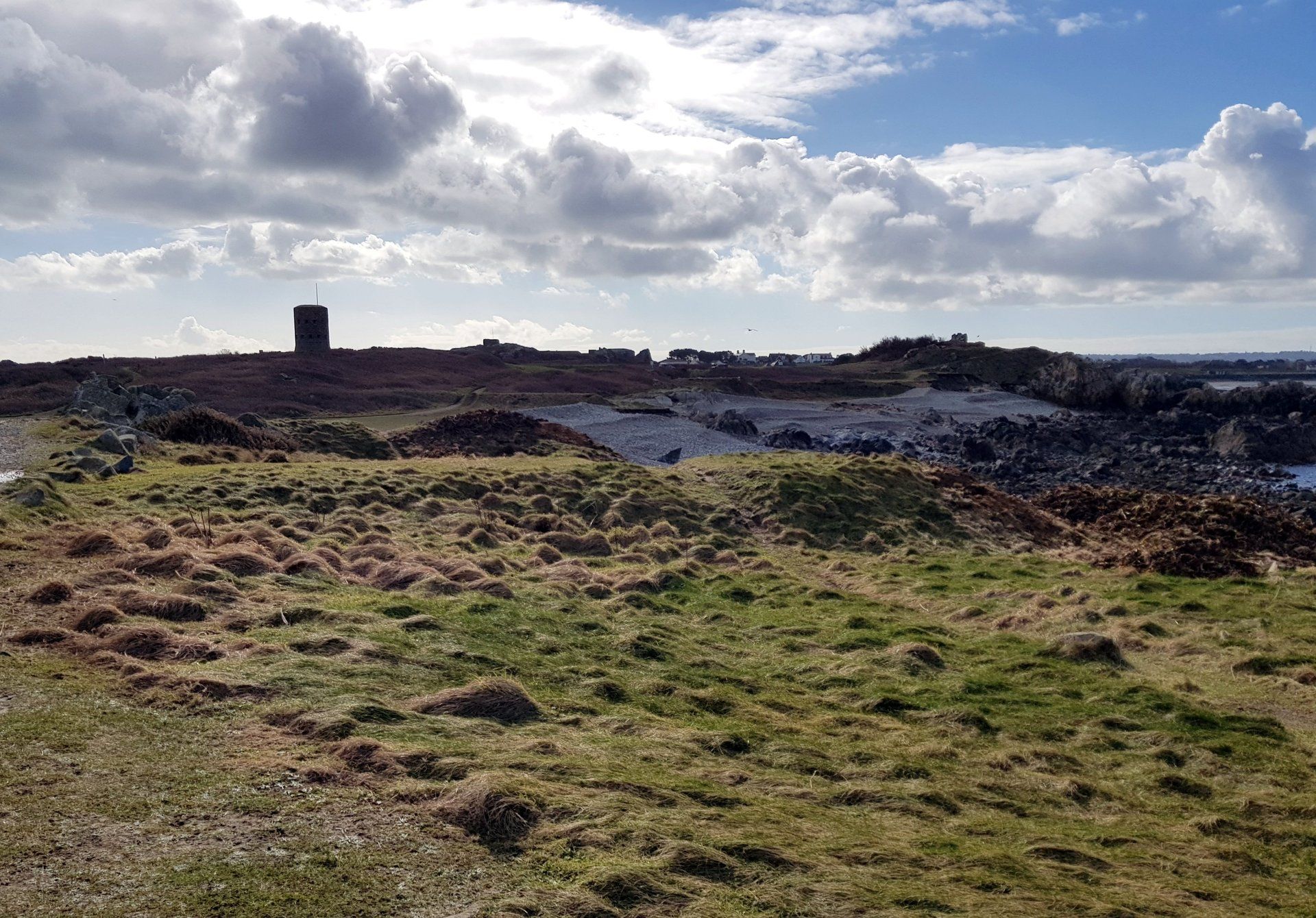 The route is interrupted by Fort Le Marchant, another defence raised from fears of French invasion, mainly in the early 1800’s, now home to the local shooting range. I have a mooch around and take in the views – just making out Alderney in the distance Back on track and the trail heads towards the more civilised Pembroke Bay, but before that I have a stroll up to Loophole Tower No. 5. There were originally 15 of the towers built in the late 1700’s as defence against the French, with 12 remaining to this day. They are an iconic sight in Guernsey (and Jersey, although slightly different in design). I passed the first surviving tower on my January walk (No. 3 at Mont Crevelt) but today I see a total of 7.
