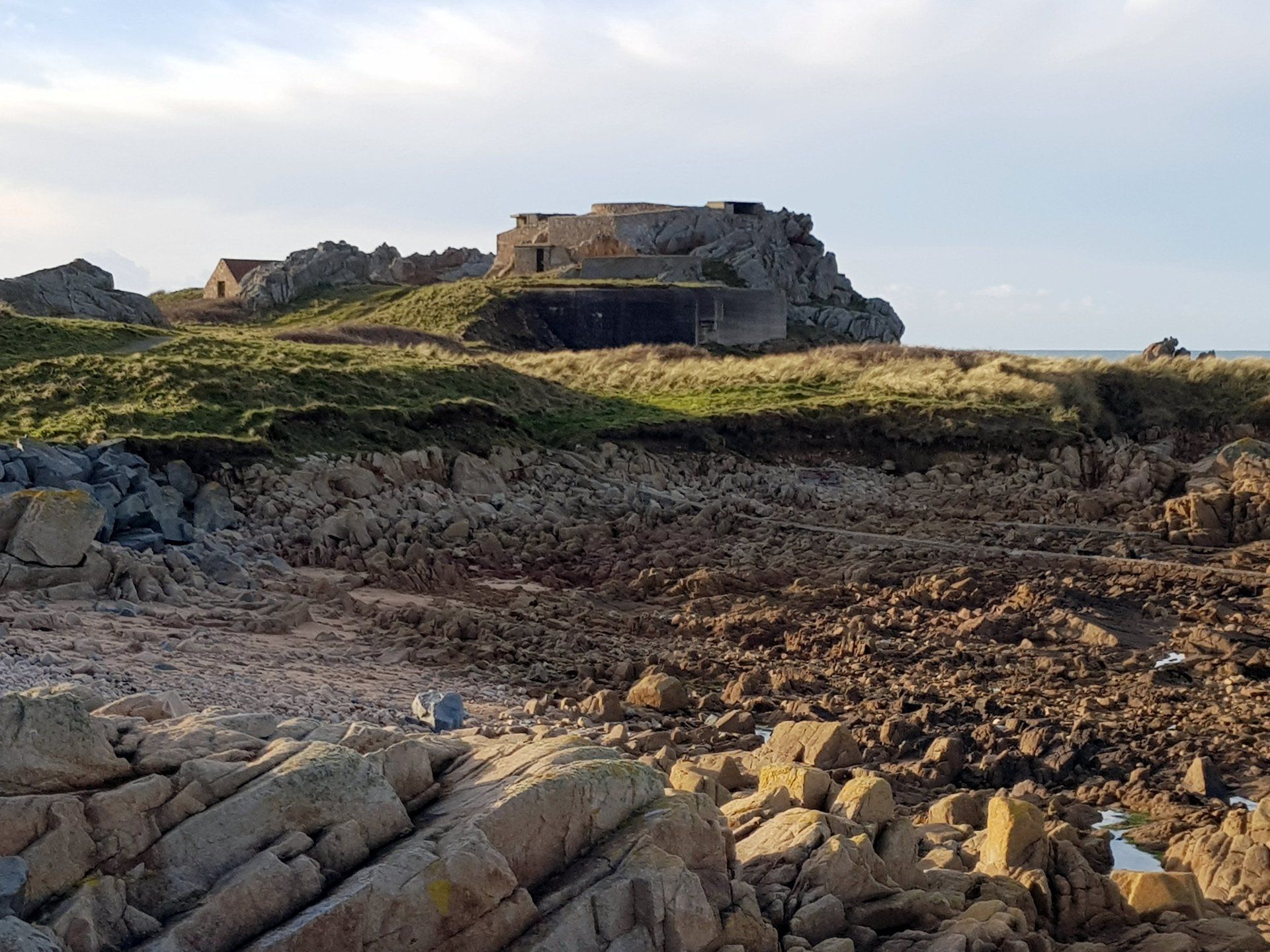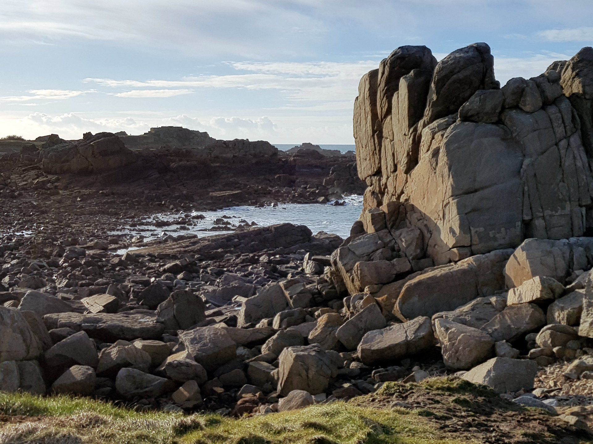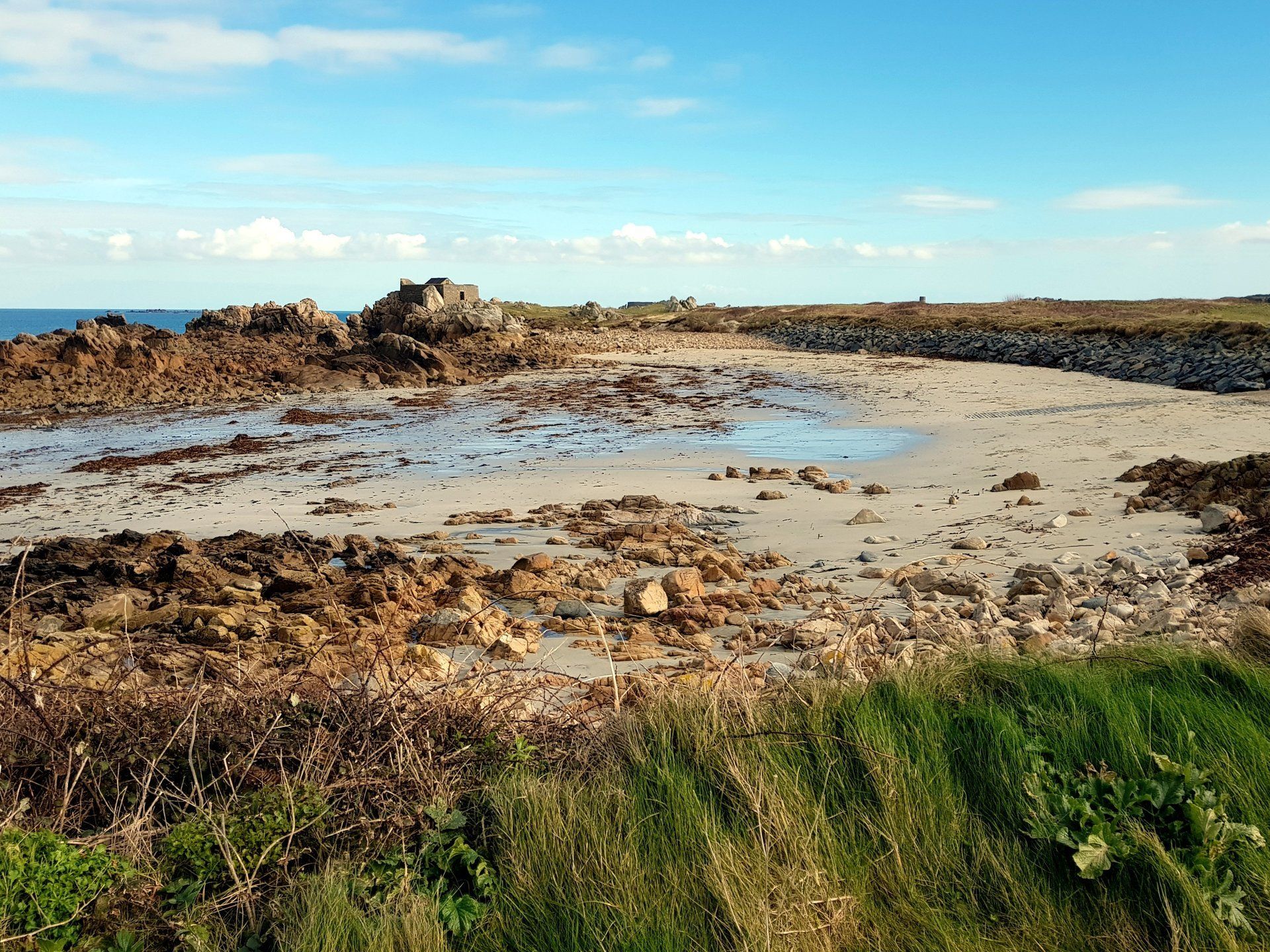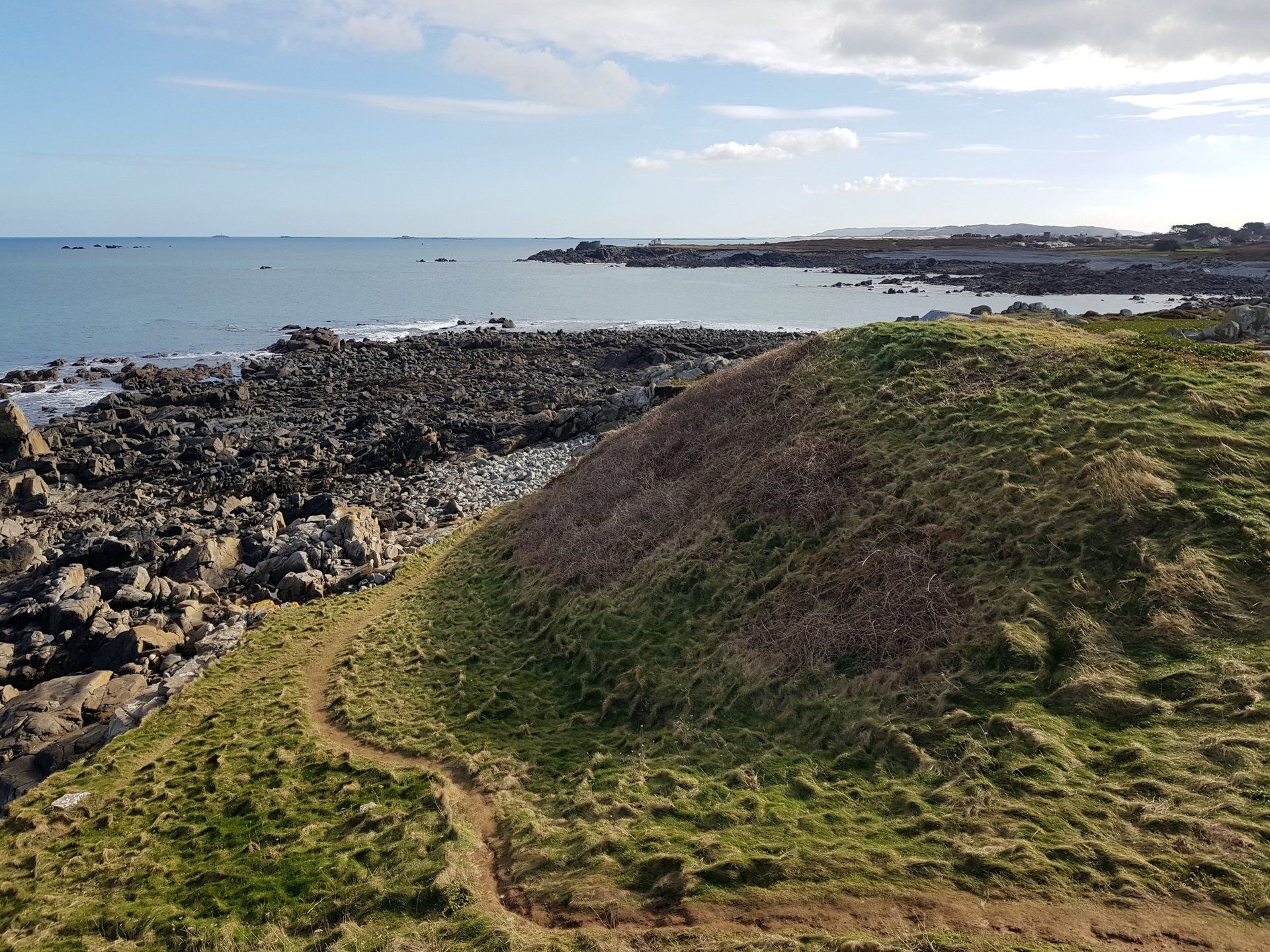 More of the same follows, including Portinfer where on a high tide & wind we can have huge waves rolling in for some spectacular scenes. Not today though, just empty bar a few shallow pools. The rocky shoreline is broken by the sands of Port Soif, another fine beach when the tide is up a bit, then I reach my destination – Grandes Rocques, 10 miles from my starting point. There is no delineation but in my mind I always think of this as the start of the “West Coast” down to the SW corner of the Island One last fort beckons for the day and I have a quick climb around the large Grandes Rocques Battery, from which you have good views for some distance along coastlines in both direction. A last look back to the North and reflection on a very enjoyable stroll. I set off a bit before noon and finished around 16:15 with a break for lunch, so around 3.5 hours active walking, about 10 miles. Nothing too challenging but a good mix, even taking advantage of low tide for a bit of beach trekking, with weather which actually seemed perfect for the moment. Good stuff.