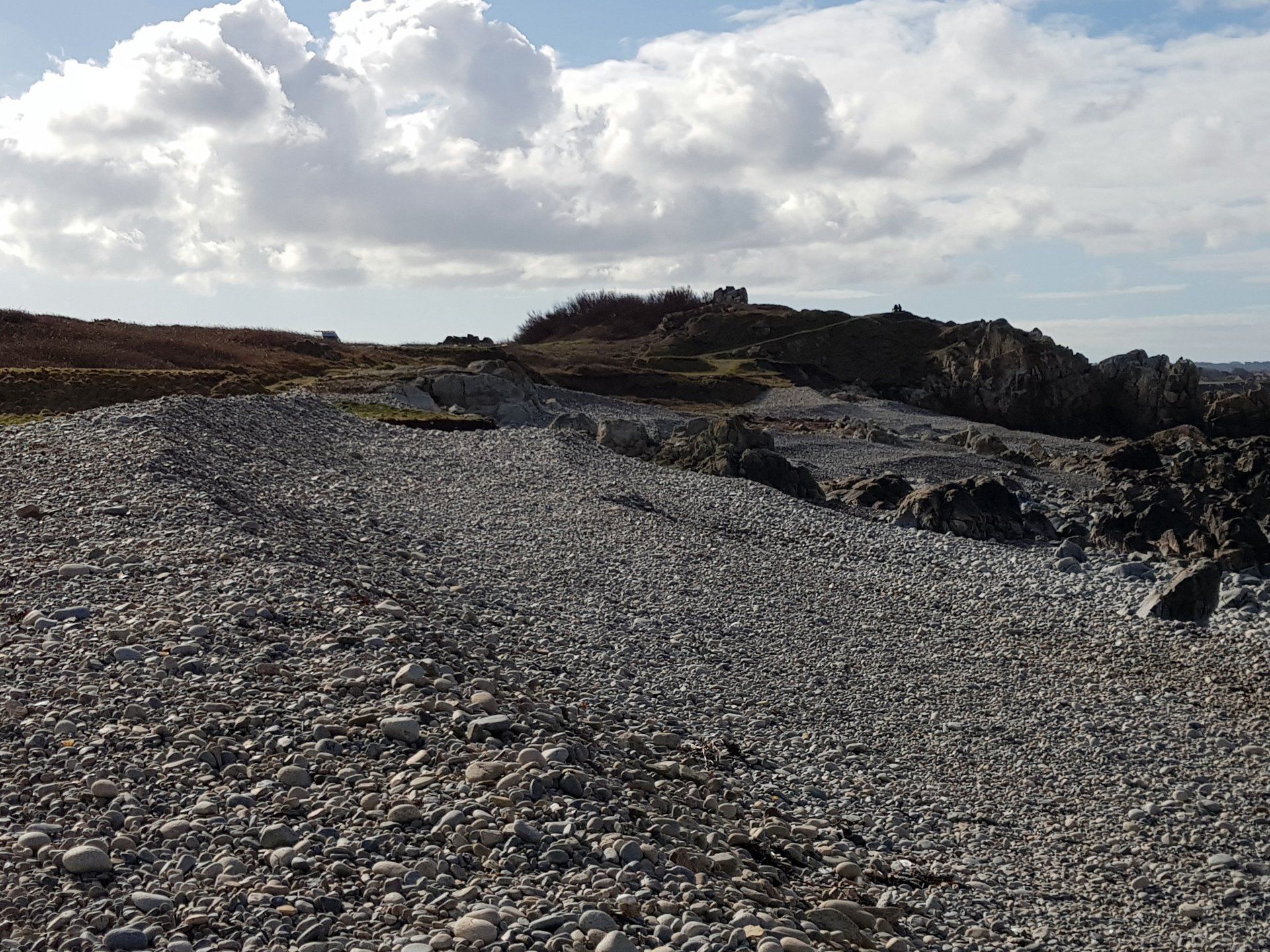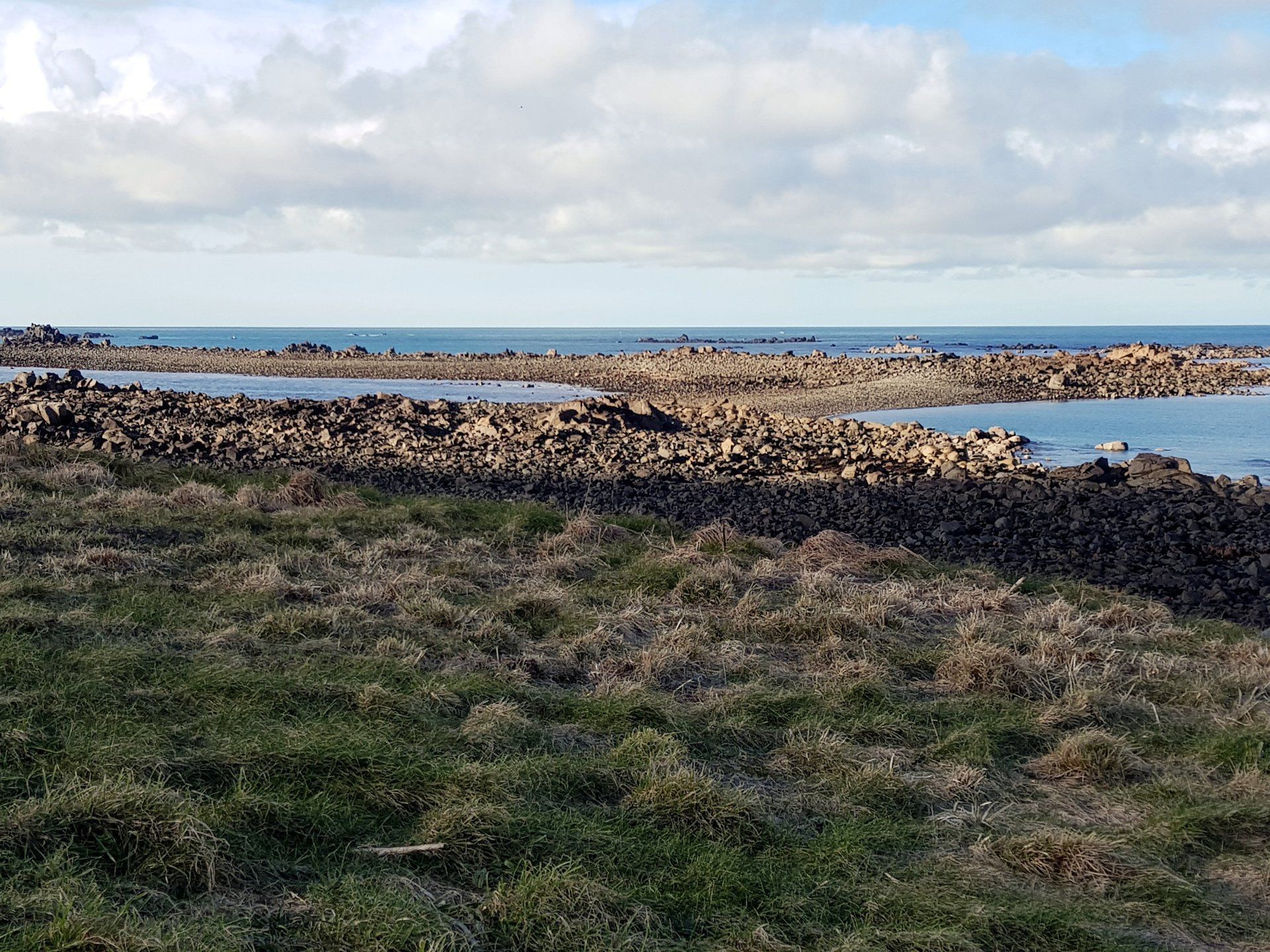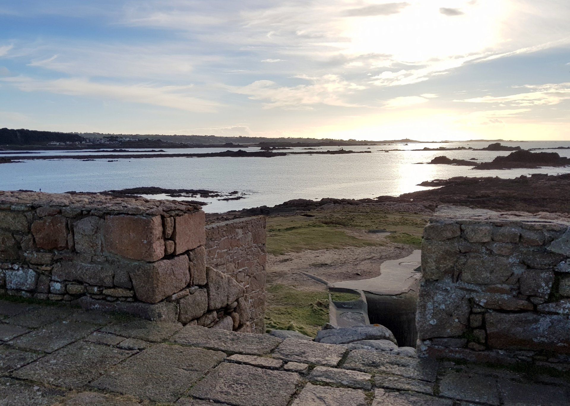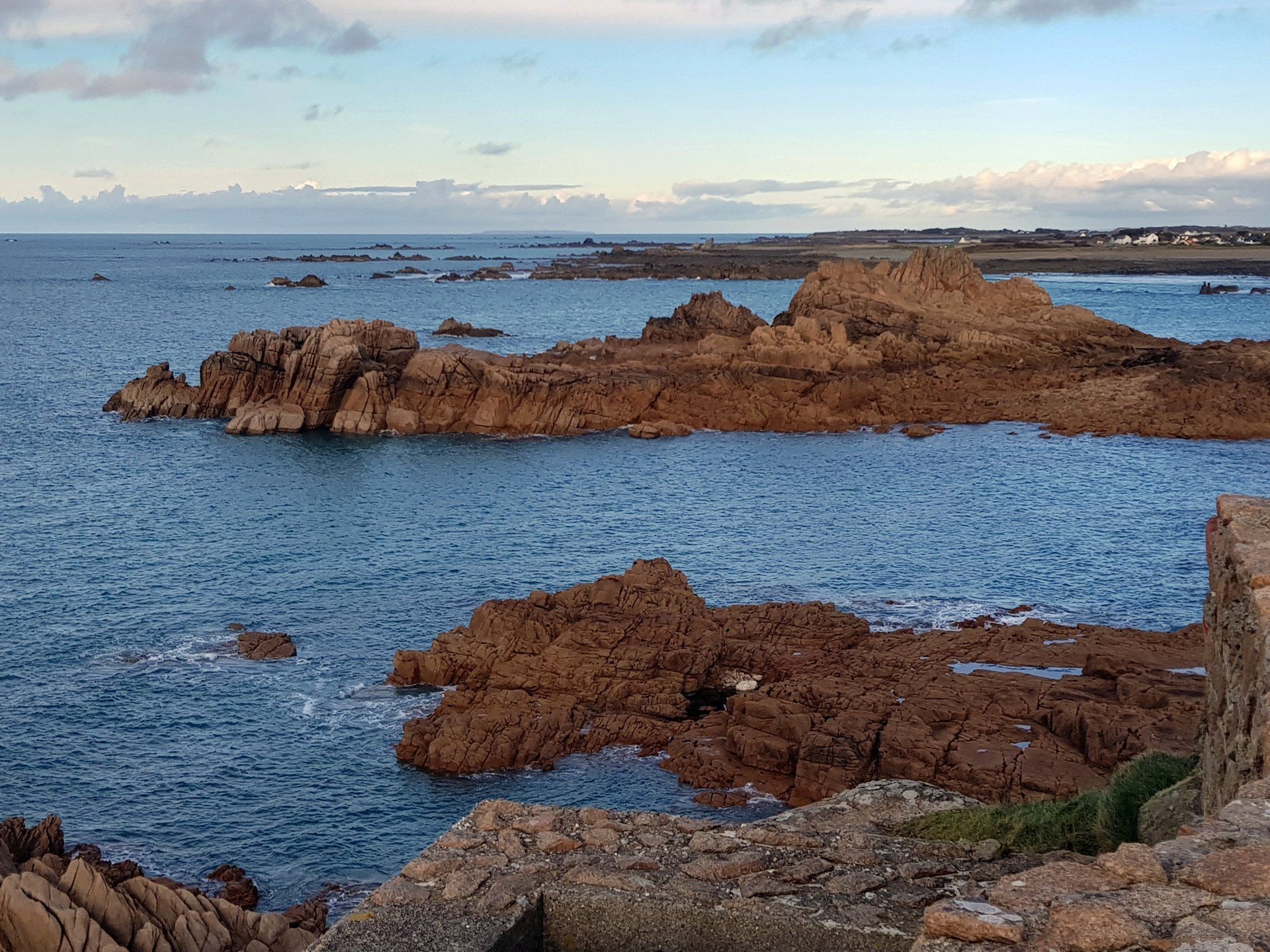 More of the same follows, including Portinfer where on a high tide & wind we can have huge waves rolling in for some spectacular scenes. Not today though, just empty bar a few shallow pools. The rocky shoreline is broken by the sands of Port Soif, another fine beach when the tide is up a bit, then I reach my destination – Grandes Rocques, 10 miles from my starting point. There is no delineation but in my mind I always think of this as the start of the “West Coast” down to the SW corner of the Island One last fort beckons for the day and I have a quick climb around the large Grandes Rocques Battery, from which you have good views for some distance along coastlines in both direction. A last look back to the North and reflection on a very enjoyable stroll. I set off a bit before noon and finished around 16:15 with a break for lunch, so around 3.5 hours active walking, about 10 miles. Nothing too challenging but a good mix, even taking advantage of low tide for a bit of beach trekking, with weather which actually seemed perfect for the moment. Good stuff.
