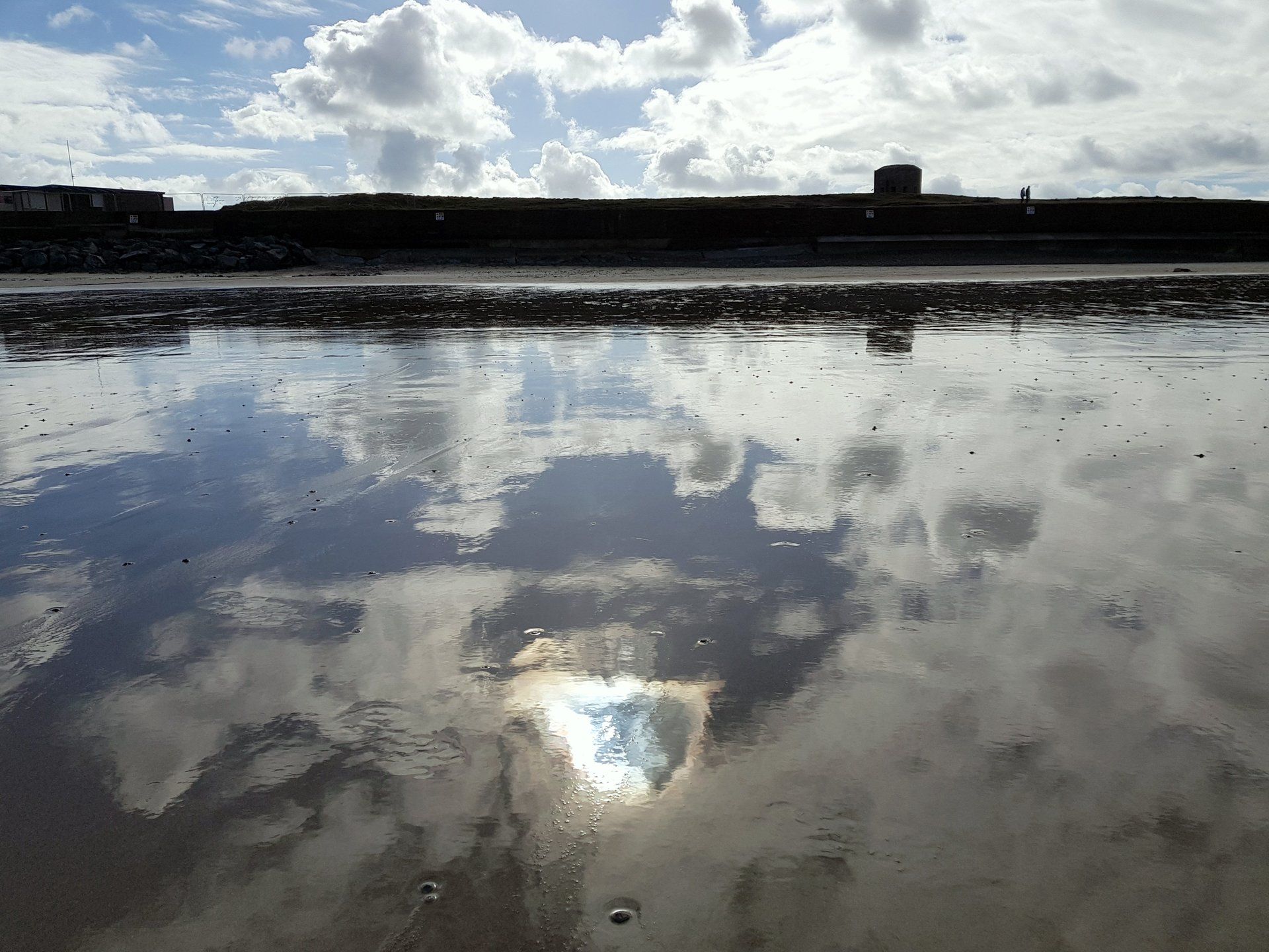 The tide is out so the bay is fully exposed. Guernsey has huge tidal range of up to nearly 10 metres, changing from low to high tide roughly every 6 hours – resulting in a constantly changing environment and view. The time is now around 14:30 so just past low tide (today 1.5 metres at 13:58) with a high tide of 8.9 metres due at 19:54. To me the scene is always better at high tide, however, the variety is what keeps it fresh. The empty bay gives a different perspective and an opportunity to walk across I do that and splish, splash along the sands, passing the grounded boats, making my way across to Rousse kiosk and pier. There seem a lot of people around and I overhear someone being interviewed by the Guernsey Press about a beach cleaning day taking place, volunteers picking up the detritus that accumulates – that explains the people!