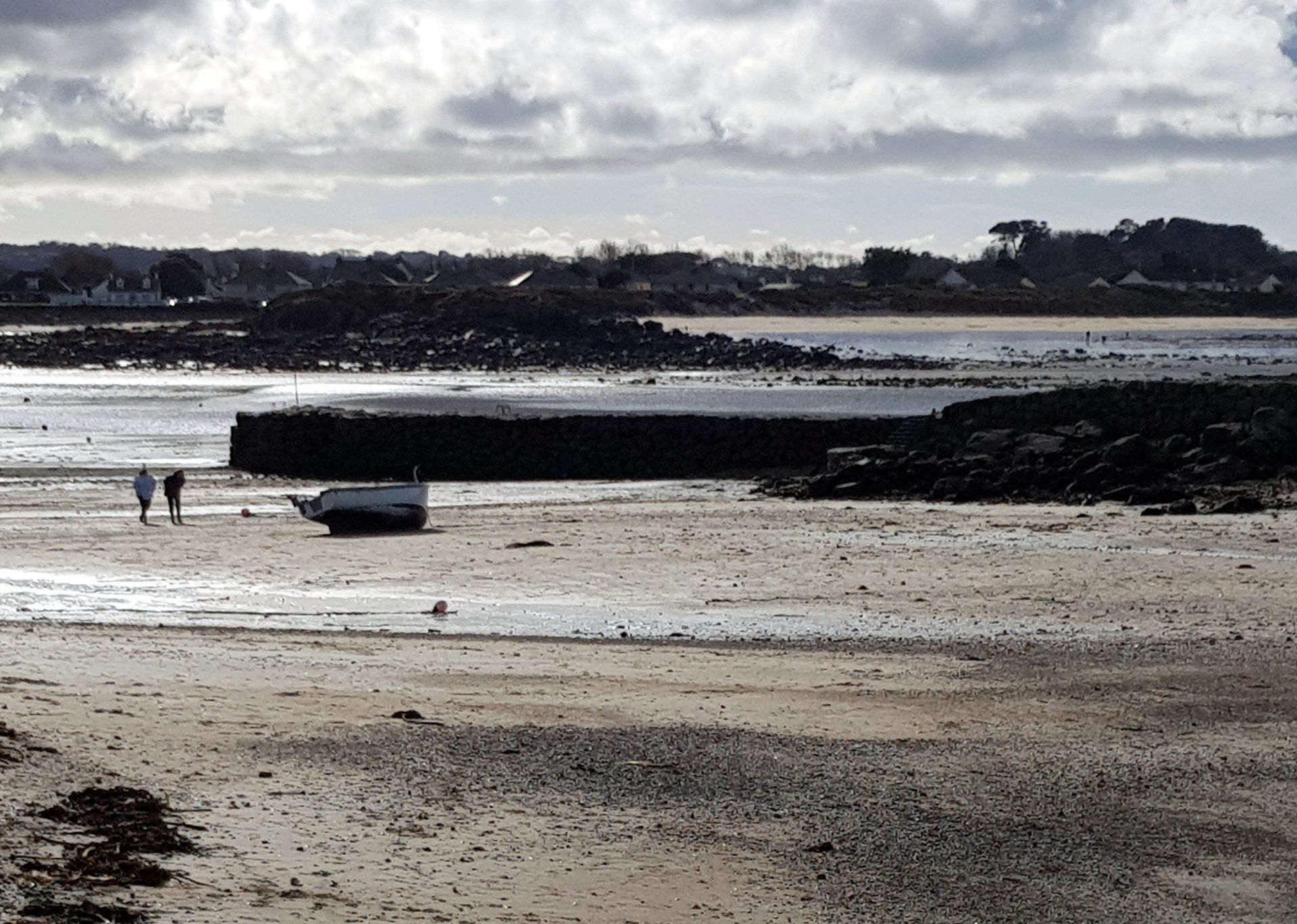 I pass through the wall and go down on to the sand and cut across the bay. The retreating sea has left the sand glistening in the sun and throws up interesting reflections. No doubt a good photographer could make something of this – my efforts fail to impress! Back on the path I return to the wilder side, then moving swiftly past the very un-scenic, but thankfully soon to close landfill site, I round Chouet headland and start a new variant of the walk – the more sheltered bays that are actively in use.