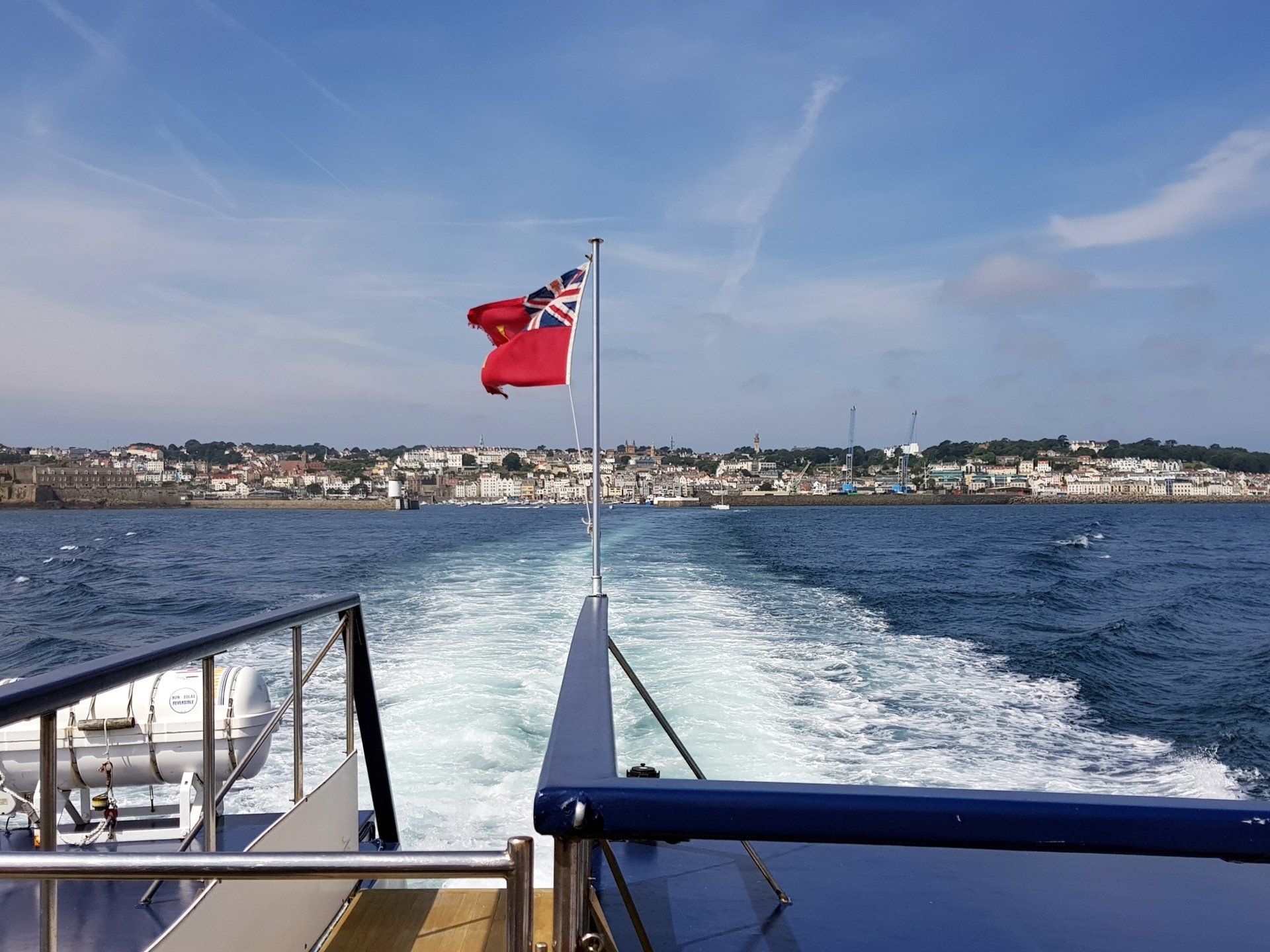 We make our way back around to the harbour, by this time dry, so stroll on to Rosaire Steps to await the return boat. On this trip we stand at the stern so can watch Herm and Jethou slowly get left behind as we motor back to Guernsey.