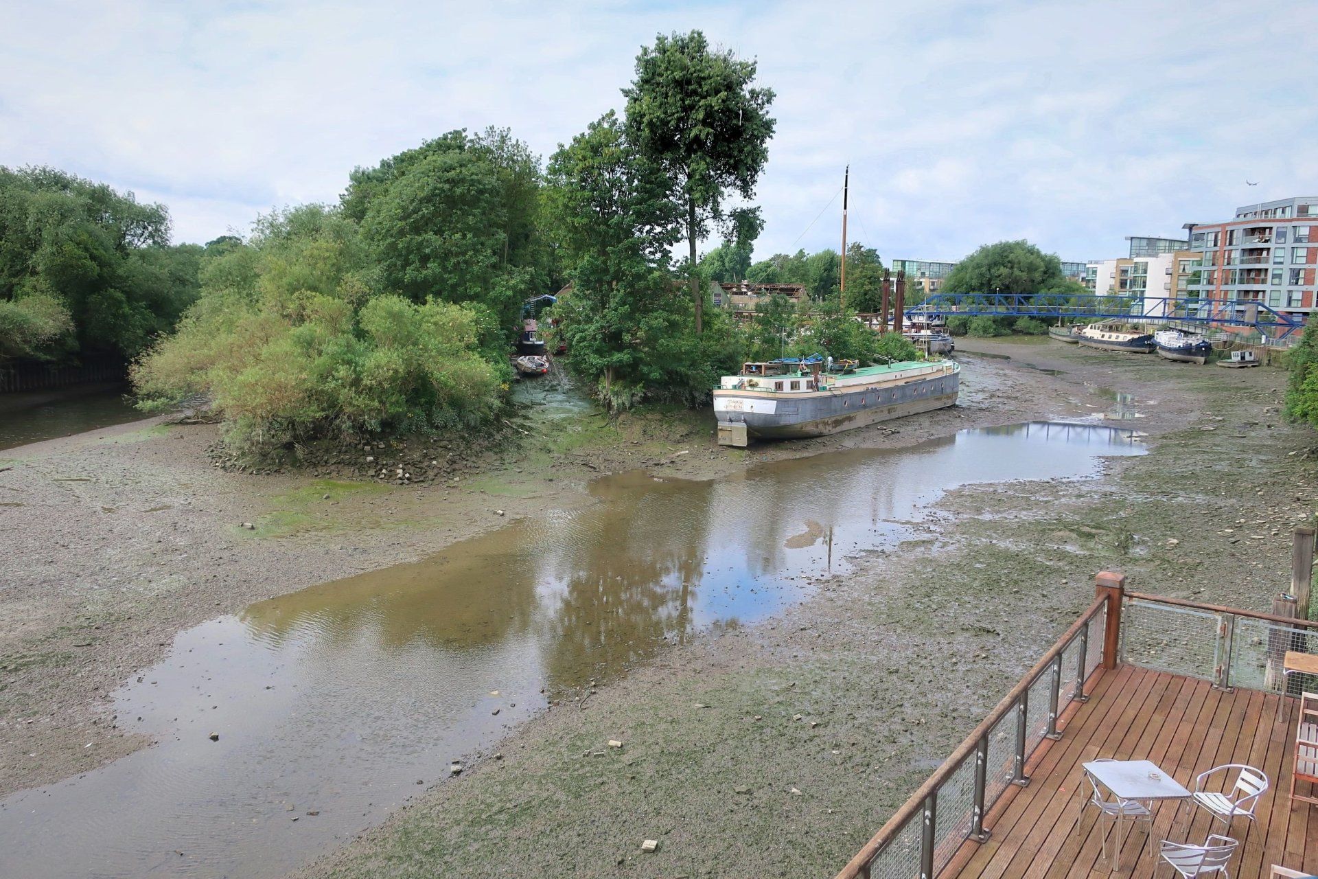 Having fuelled up with a full English breakfast I take the short Tube ride and find my way back to Kew bridge, but remain on the North side and start my walk in the warm and pleasant weather. The river here is divided by an ‘ait’ (a long, narrow river island) and there is little water and a lot of mud at these tidal conditions on this side. Boats crowd the area, lots of birds saunter around and there is detritus scattered around the mud, but it all makes for an interesting scene