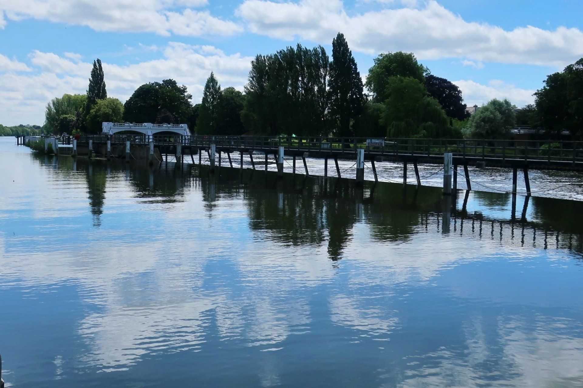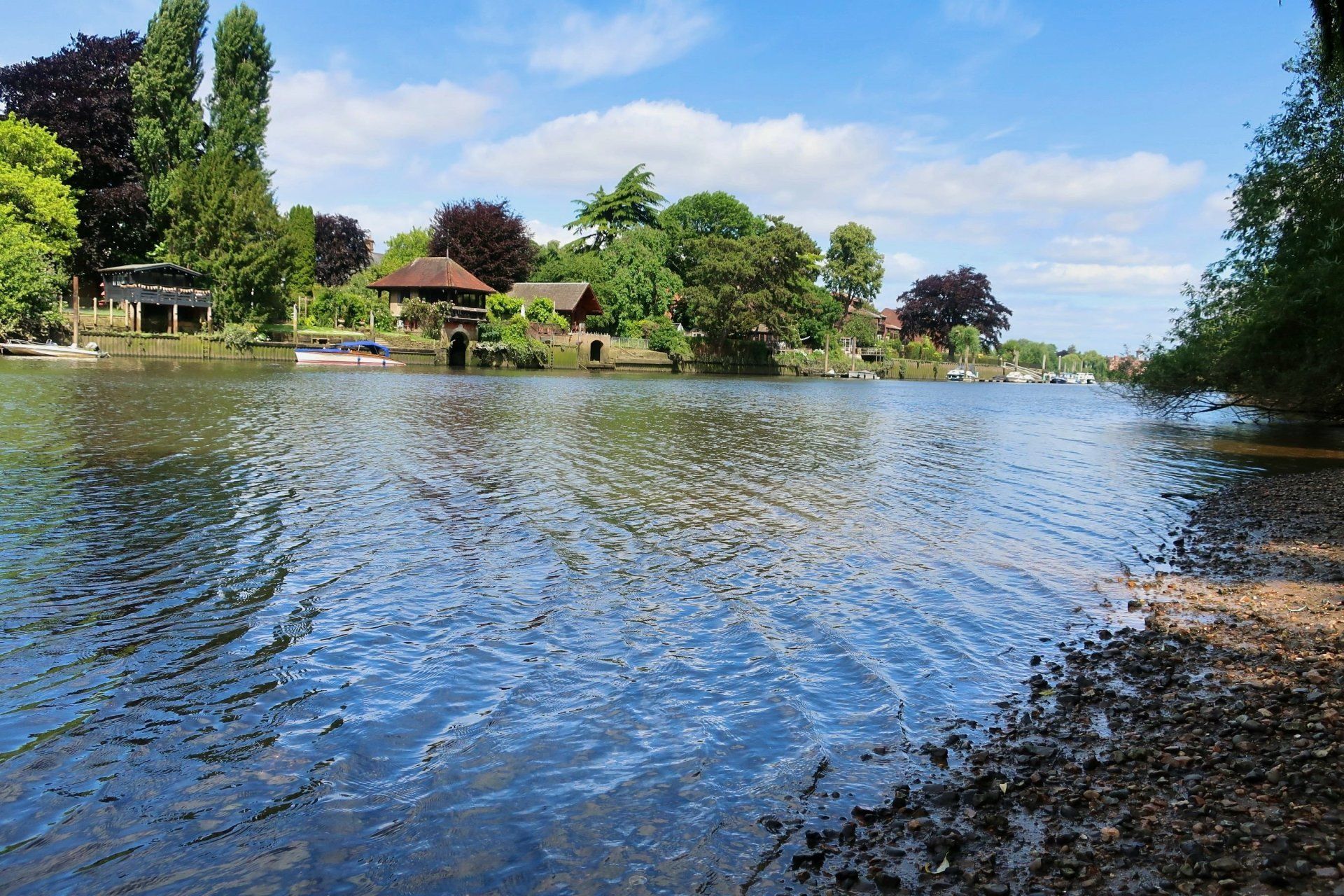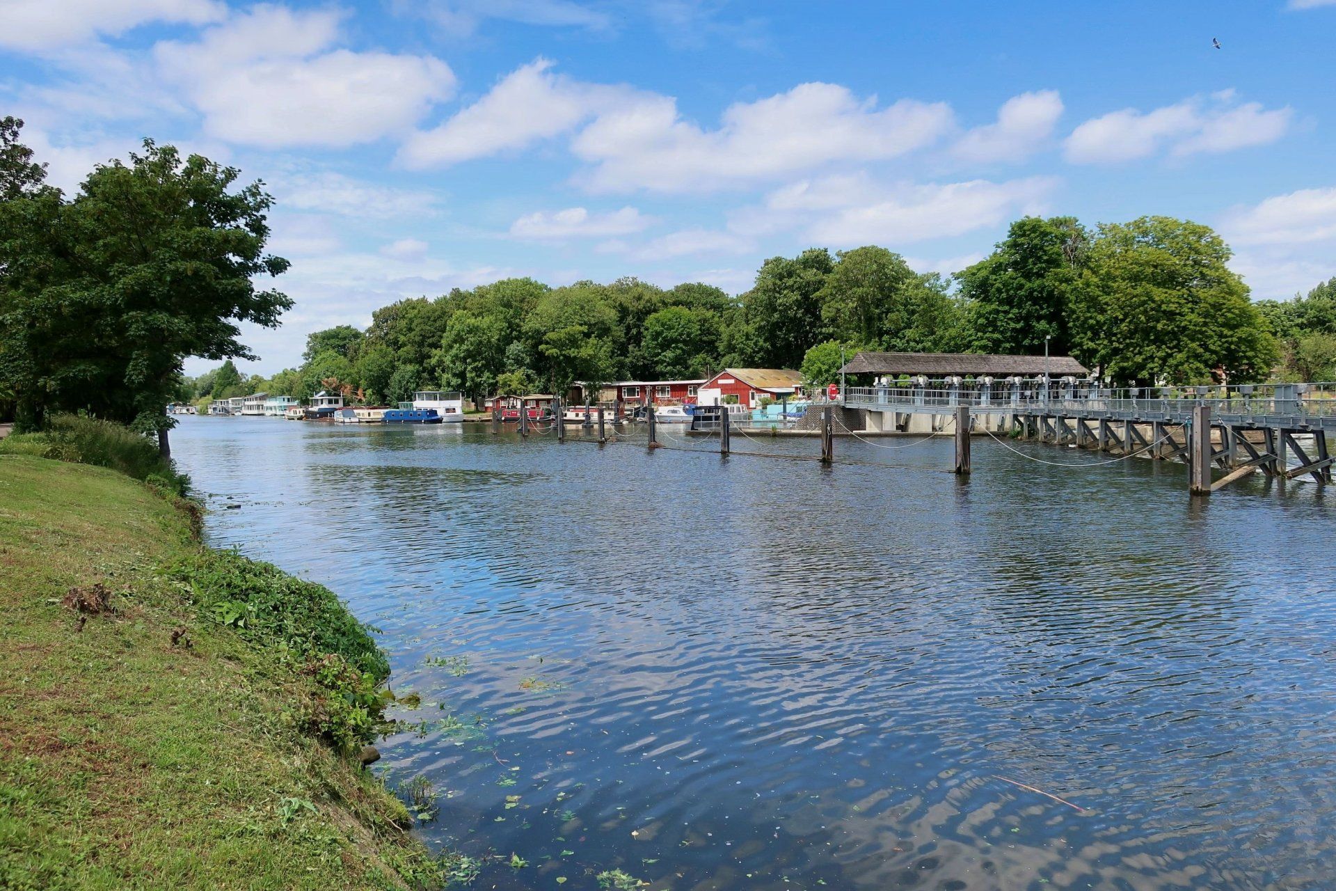 I cross to the South bank over the footbridge at Richmond Lock, an arty structure with a practical purpose of regulating water levels in the upper Thames. This crossing takes me into a different environment, the more refined area of Richmond waterfront, then a general rural setting which continues for much of the day – a natural path following the river bank, often looking over to residential on the other bank. These are river-front houses, some quite large, many with their own dock and moored boat. Very nice!