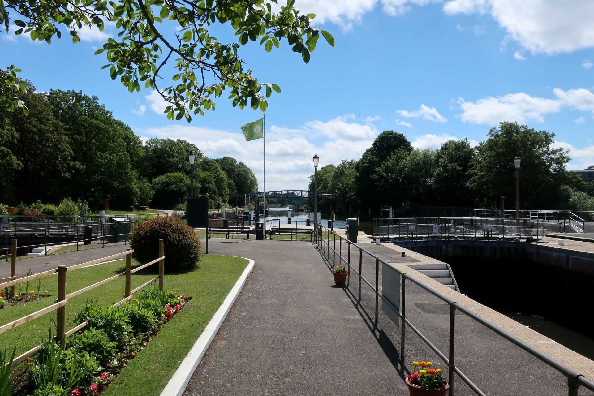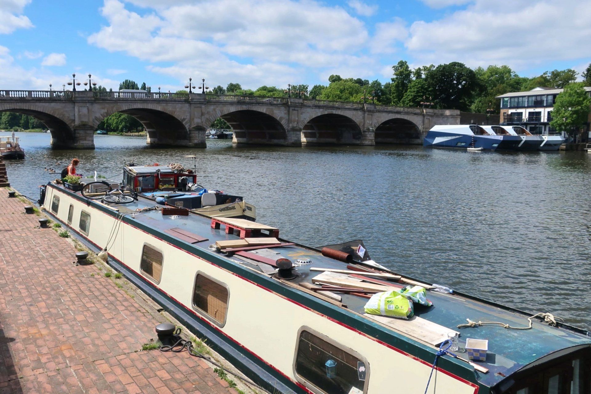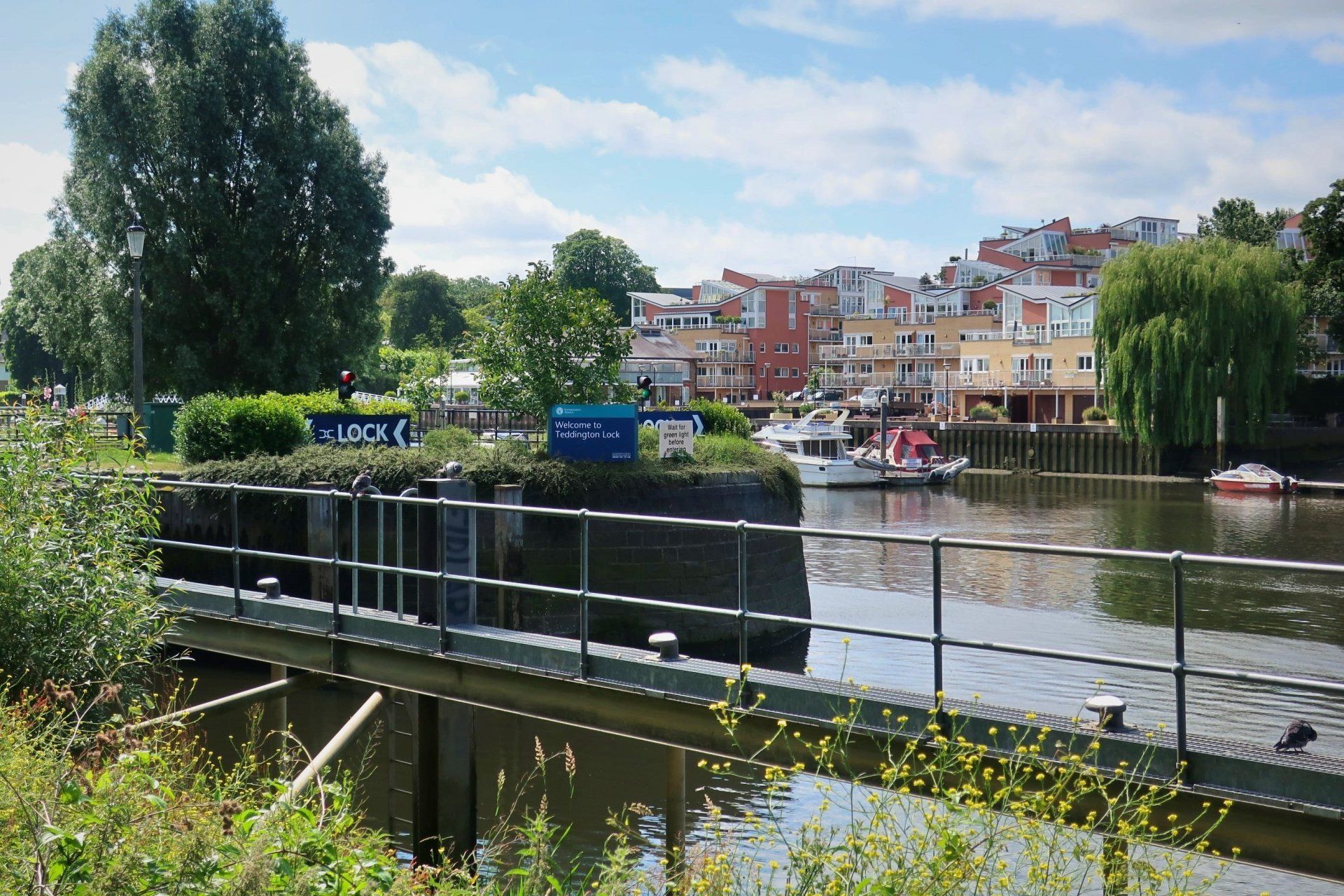 Teddington Lock appears, this a point of significance for the Thames as it marks the end of the tidal river, from here the water level is controlled. I stop here for a break and enjoy a loll in the sun, then continue on through to the next feature point at Kingston, where it is necessary to cross the bridge to the North bank