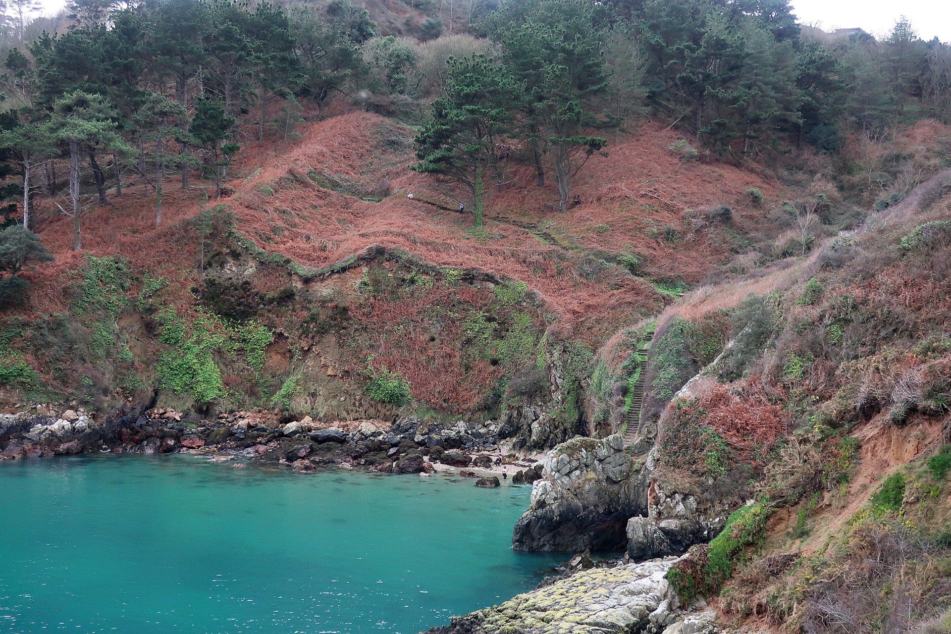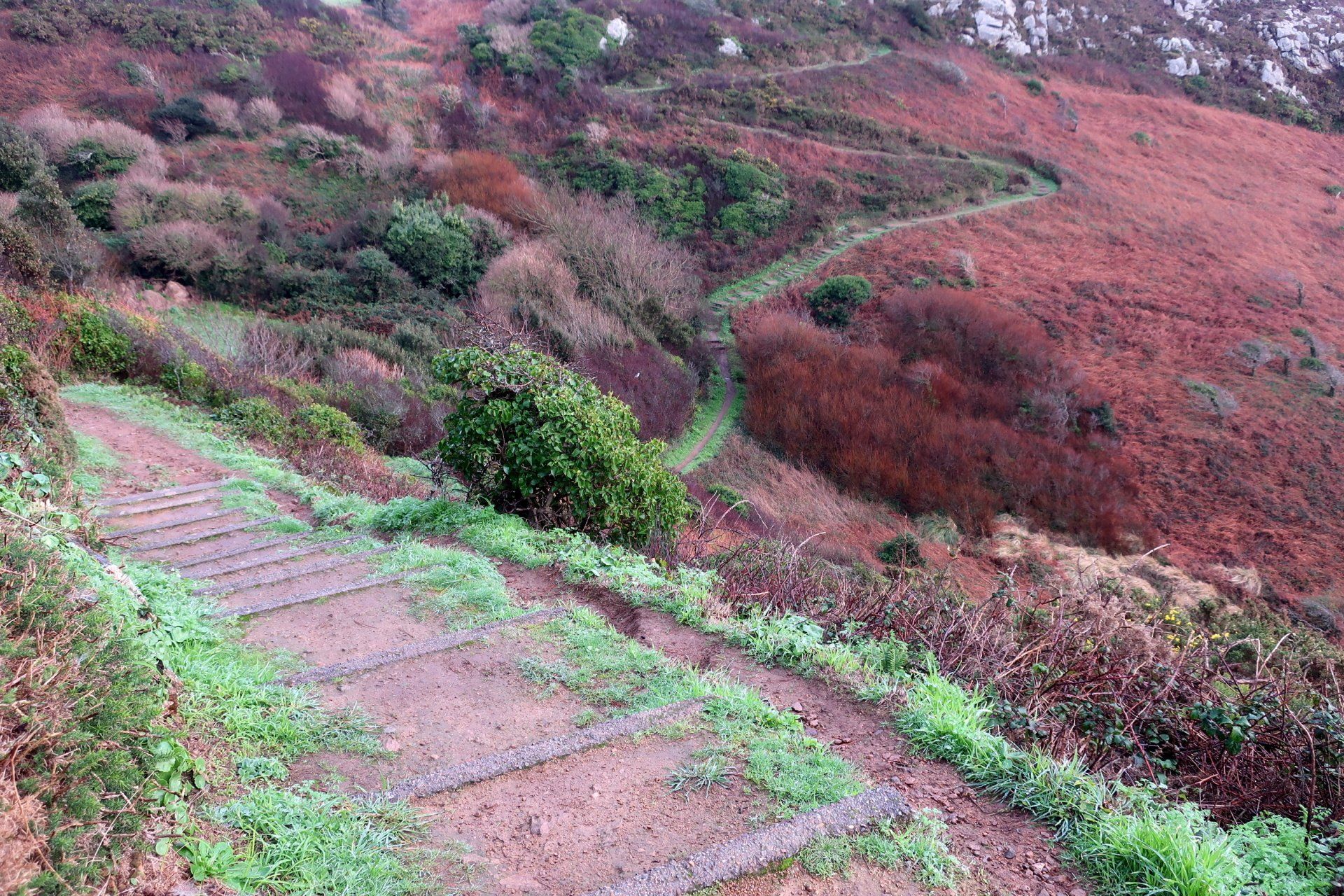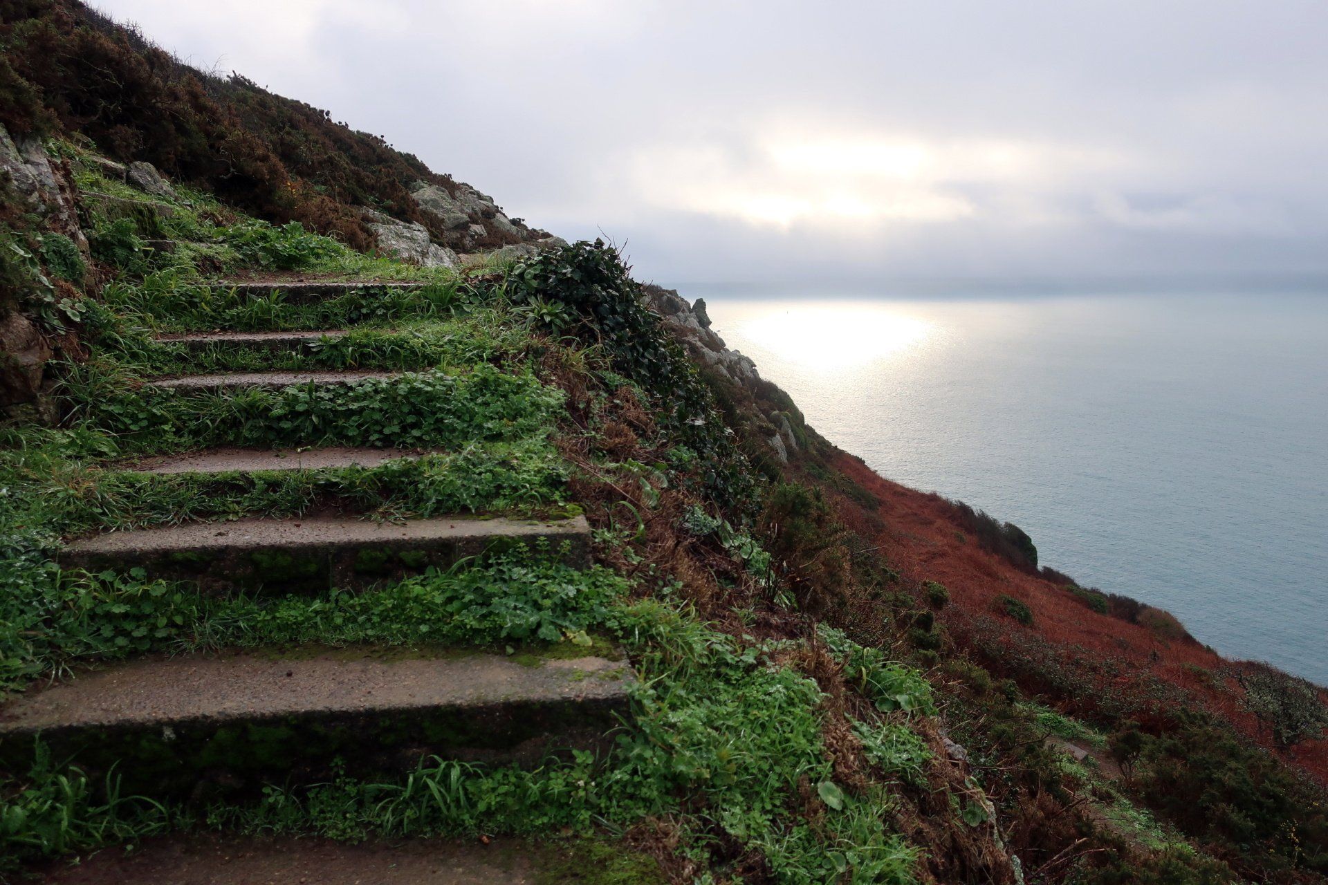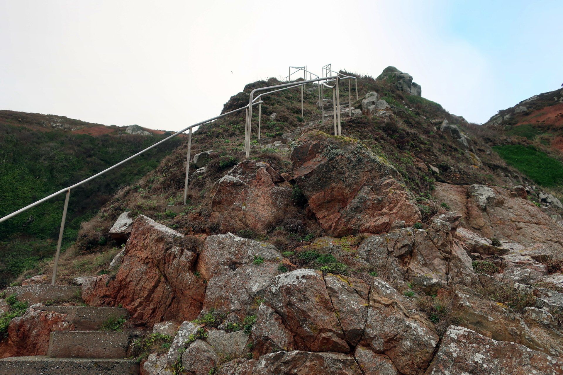 Returning, I huff and puff around the headland to Jerbourg and then down more steps, detouring briefly to visit a little white building perched at the are end of the headland – home to one of the Islands fog horns – thankfully not operating today, otherwise I would need my earplugs!.