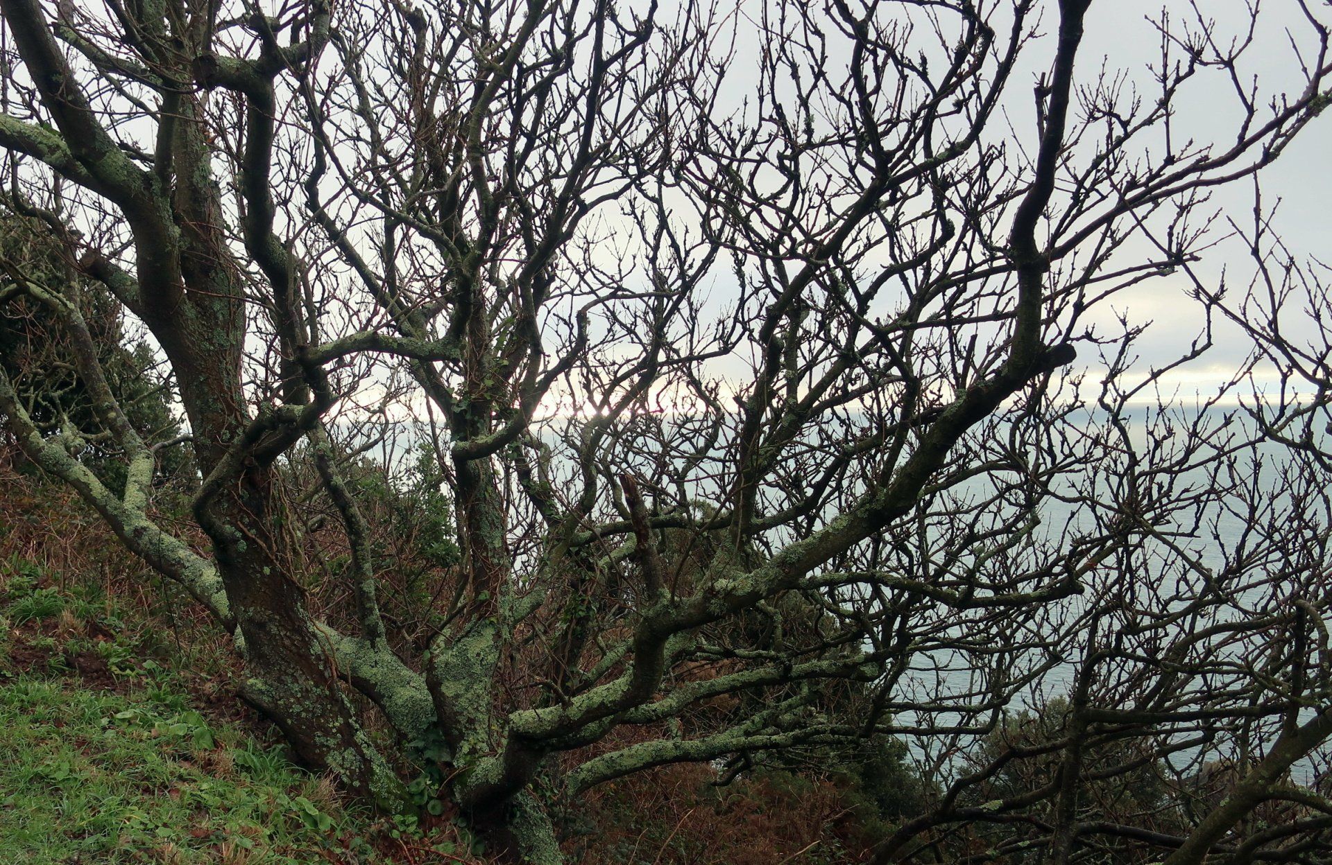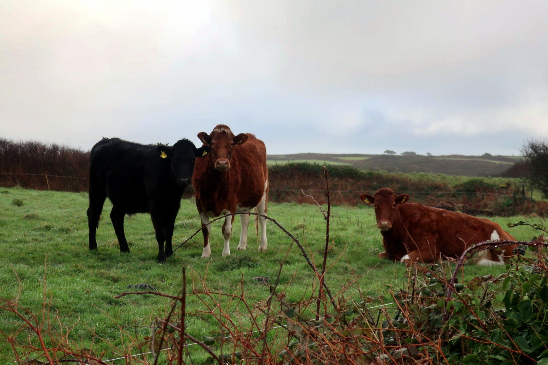 I park at the top of Petit Bot hill and walk down the road to the bay, where I finished in November. I take a peak at the beach, noting the tide is high and covering the sand, but overall the impression is one of greyness. The tea rooms are closed and there is not another soul in sight. In fact, this solitude continues for a while, other than a couple of cows obligingly staring at the camera for photo shoot a little further on.