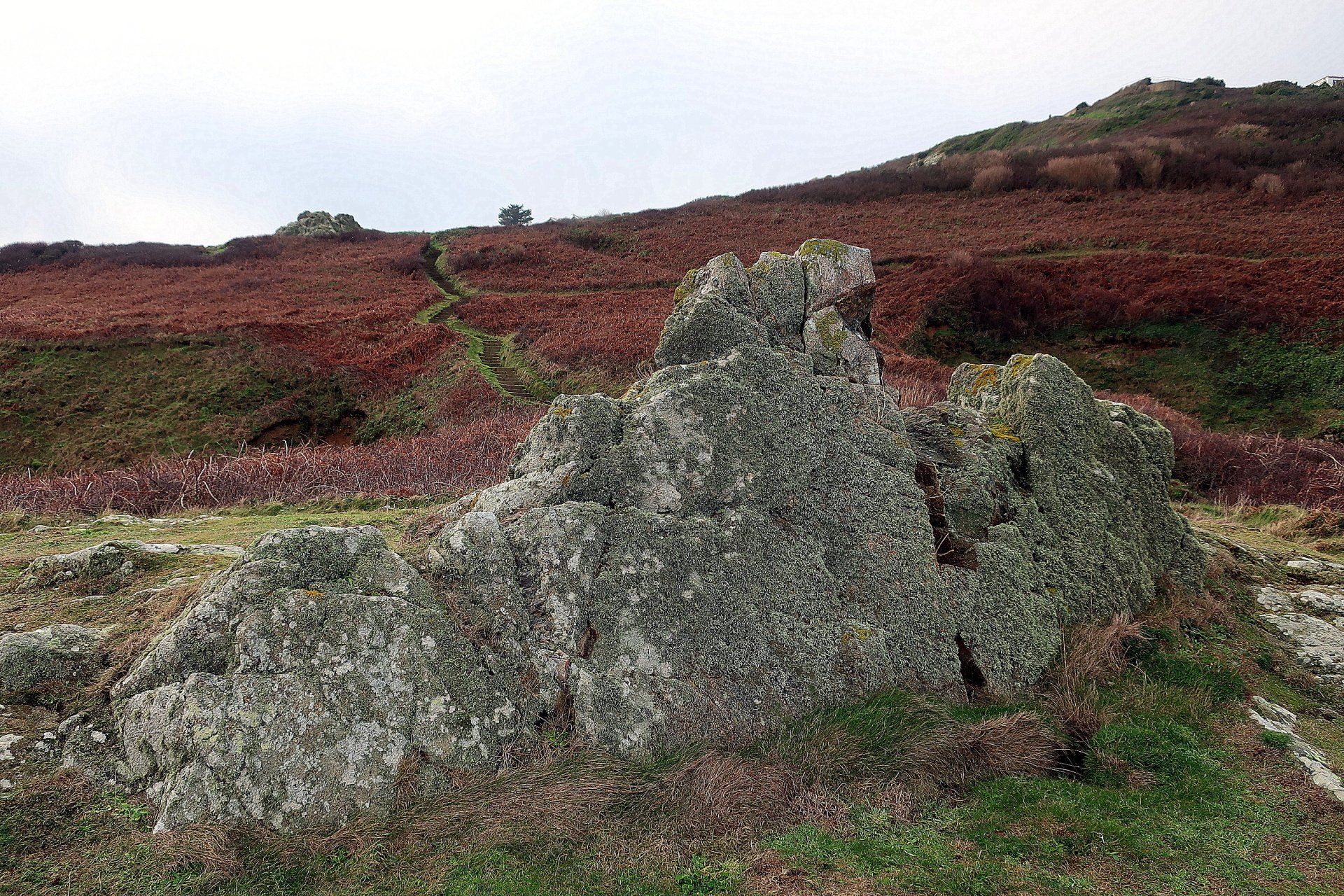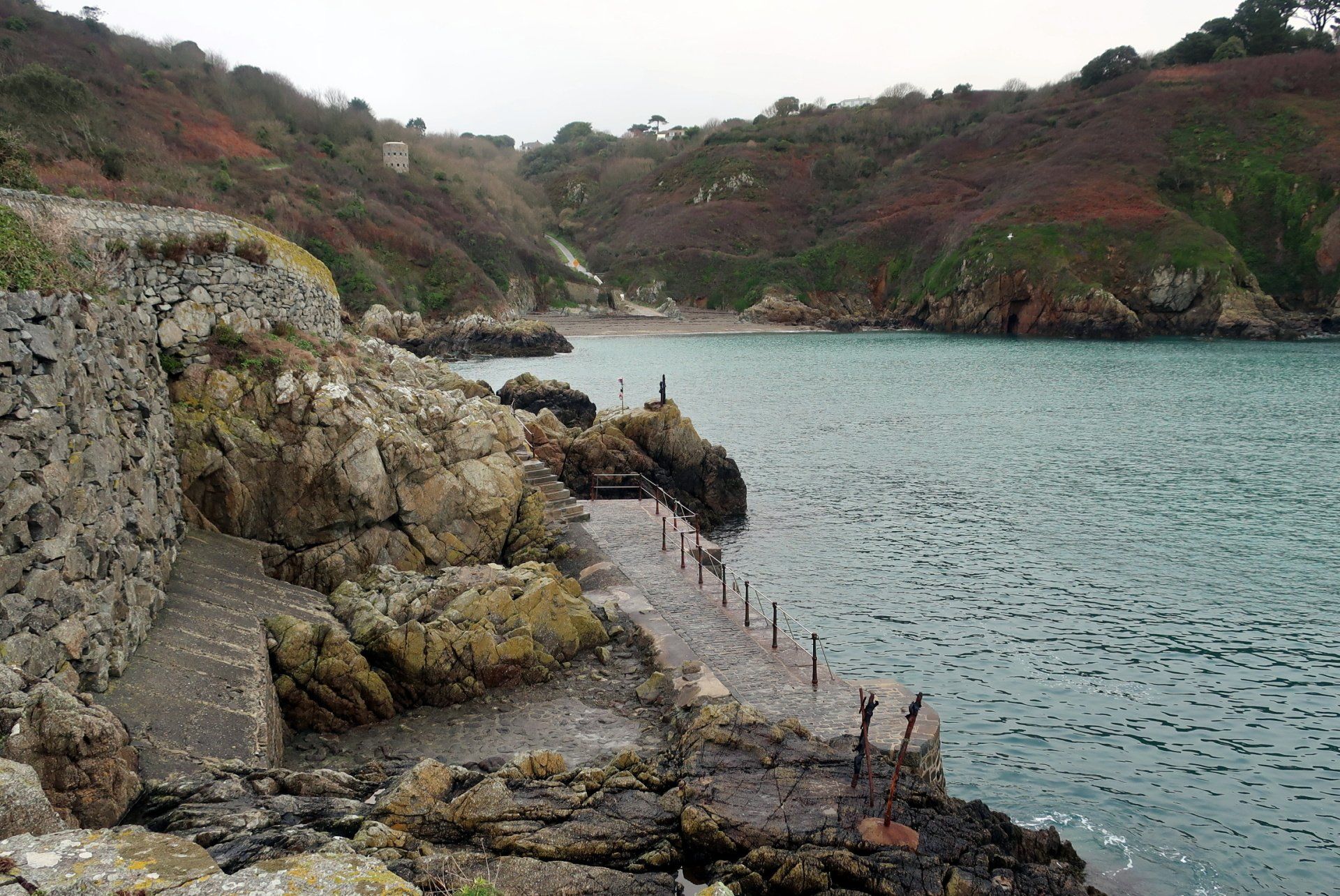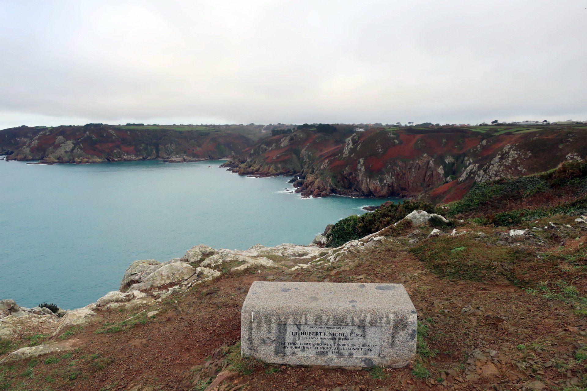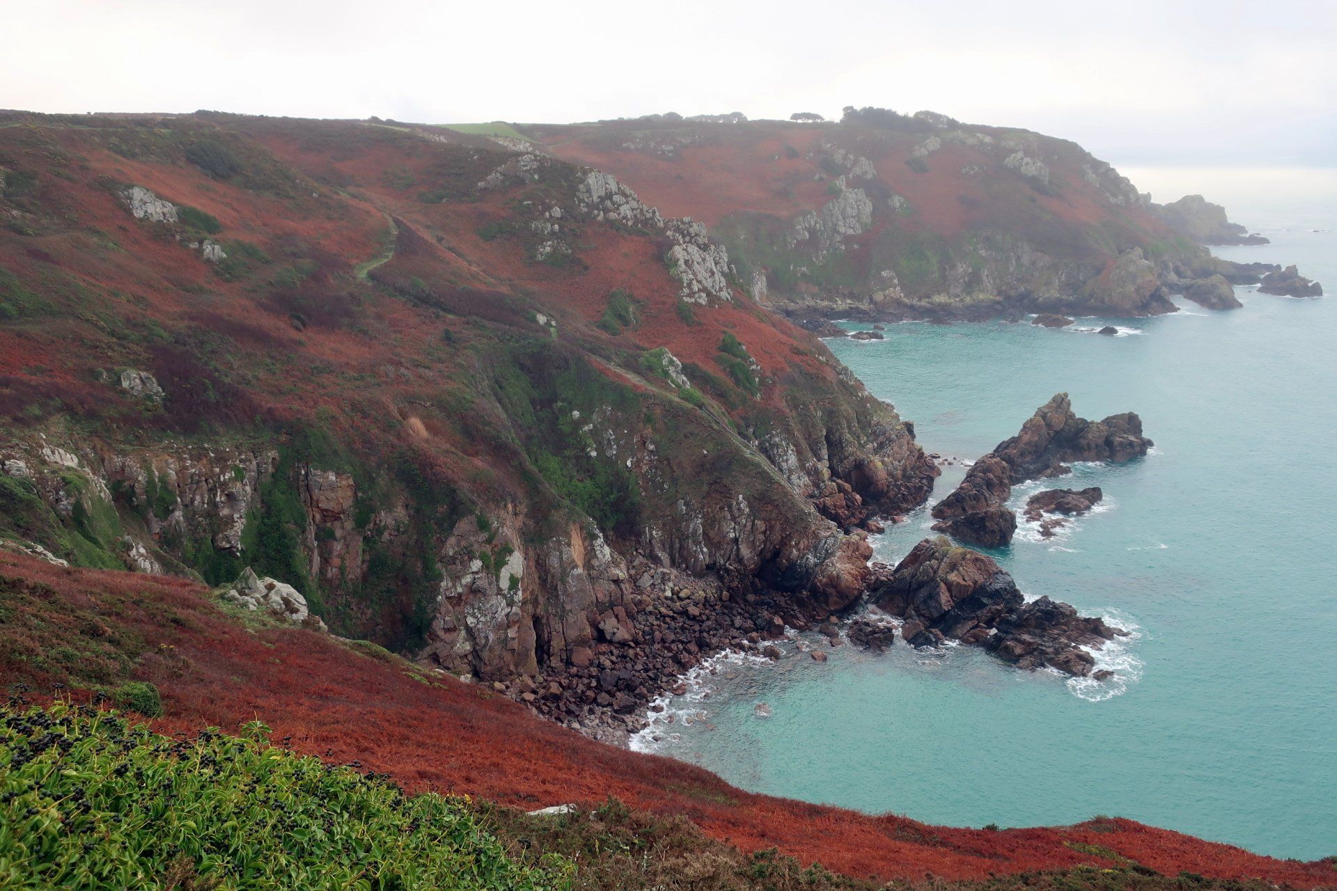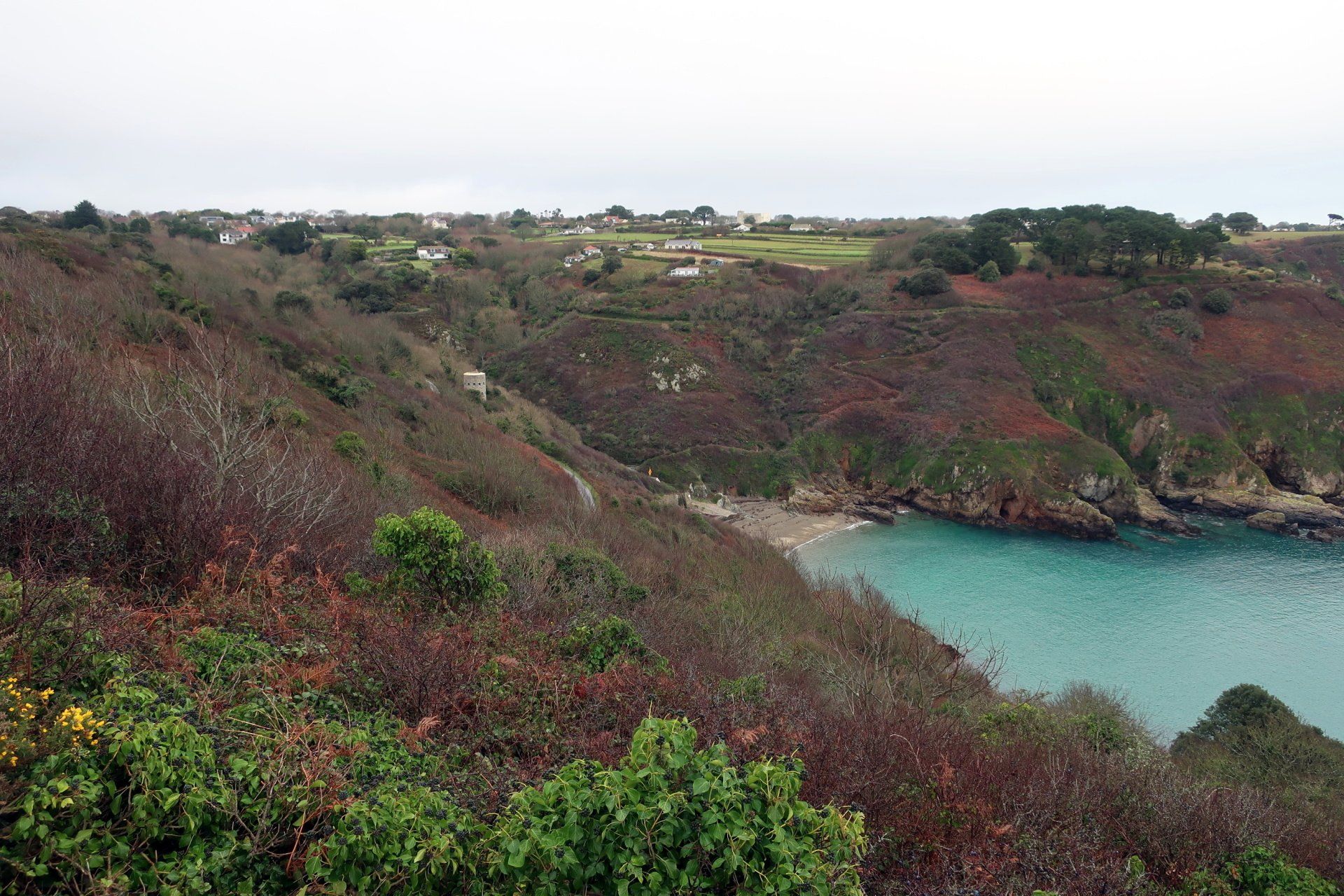 The first of these diversions comes after nearly a couple of miles, this to Jaonnet Bay. This is probably half mile round trip, ending in some steep steps and then a ladder to reach the bay itself. I came here for the first time a couple of months ago with the sun shining and the tide out showing a great beach of firm, clean sand, tucked in the cliffs. Not so today, as the tide is up so I don’t depart from the ladder, but still fun. Jaonnet Bay is known for a couple of things - it was the landing point of a British Commando raid in July 1940 (commemorated on a stone at Icart headland), also it is (allegedly) Guernsey's nudist beach!.