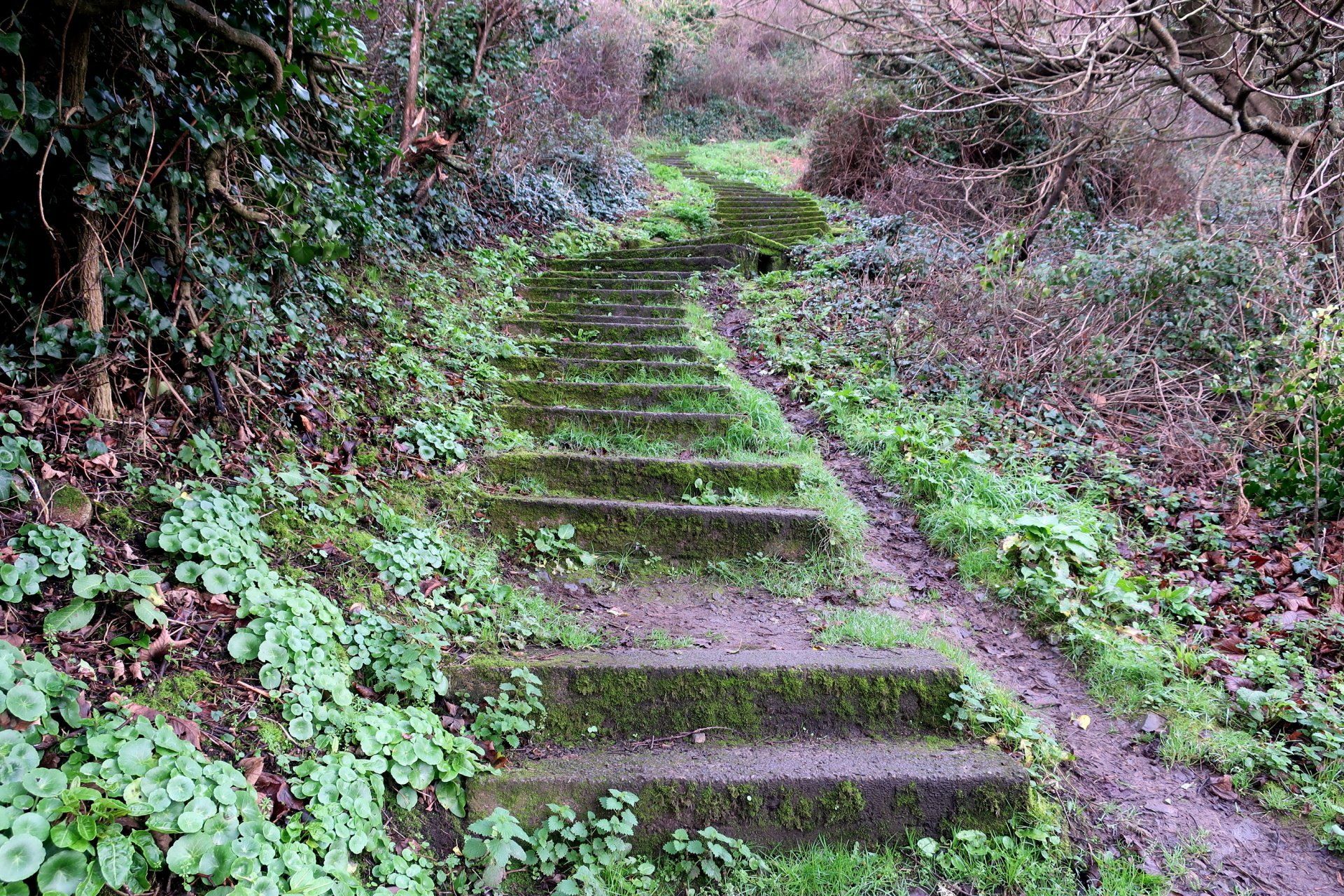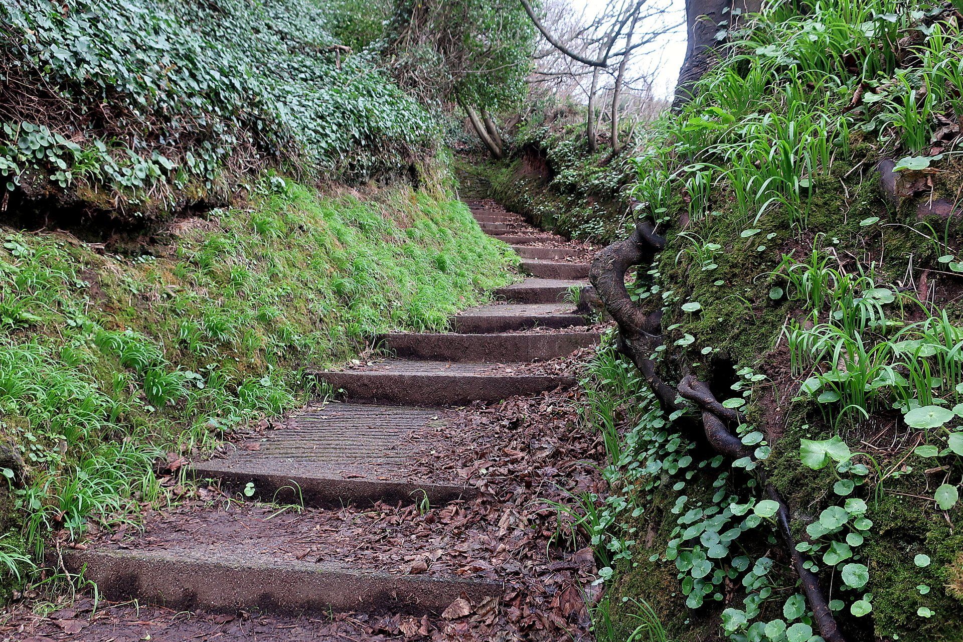 This seems to be perking up a bit, the sun even trying to peak through the clouds, but it is short lived and the drizzle soon comes again. One affect of this is the walking surface is very slippery and I have to take care with some of the slopes and steps as they are greasy in parts.