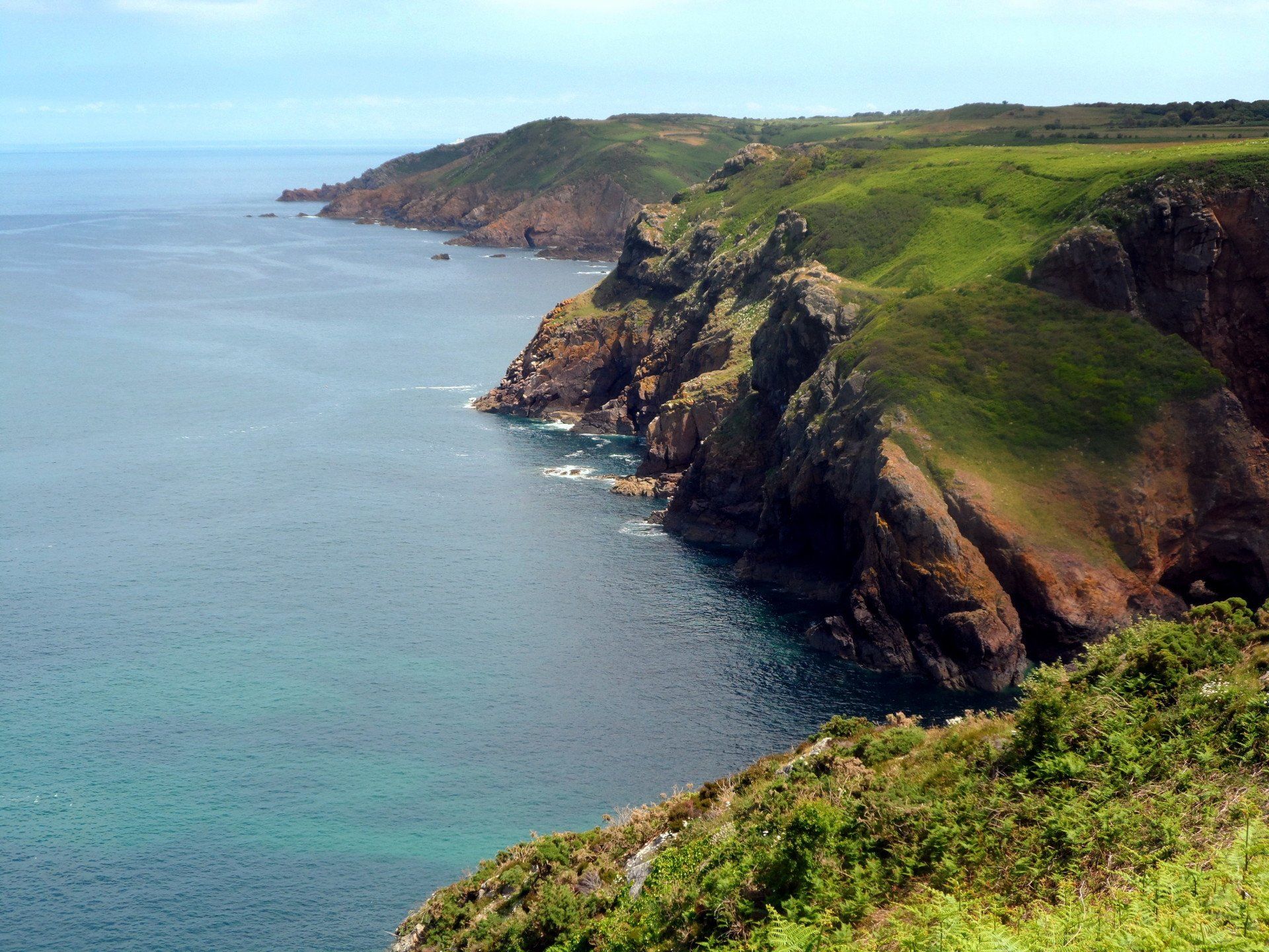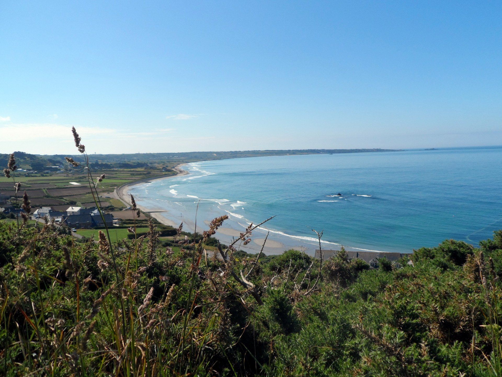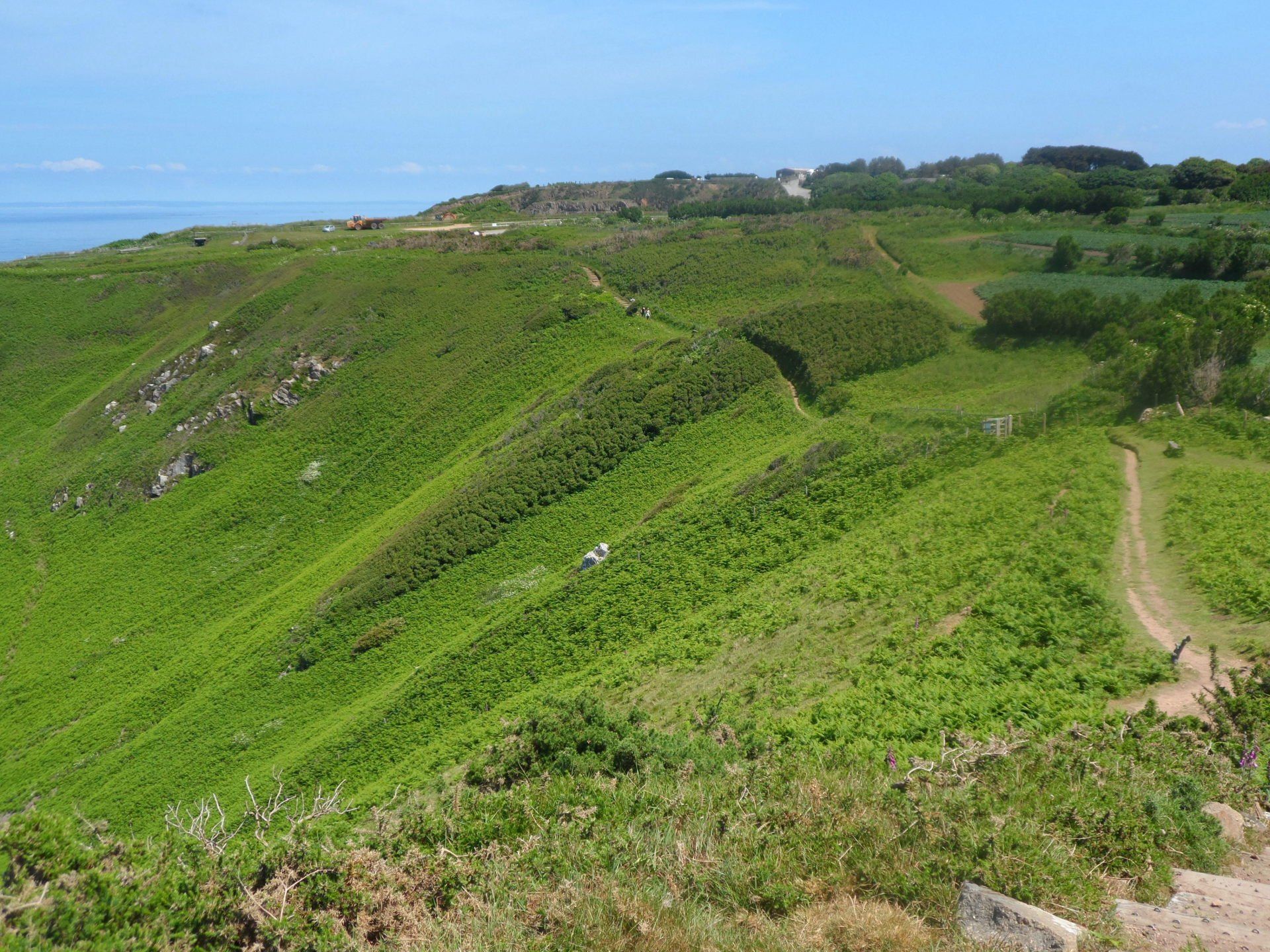 I pick up where I left off at L’Etacq, on the West coast. I recall my last moments here a week ago, the “sweaty mess”! On this occasion I have a chance to look around and take in the surroundings, the beach stretching away to the South, to the North the cliffs immediately making their presence felt. I follow the road up, then locate the start of the cliff path, with a fairly steep climb up quickly offering some wonderful views back along the length of St Ouen’s Bay, all the way to Corbiere lighthouse in the distance.
