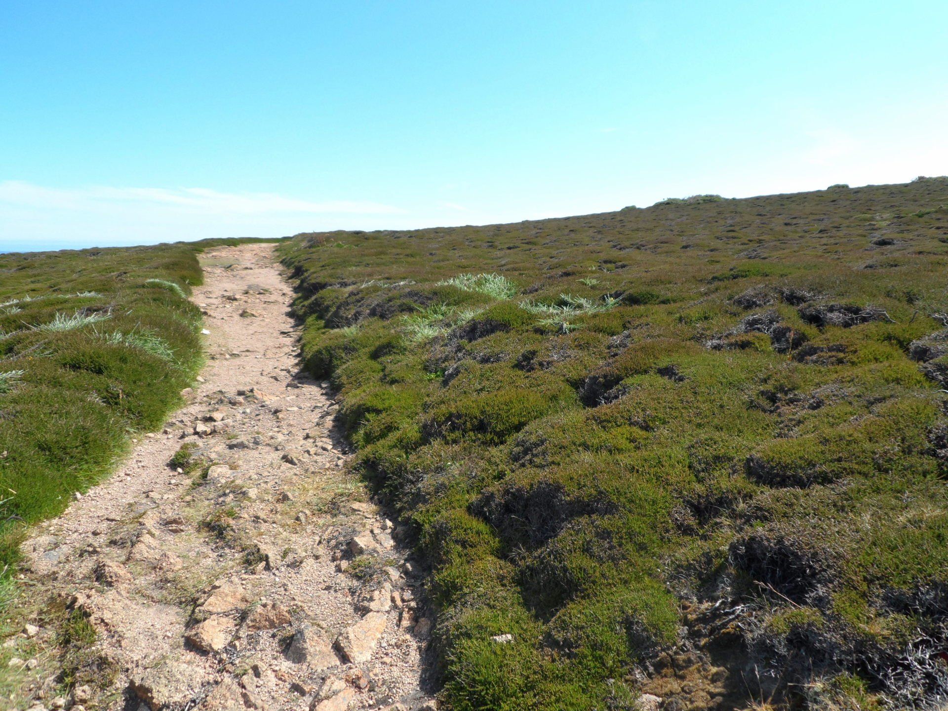 At the top I reach a plateau like headland that makes up the North West corner of the Island, this with quite a distinct look and feel. The initial rocky feel turns more green, with large areas of plants that clump together to give the appearance of a luxurious green carpet! Between this are trails of gravelly sand on which I crunch along.