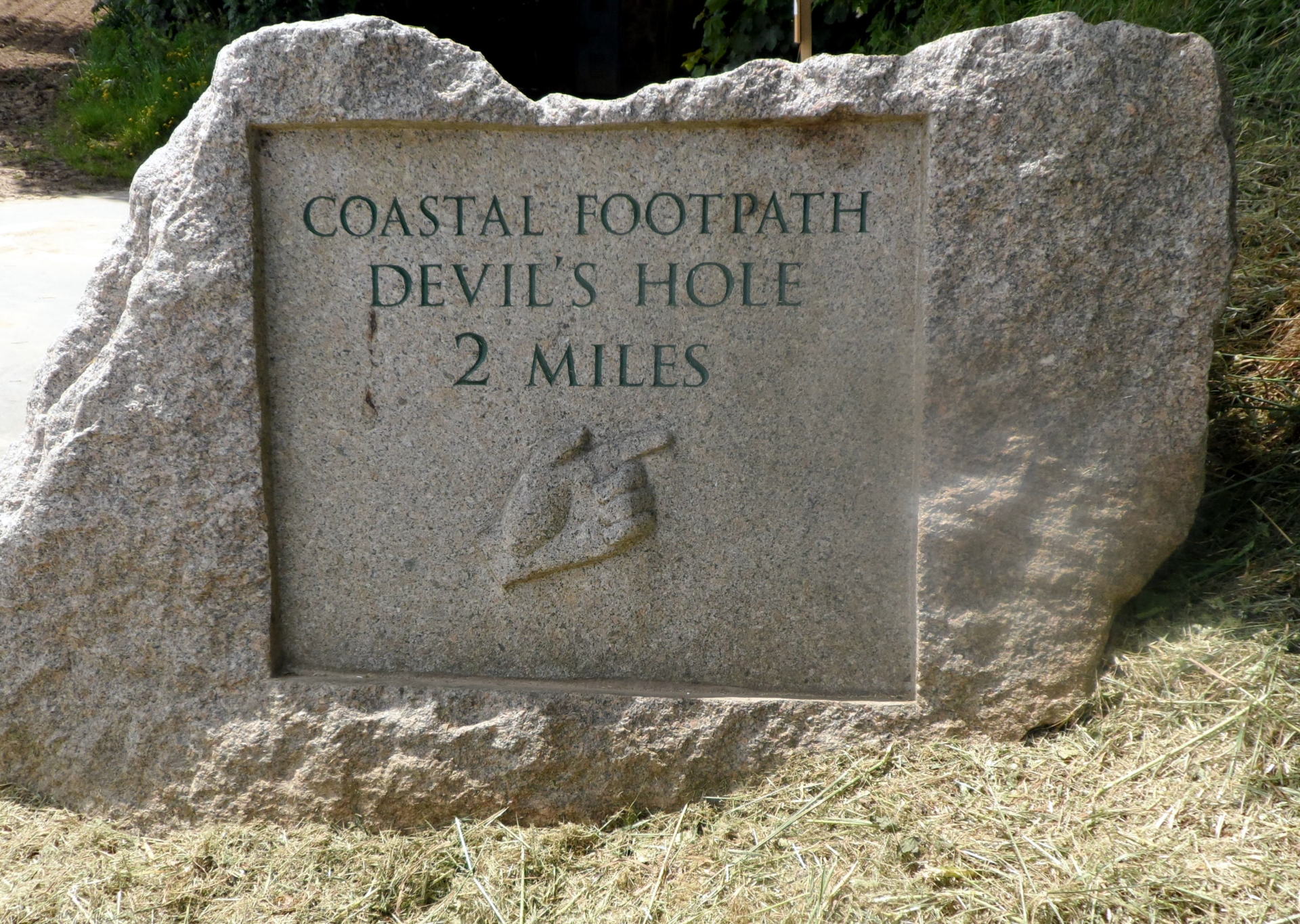 Suitably fortified I set off again, initially a bit of a slog uphill along small roads, but these soon lead back to the cliff paths with some fine views in both directions along the coast. These trails then divert inland again, eventually reaching a spot above Devils Hole, a cave/blowhole in the rocks. I don’t take the path down to see the hole (for time reasons) but do go down as far as the ‘devil’ a statue that must be some 20t high, standing in the middle of a pond – albeit that nature seems to be slowly overtaking this devil!