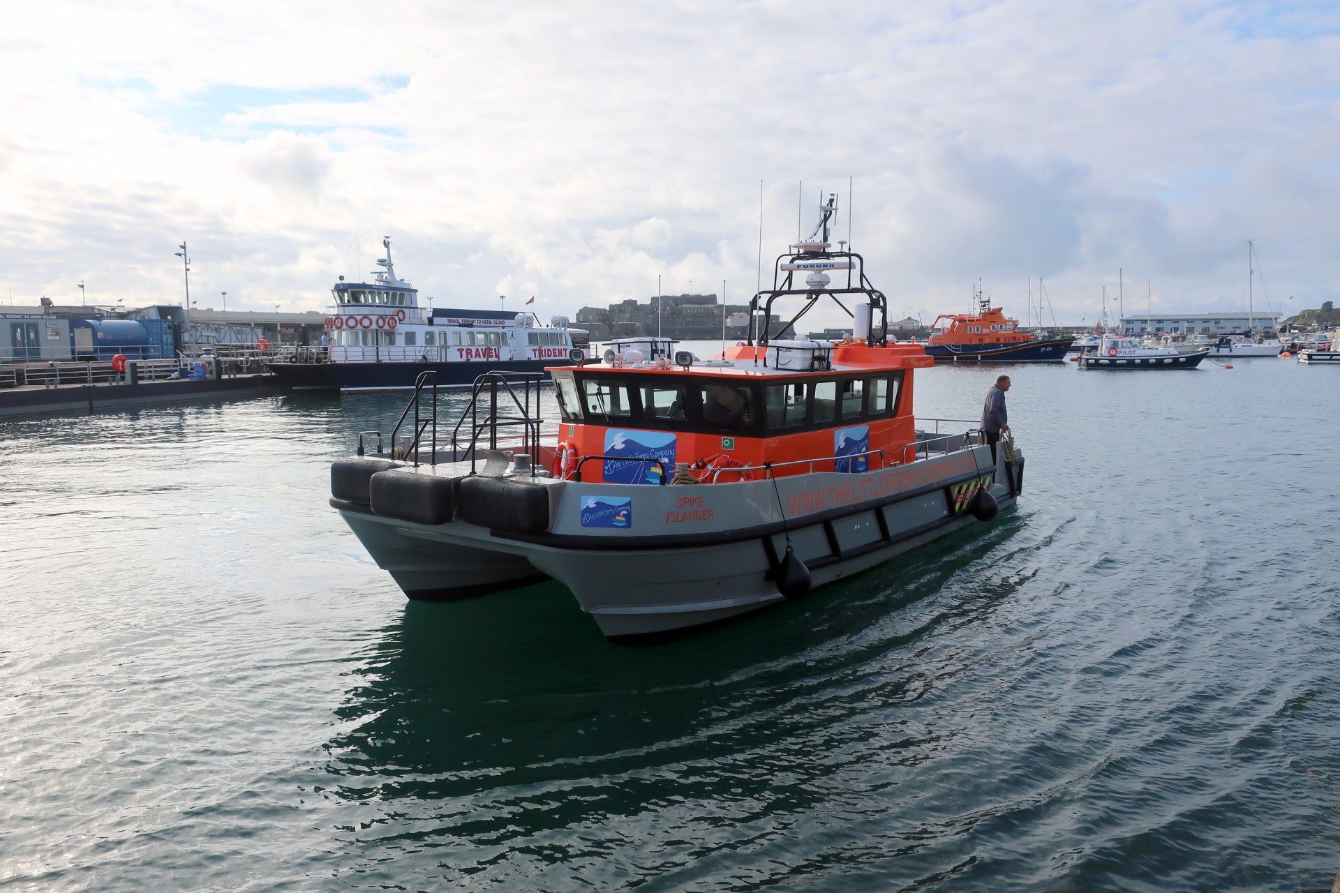 I am at the harbour for the 9:00 ferry, boarding the small catamaran “Spike Islander” and taking one of the 12 passenger seats just behind the crew. We leave the harbour and turn North East for Alderney and just over an hour later, after an enjoyable cruise, we round the end of the breakwater and moor at the Alderney commercial quay.