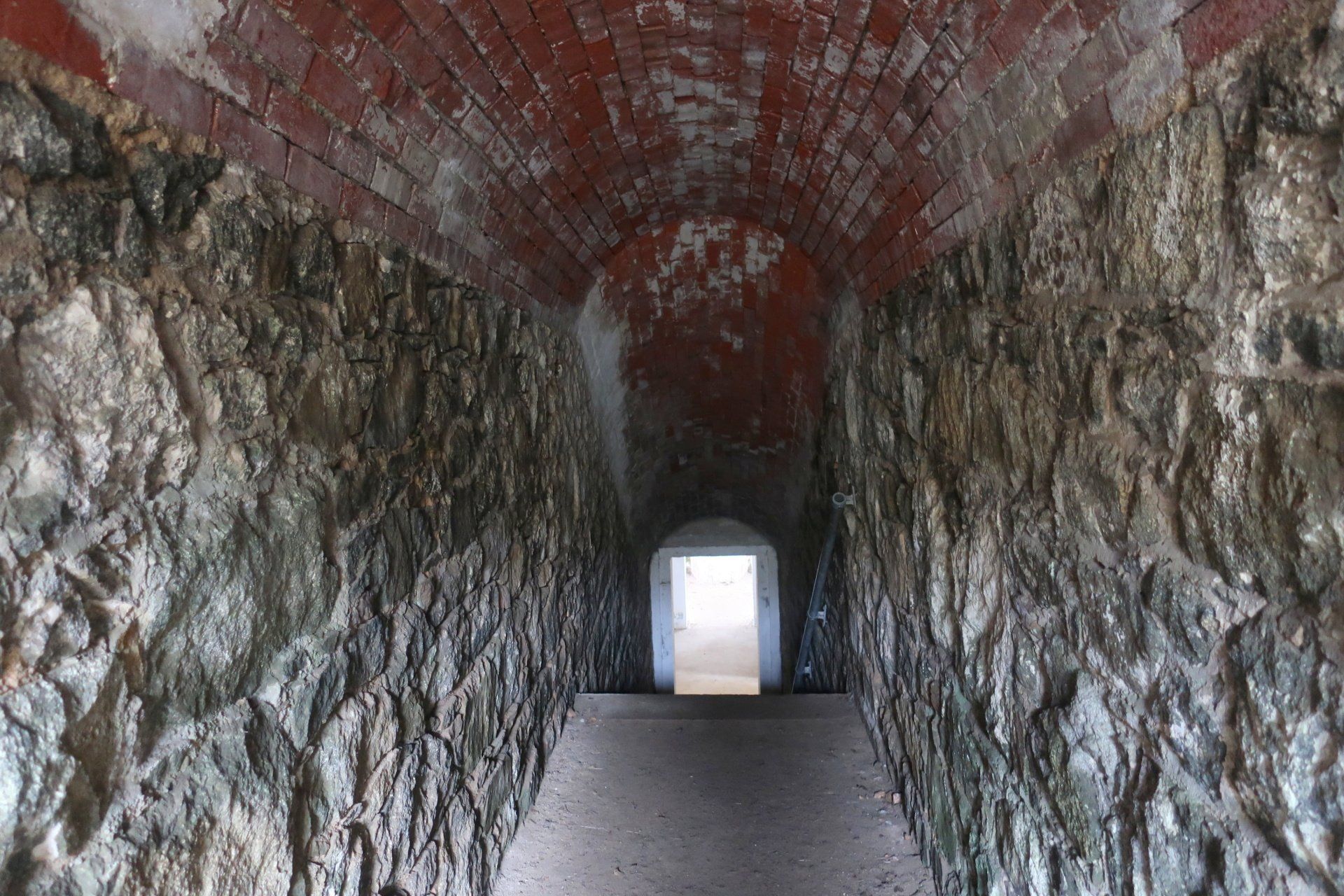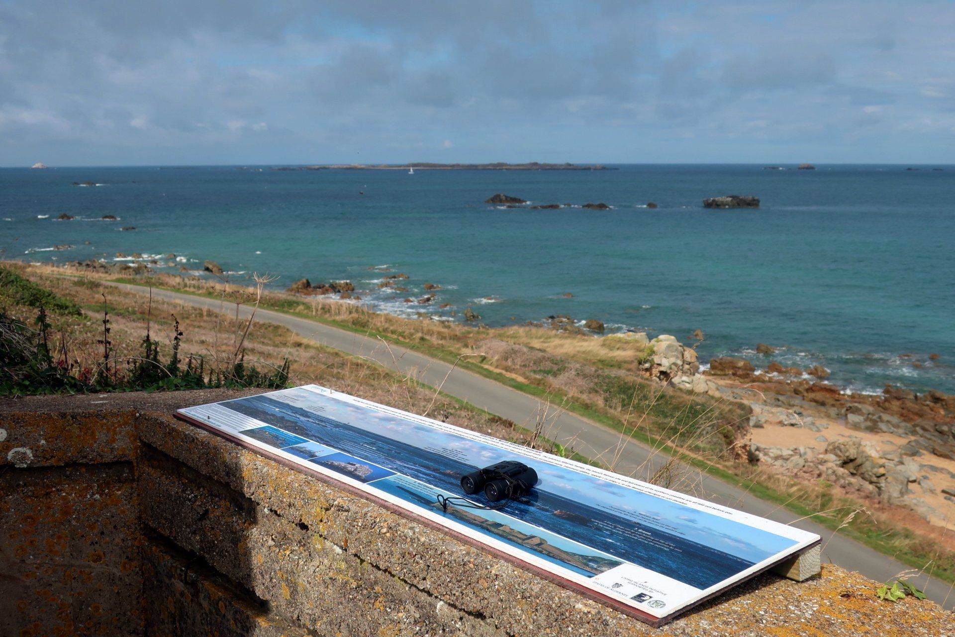 The Victorian forts are mostly now privately owned, some turned into homes, but one of the largest – Fort Tourgis – is still partially open to the public, pending redevelopment (which is always about to happen, but never does!). The Cambridge Battery section is a remnant of German modifications, leaving a warren of rooms and tunnels, all open to explore. An outside viewing platform, originally a searchlight platform, offers fine views back to Braye Harbour and out to sea. I have taken my binoculars today and use these on several occasions, the first here.