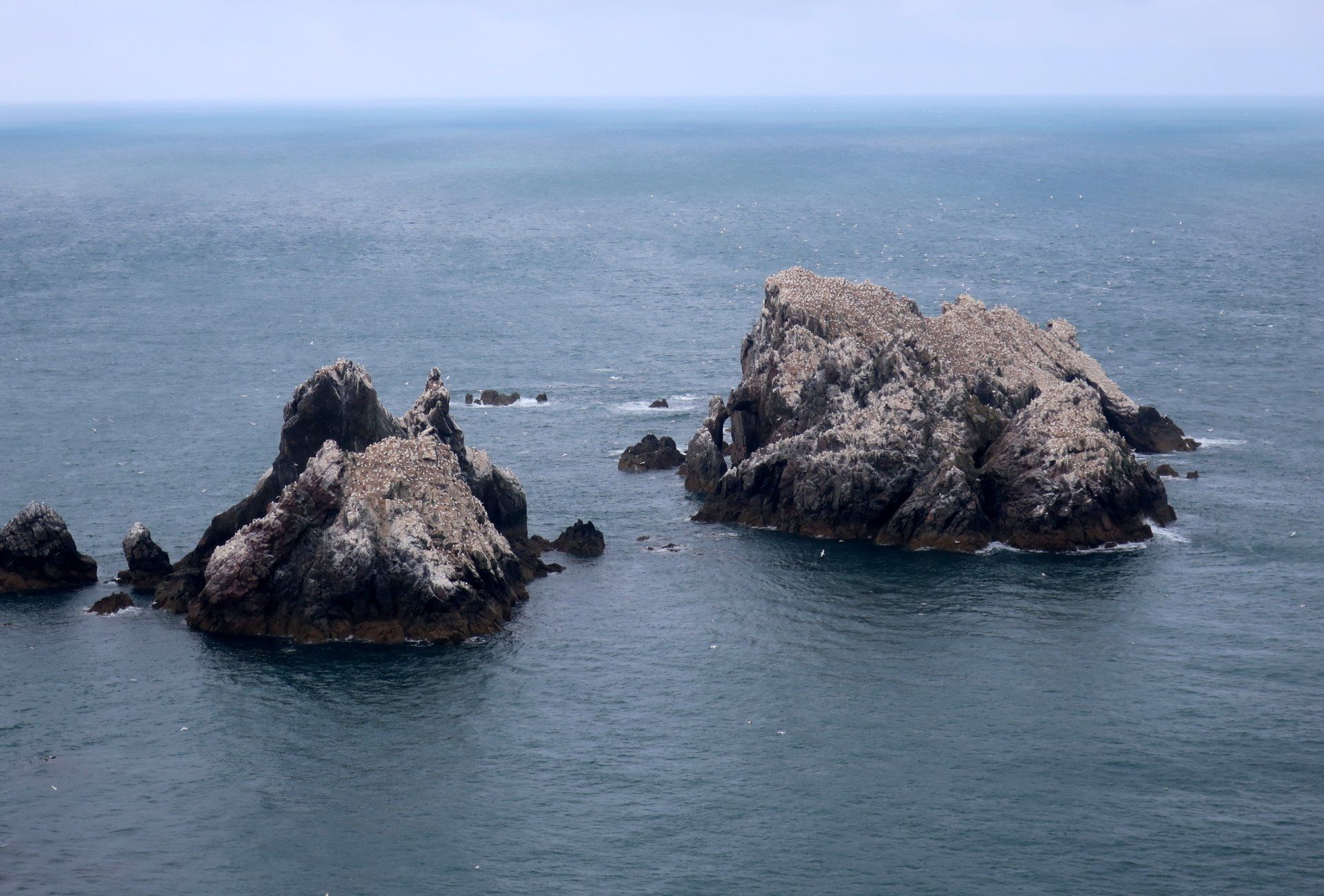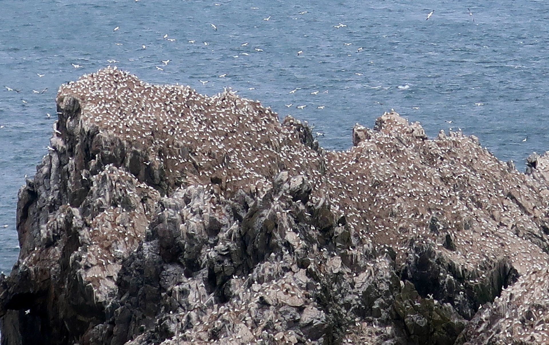 At the end of the road I reach the cliff edge overlooking the gannet colony on Les Etacs, these a couple of large rocks completely covered by gannets (and white with their poo). It is really quite a sight. Apparently there can be over 10,000 gannets here, 2% of the world’s northern population.