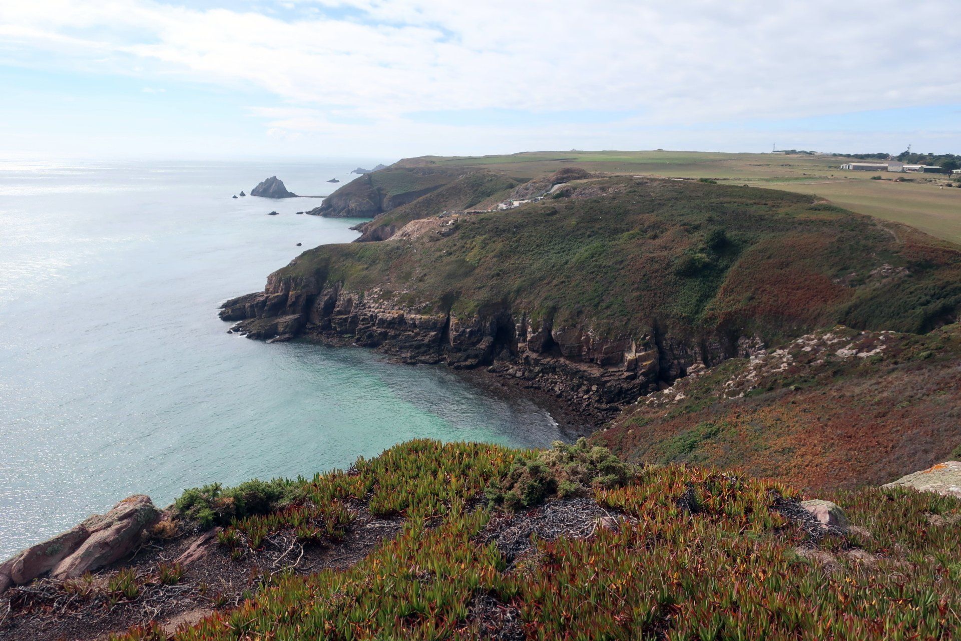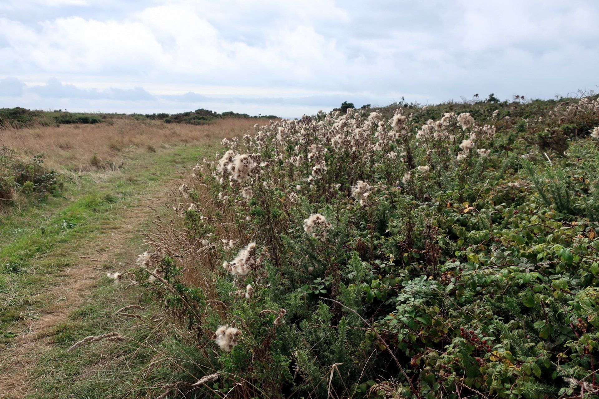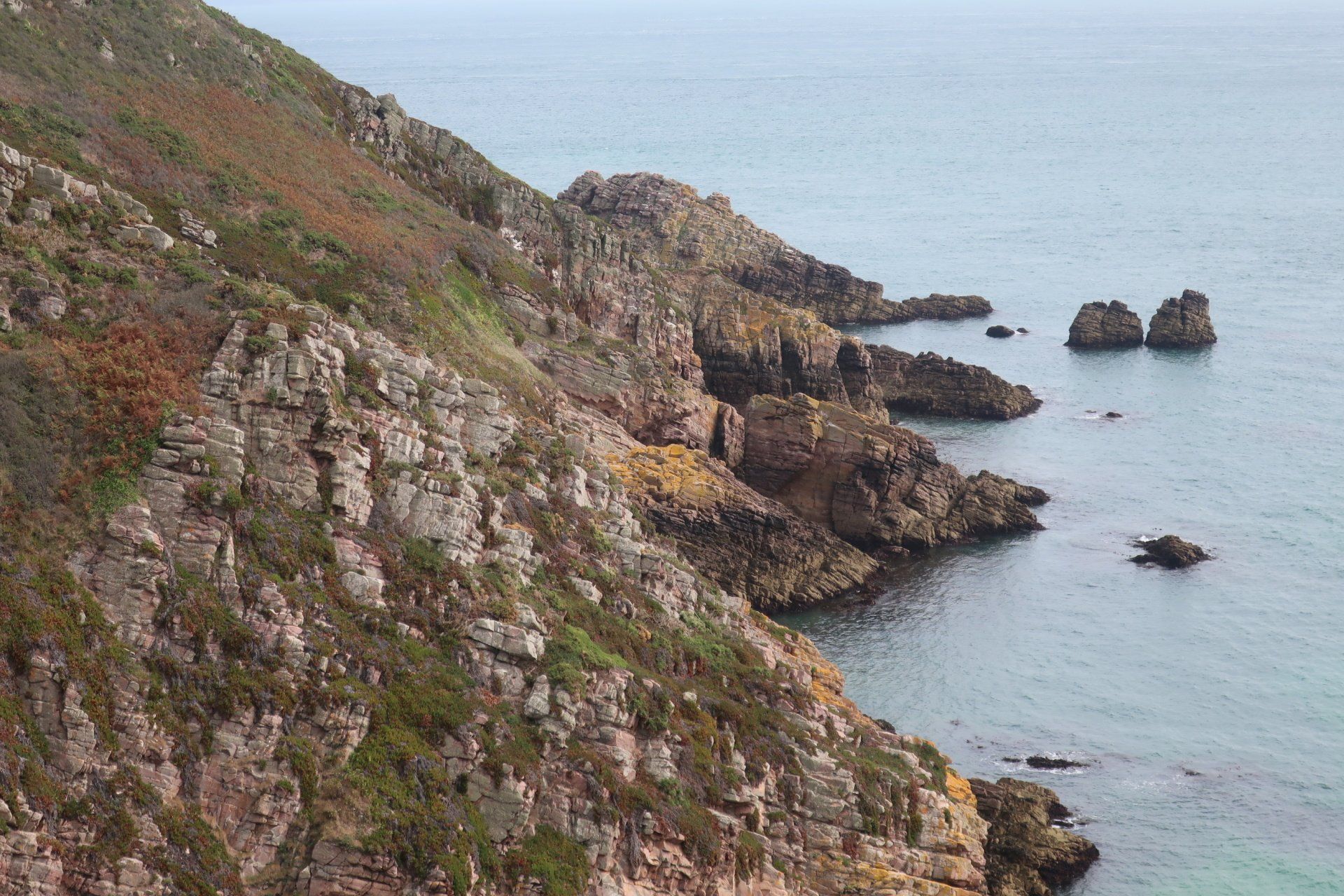 From here I need to work my way around the cliff edge but there is no clear path. I descend a steep hill and follow a path although this leads inland and misses the intended route, however, I back track and in the round make it work, if a little convoluted. There are some fine views over Telegraph Bay and other areas, with the French coast clearly visible off to the East (about 10 miles away).