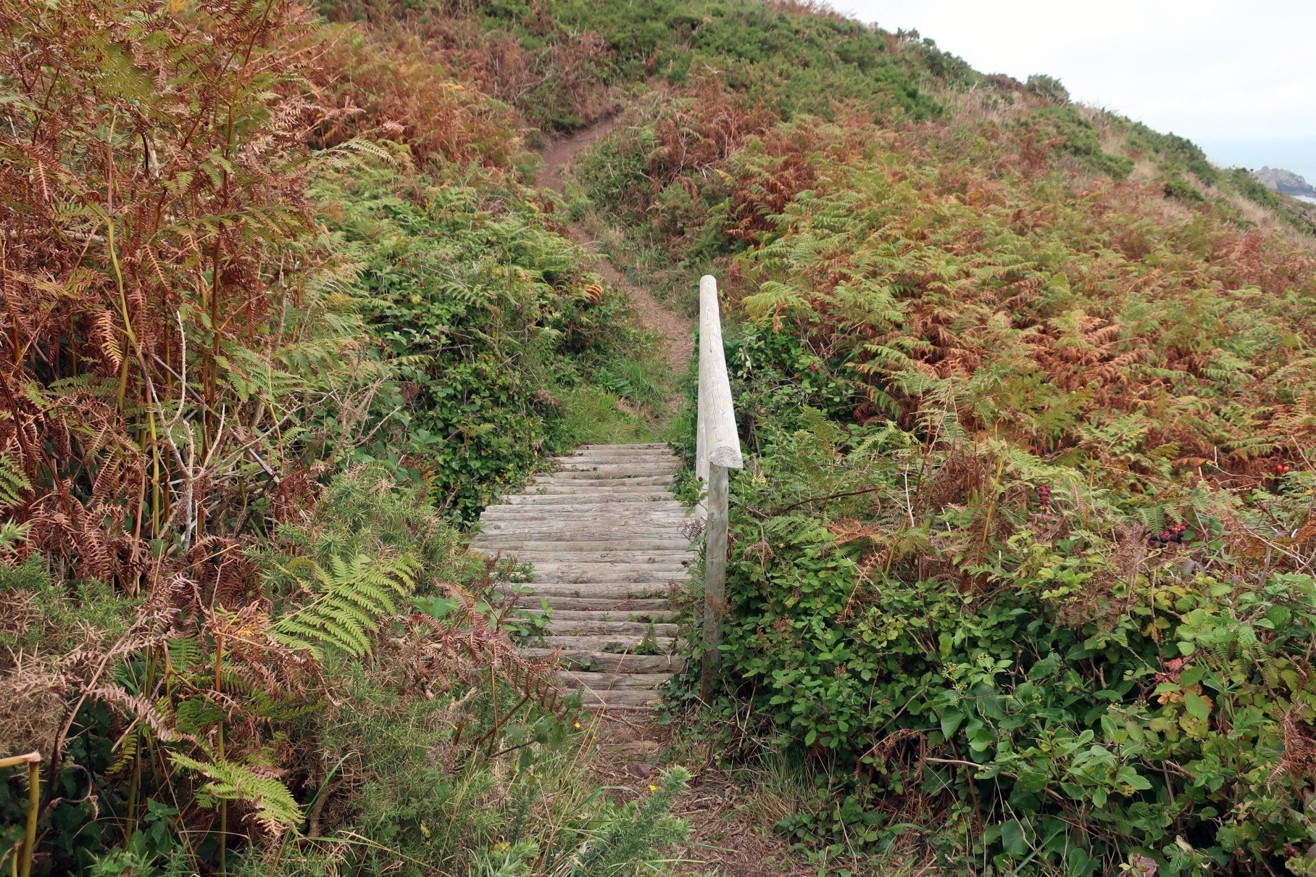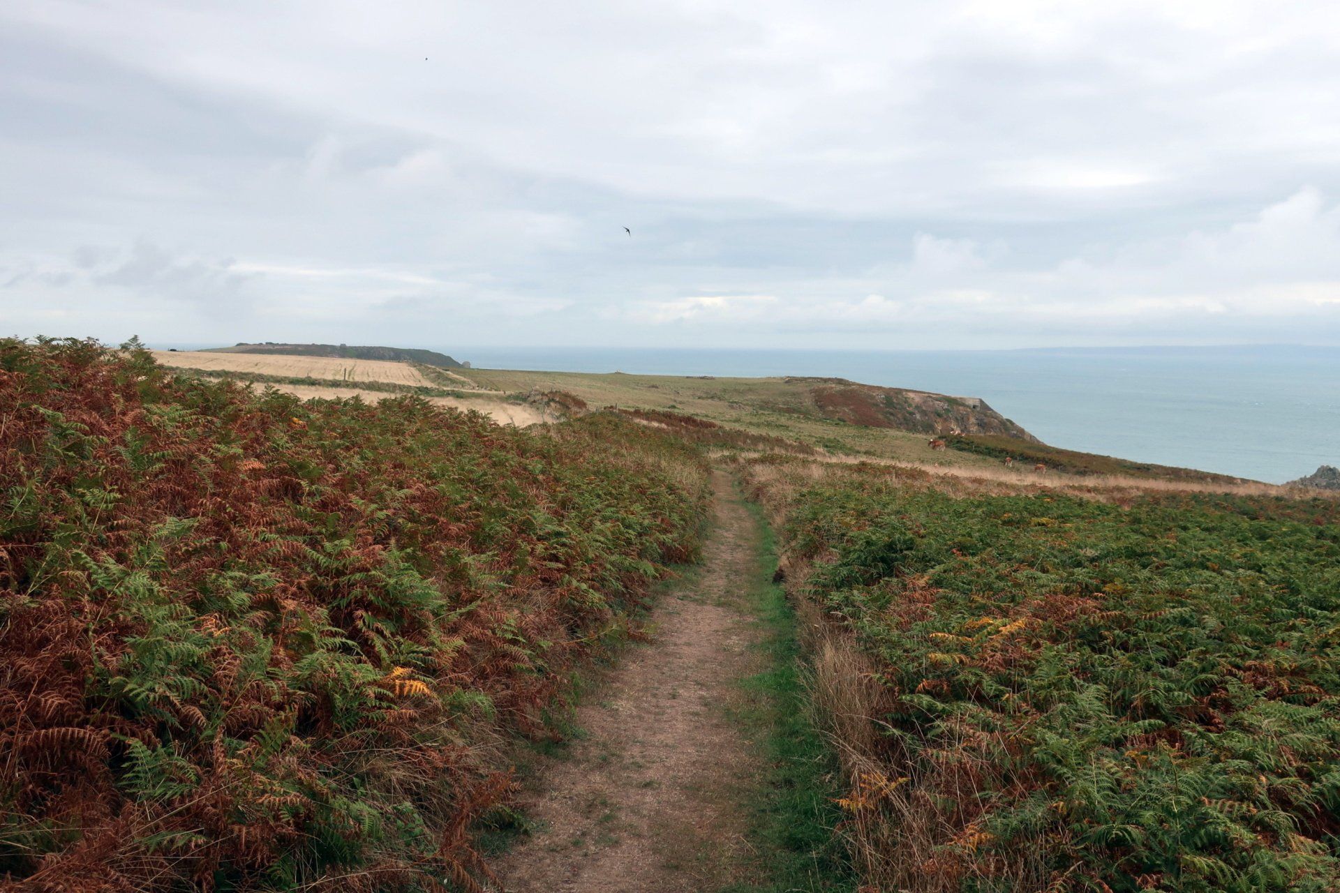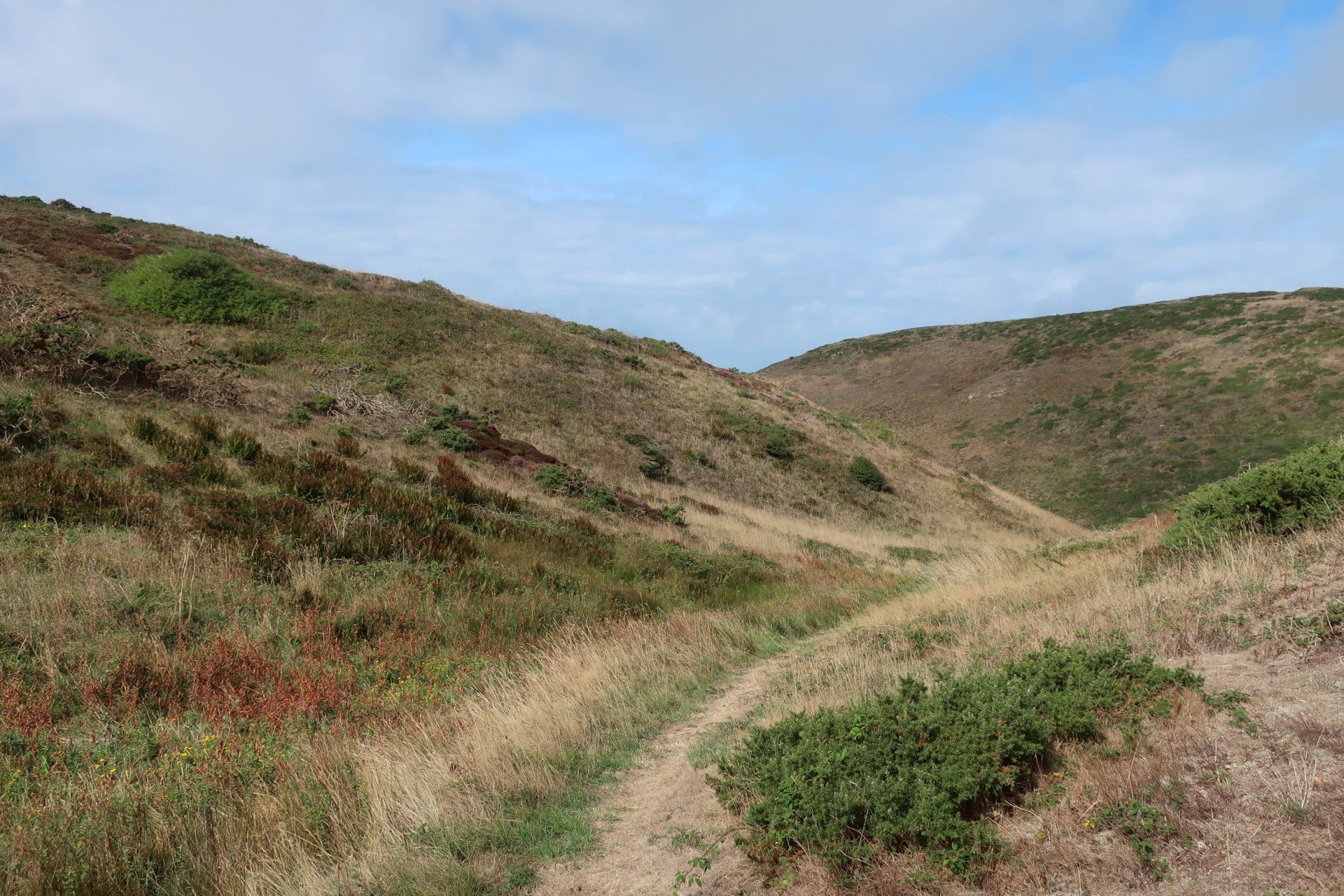 From here I need to work my way around the cliff edge but there is no clear path. I descend a steep hill and follow a path although this leads inland and misses the intended route, however, I back track and in the round make it work, if a little convoluted. There are some fine views over Telegraph Bay and other areas, with the French coast clearly visible off to the East (about 10 miles away).