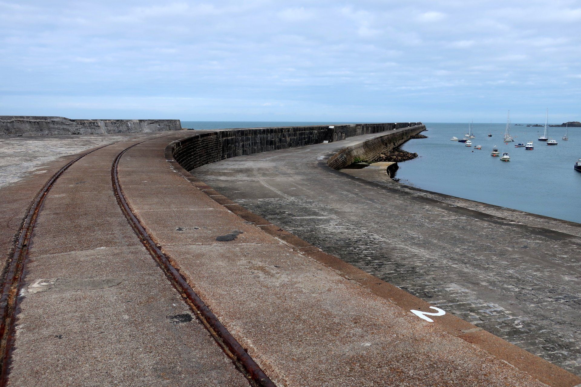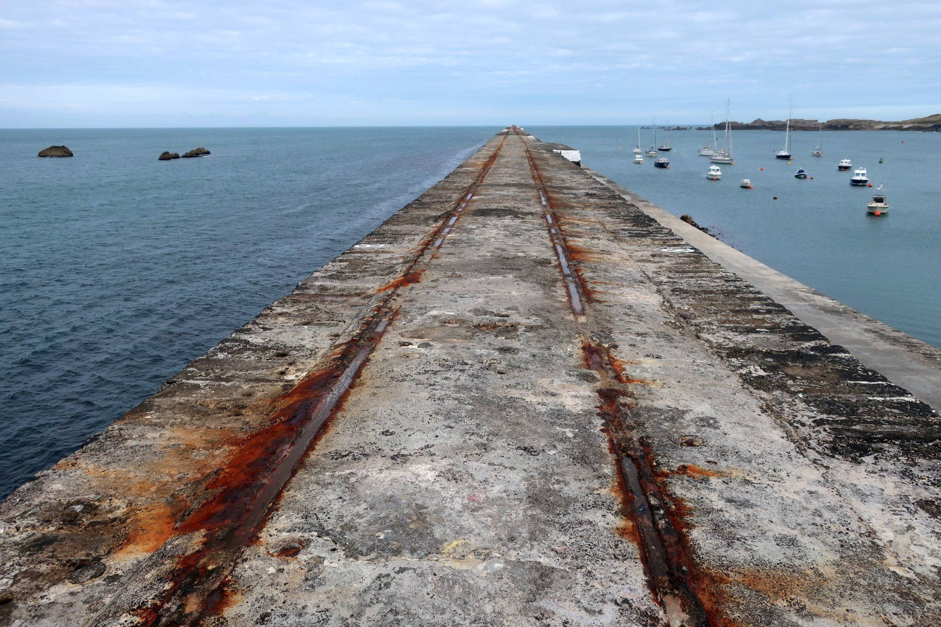 A last fort at the top of a hill, then Braye Bay is once again in sight, the breakwater stretching out. At 960 metres it is one of the longest breakwaters in the UK. I walk around the final piece of coastline until I reach that breakwater and take a stroll along the first part, peering carefully over the front edge. I can see it has been fortified in places, not surprising as it really takes a battering in storms.