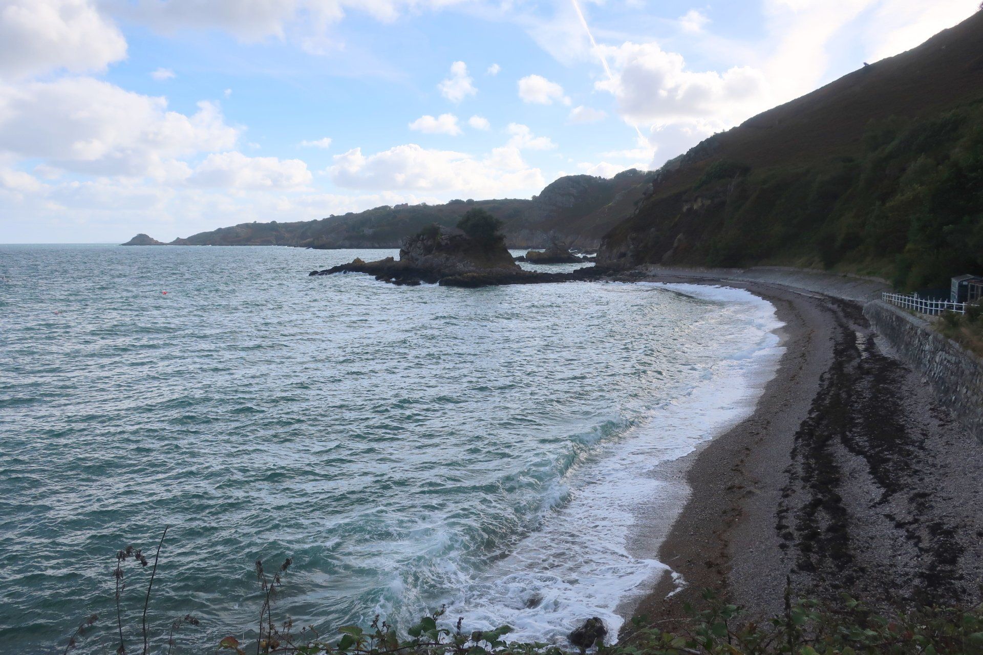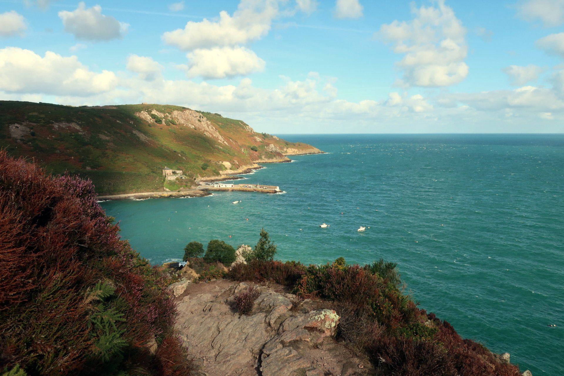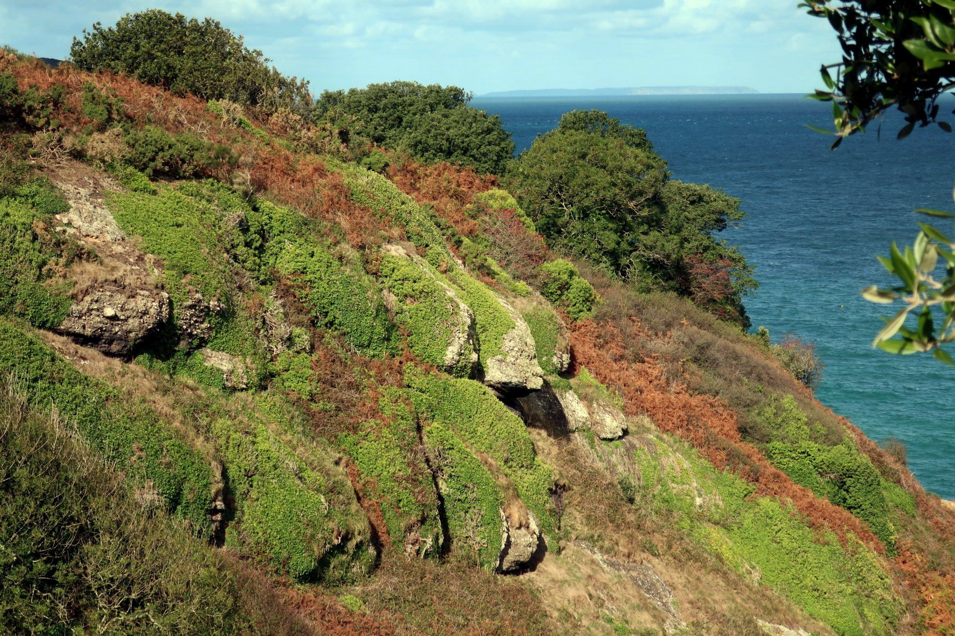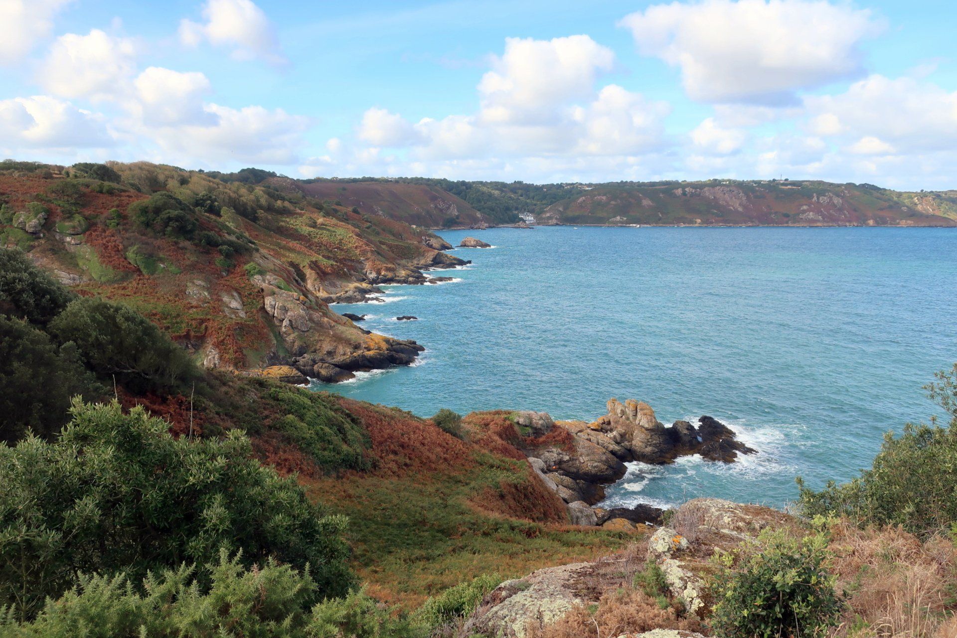 I reach Bouley Bay to pick up where I left off in June and set off uphill, making my way through the tree line out on to the more open cliff path and the joy of the open views, in both directions. The tide is high so the waves are noisily breaking on the beach, the northerly wind fresher at this time of the morning is a little bracing. All gives a fine feeling to be back out on the cliffs, at one with nature.
