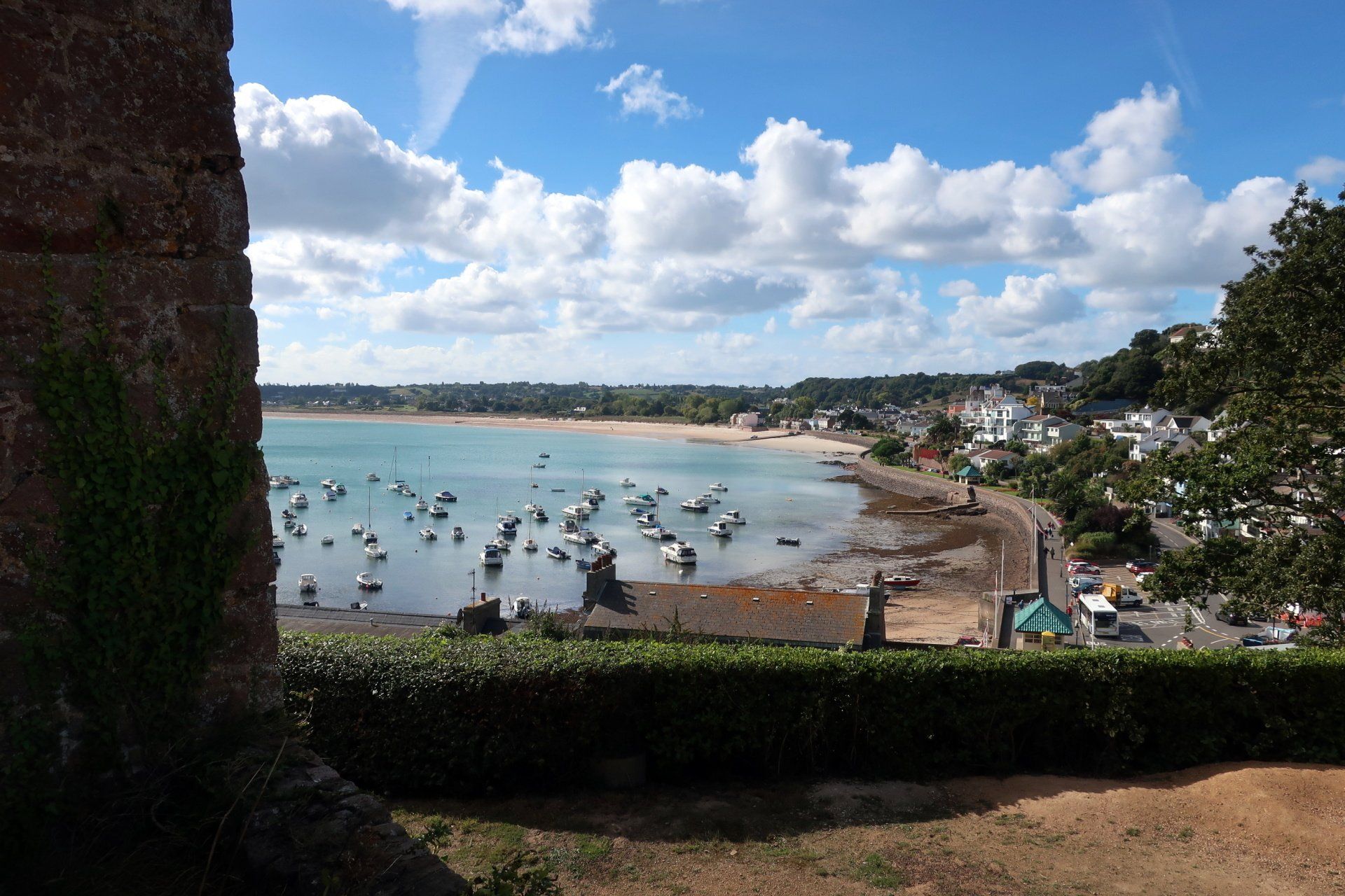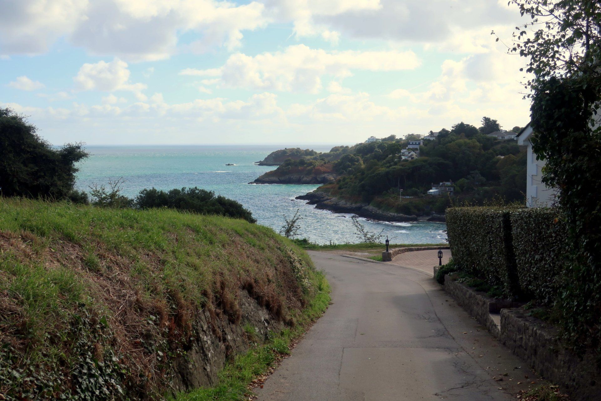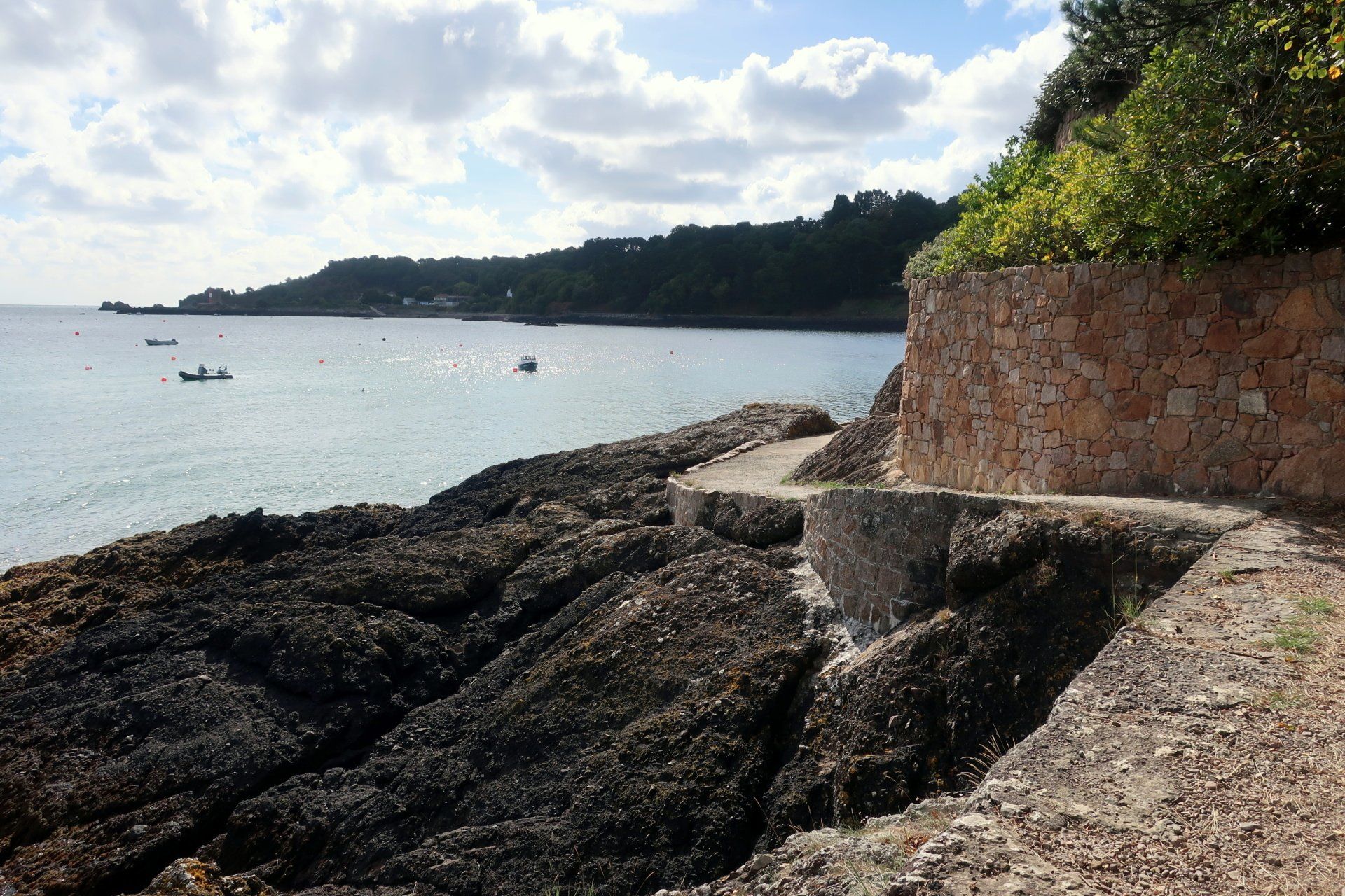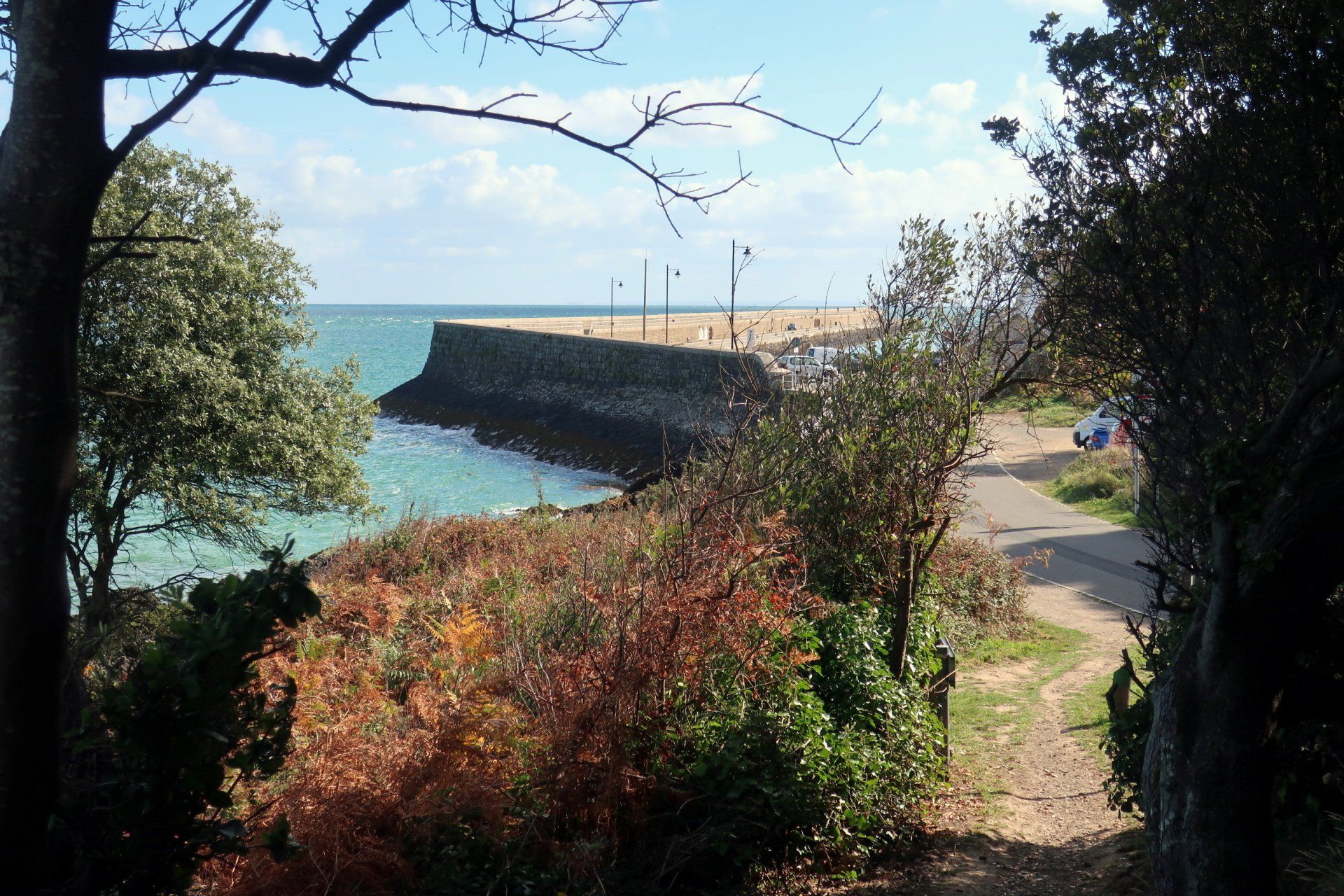 I have a short spell walking on inland path and road until I re-join the coast above Rozel, one of a number of small, picturesque harbours along the East coast. Similar follows, with the trail having a bit of up and down until I reach the next main bay, St Catherine’s with its imposing breakwater. I stop here for an ice cream, the warm sun justifying such a treat (as long as sheltered from the cooling breeze).