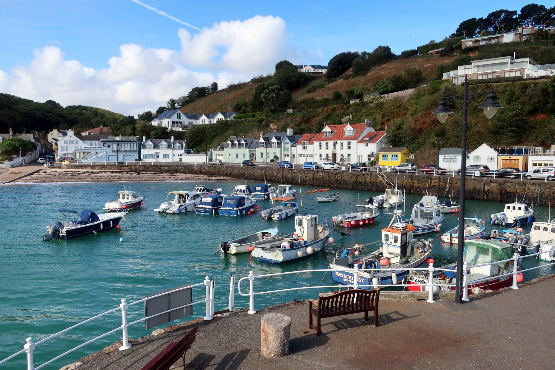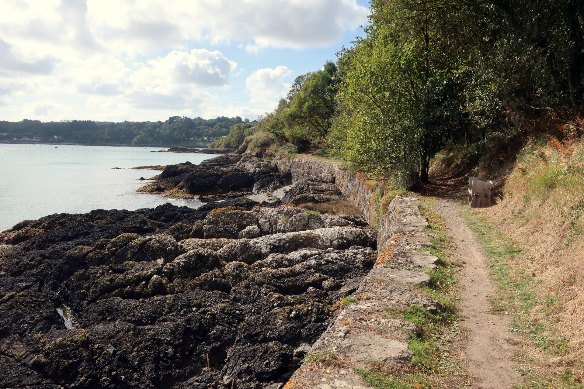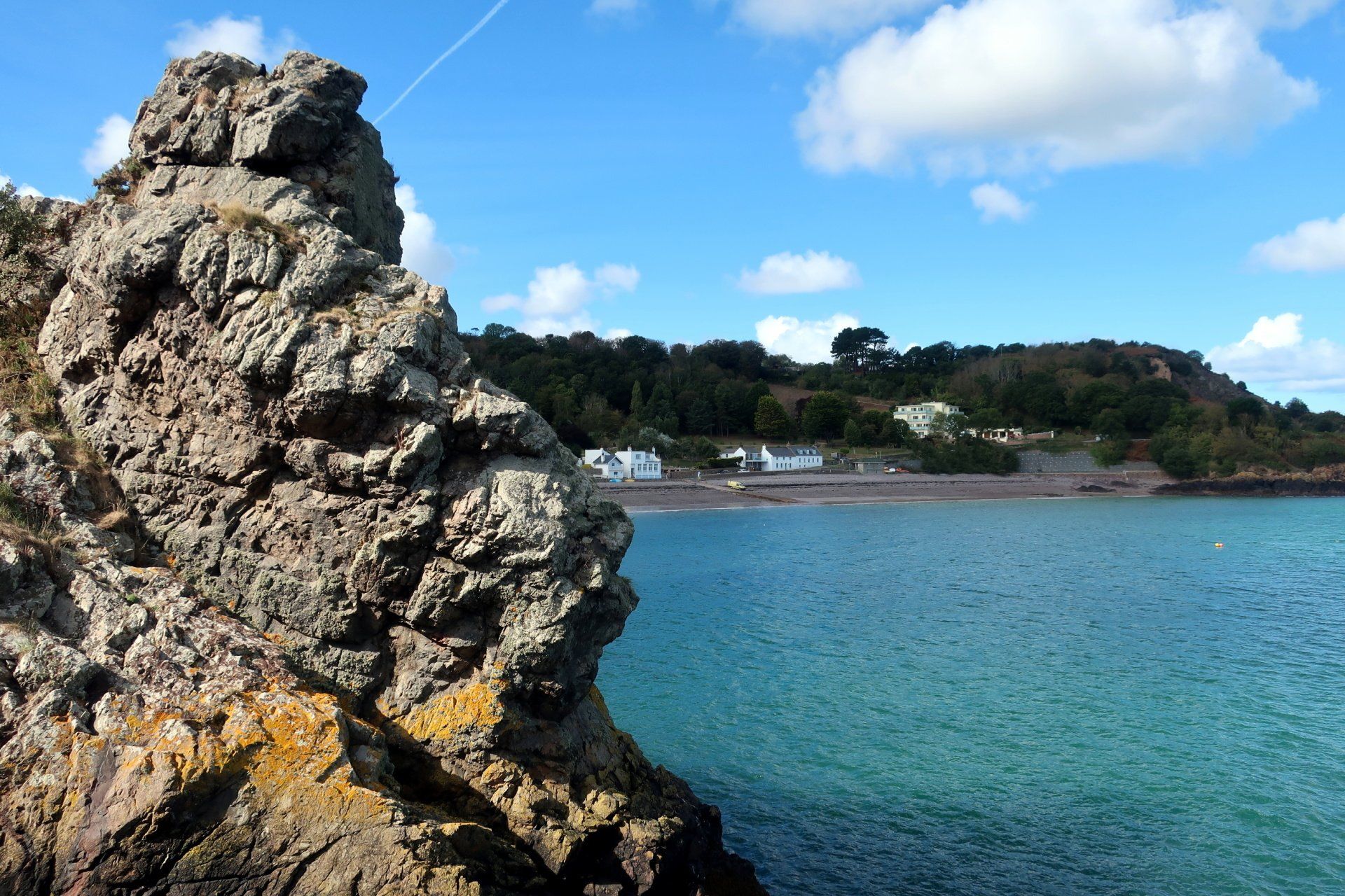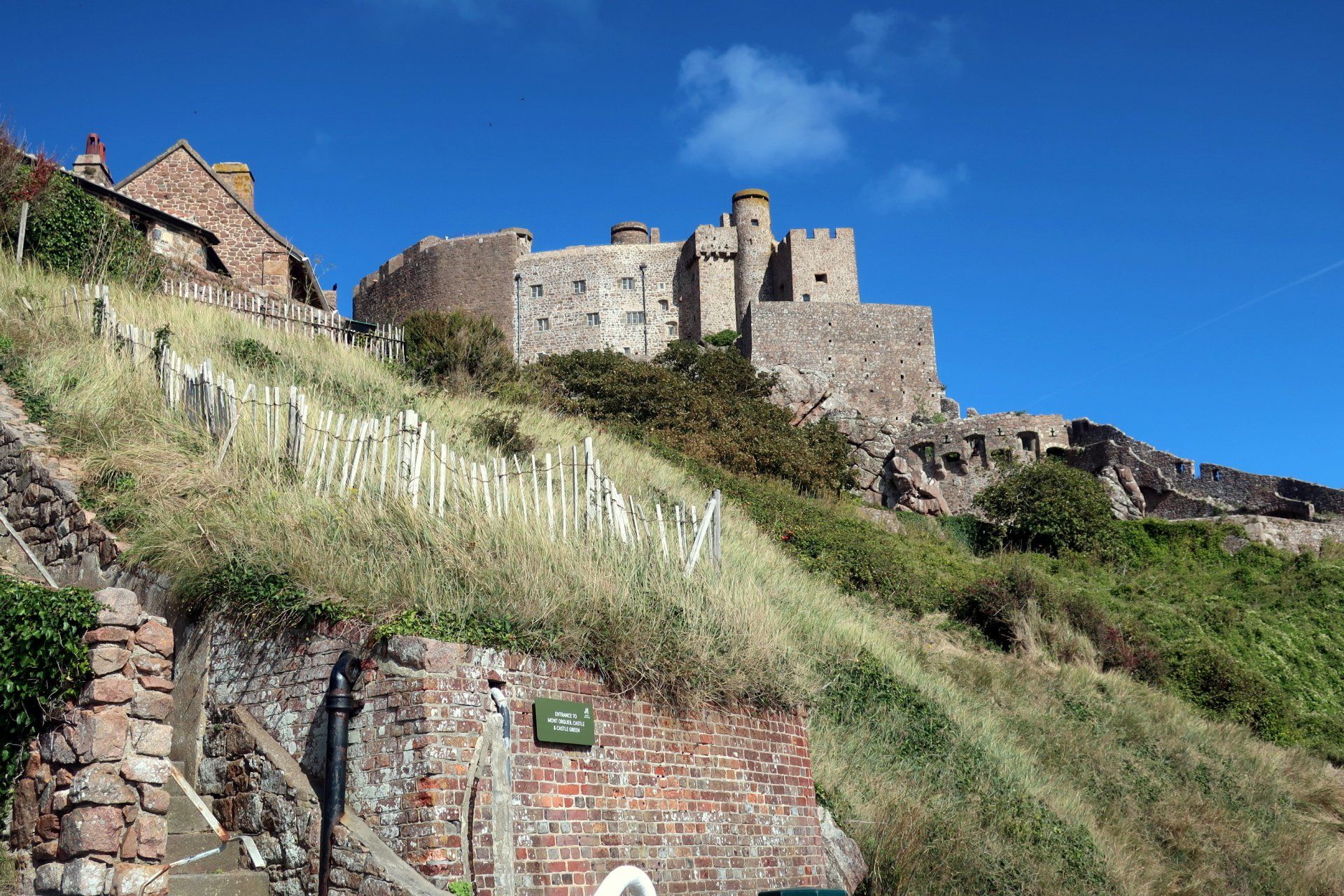 I have a short spell walking on inland path and road until I re-join the coast above Rozel, one of a number of small, picturesque harbours along the East coast. Similar follows, with the trail having a bit of up and down until I reach the next main bay, St Catherine’s with its imposing breakwater. I stop here for an ice cream, the warm sun justifying such a treat (as long as sheltered from the cooling breeze).
