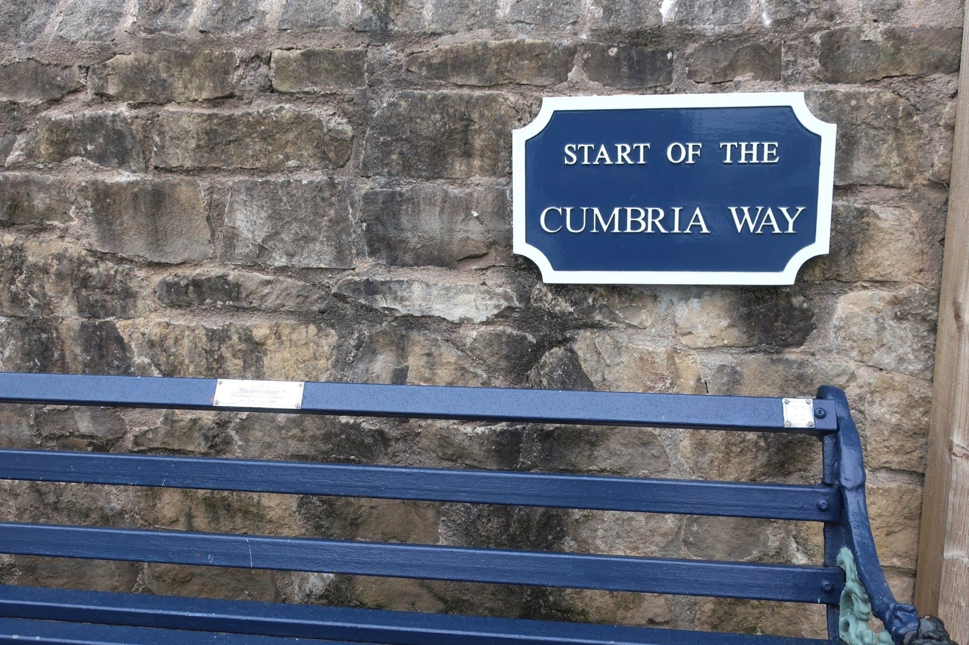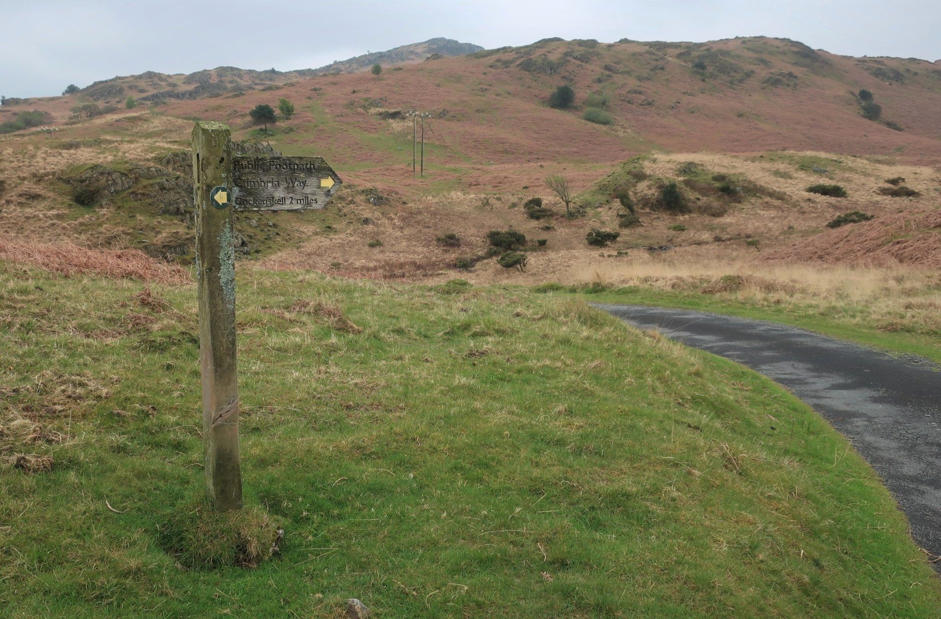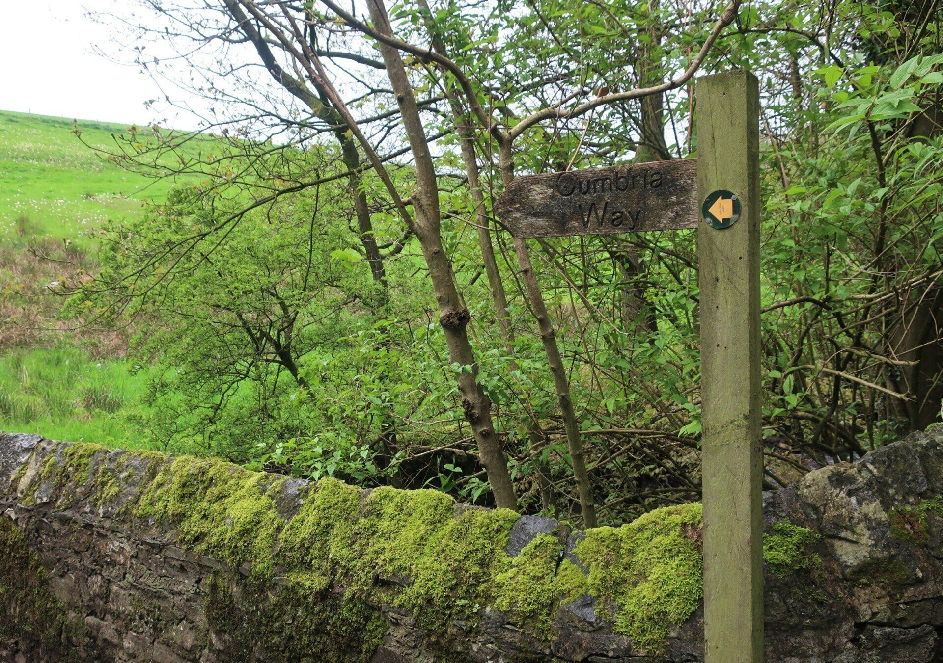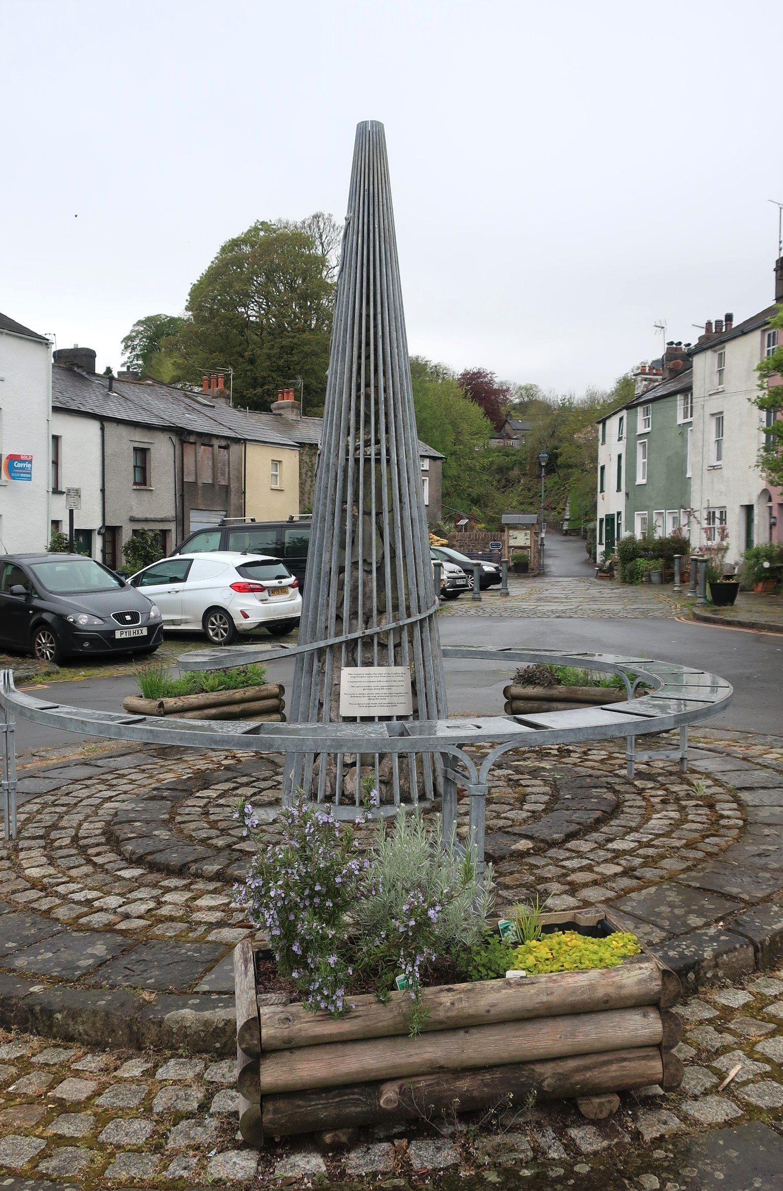 A comfy bed, a good nights sleep and then hogging out on waffles and bacon for breaky set me up for my first day’s walk to Coniston, a 16 mile walk, initially through farm country but then into the Lake District fells. First off I find The Gill, the official start of the Cumbria Way, marked by an interesting sculpture, integrating rocks from the route, compass points and OS map references. Quirky
