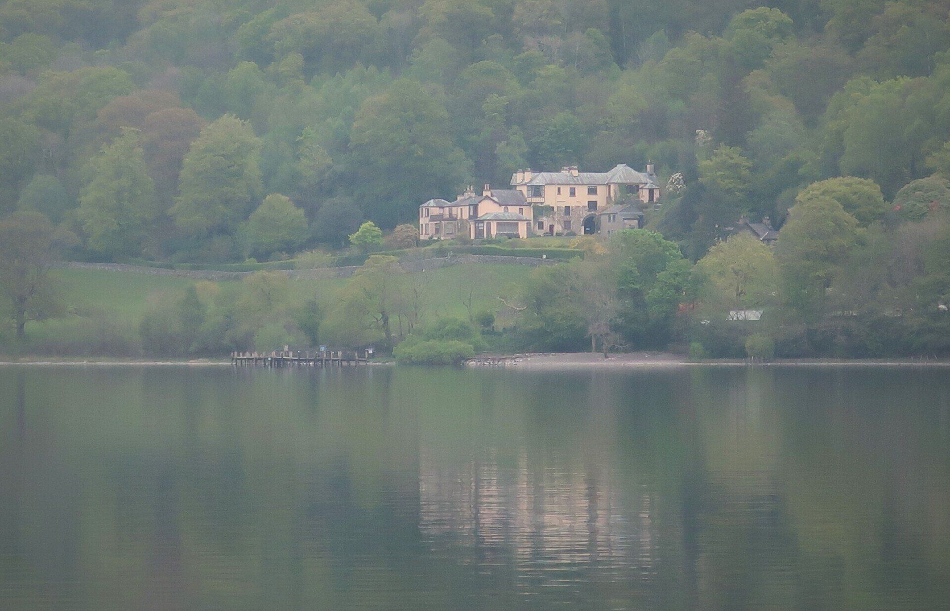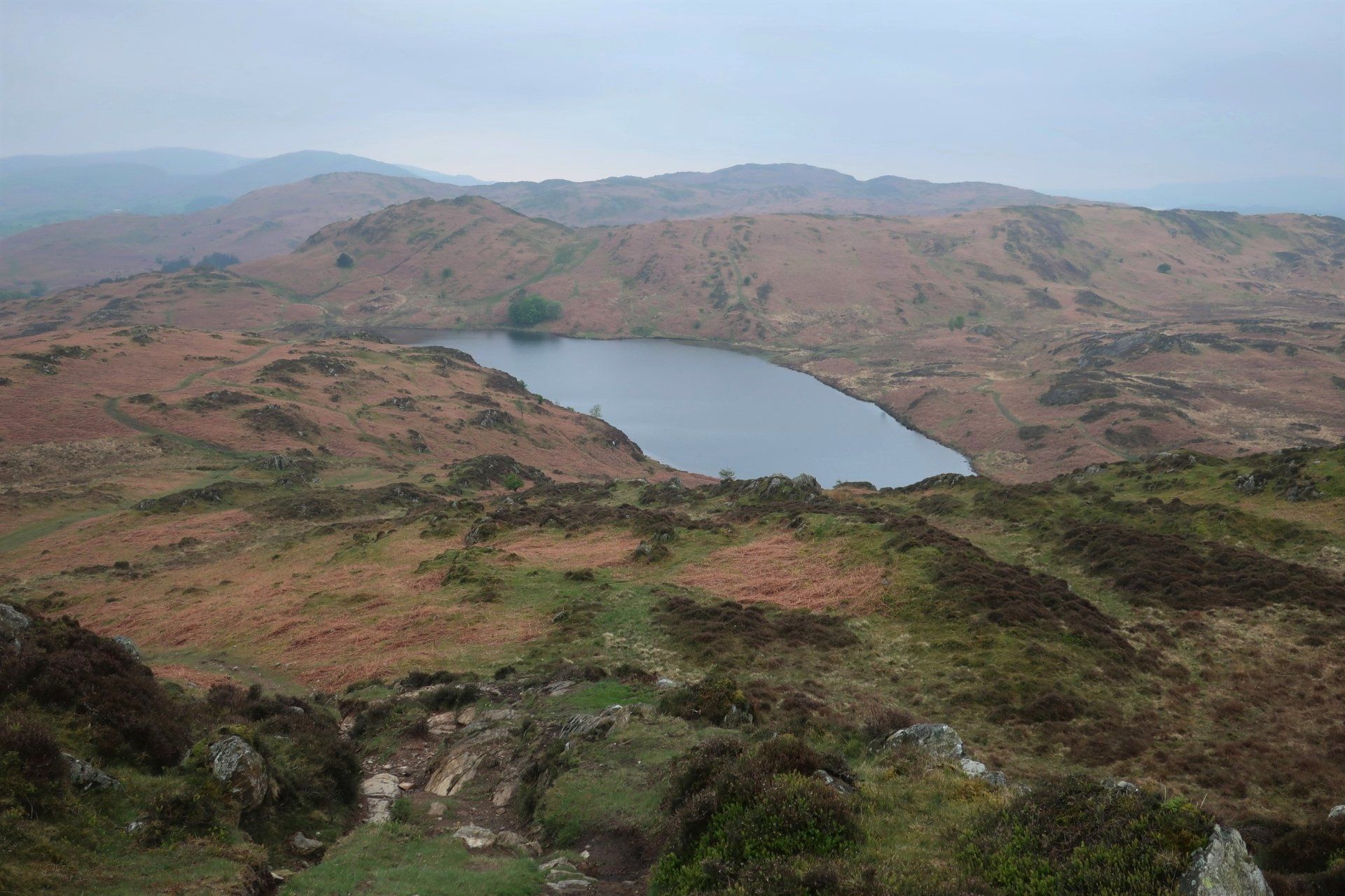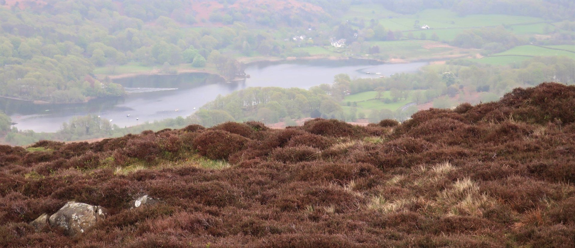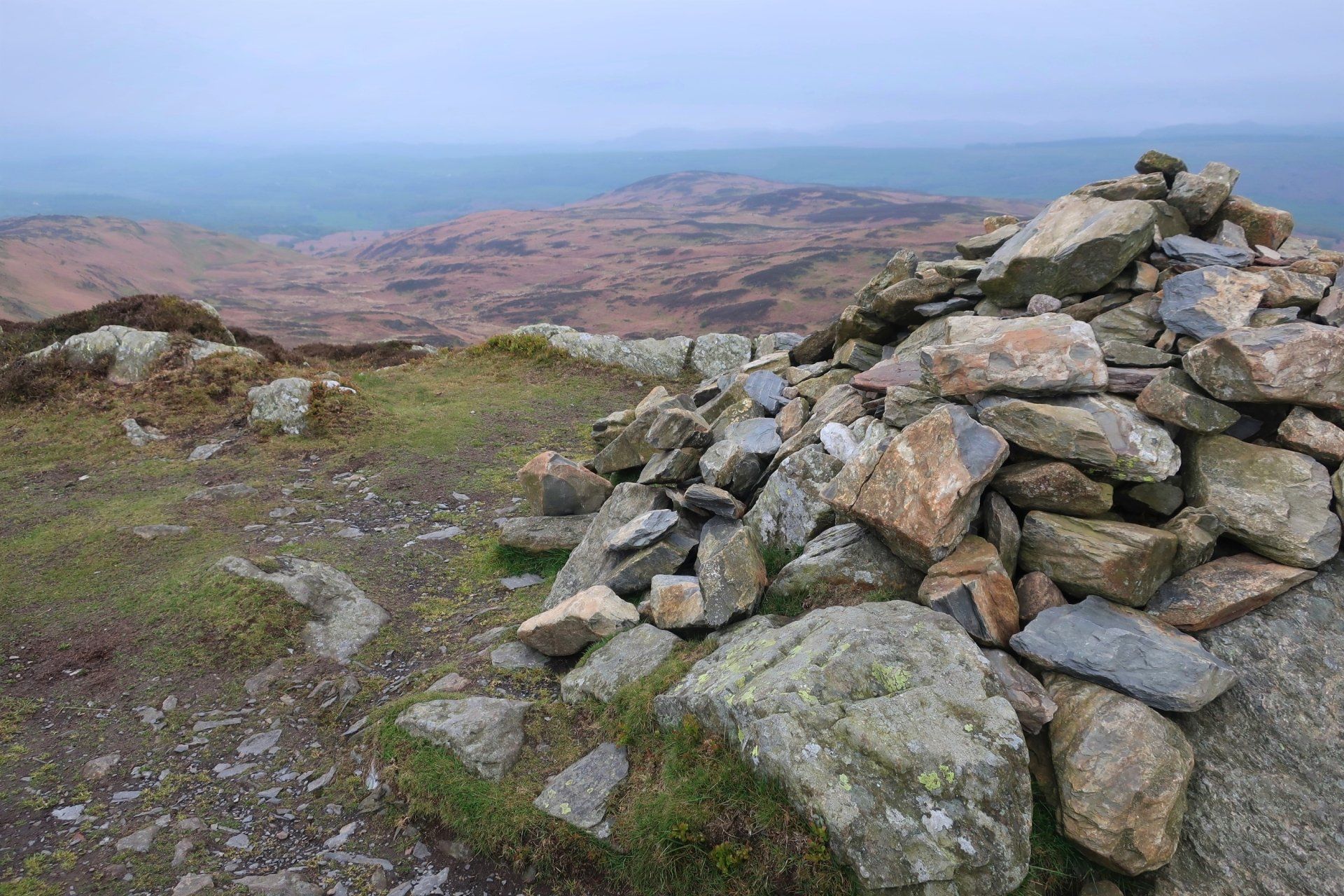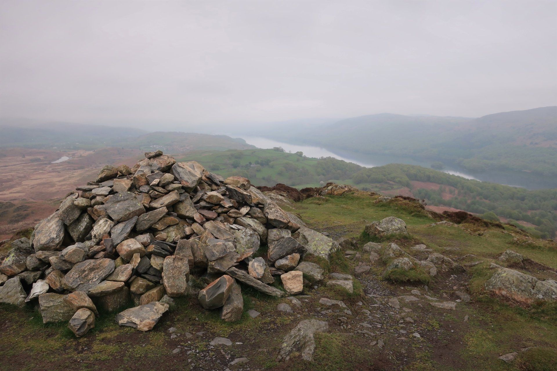 I can spy a couple of hikers on the far shore, which is the official route but I remain to the East and climb to the summit of nearby Beacon Fell, a 255 metre top, which gives an overview of Coniston Water. This is the one of the largest lakes in the Lake District, noted for being 5 miles long and, to me, synonymous with water speed records and Donald Campbell. Unfortunately, the mist limits the view, but Coniston still looks tantalising and in the other direction I can just make out Morecambe Bay (whose immense sandflats had impressed me yesterday whilst passing on my train journey)