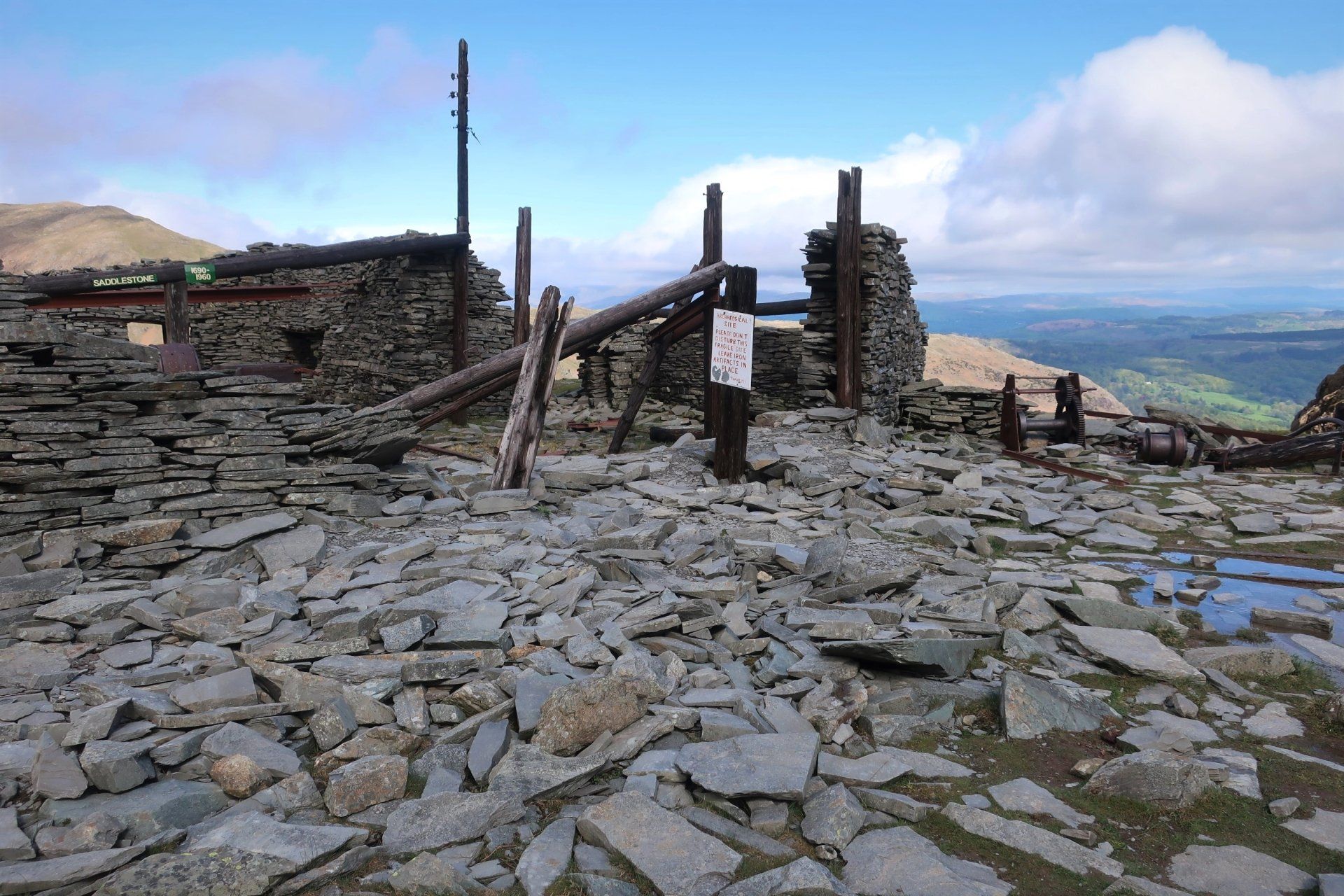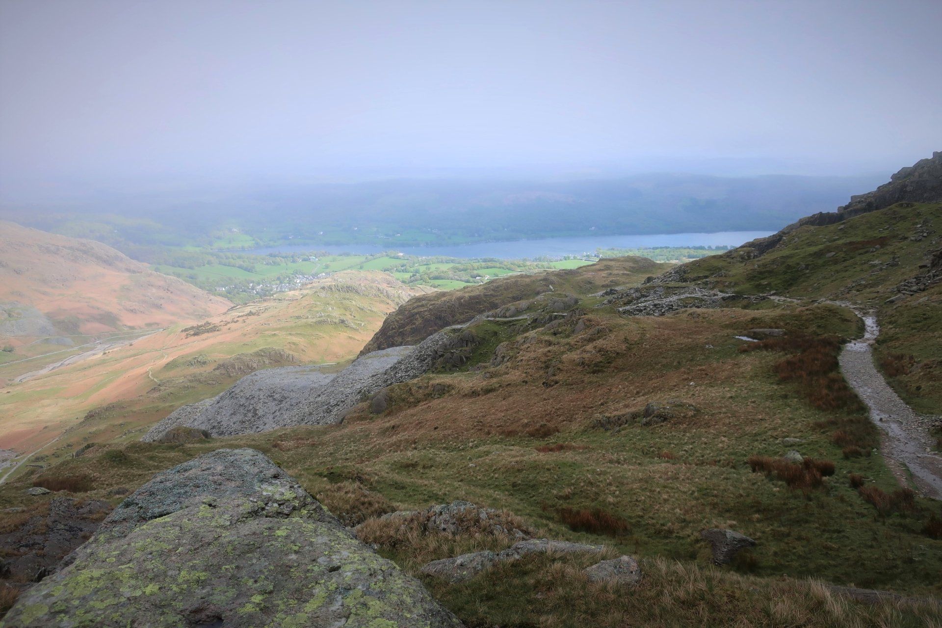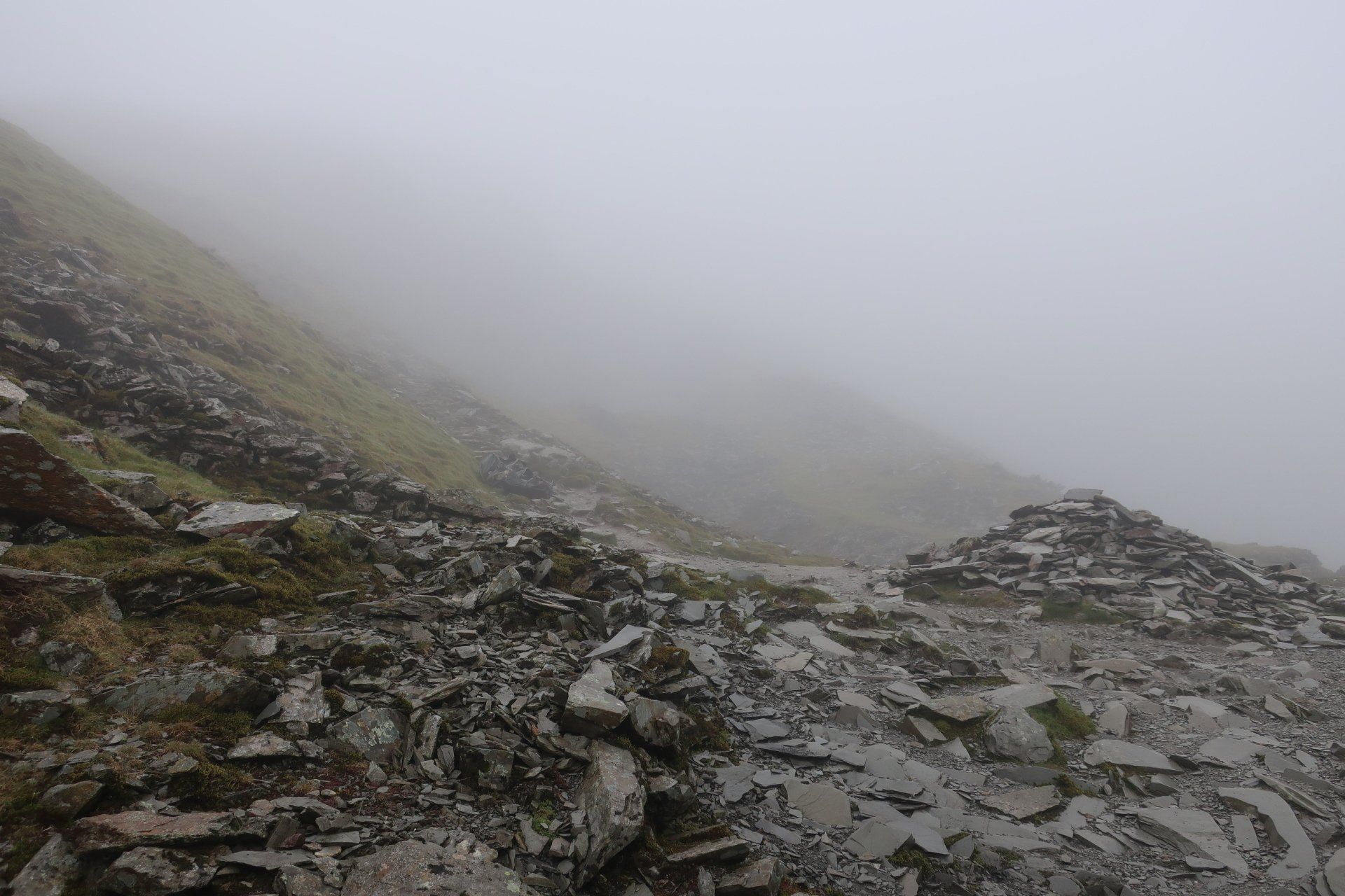 By the time I have returned to Low Water the visibility is improving from that of my ascent, although still poor. I am stopped by a foursome on the way up asking about conditions, with 2 of them opting to turn around, not the first I have seen do that today. A little after this I break through into sunshine and the views open up. At the slate mine workings, the ground is more or less dry, this soaked on my way up. The summit is still well covered but the higher areas seem reasonably clear now…how things change quickly on hills and mountains. I stop and have a snack break, take a few photos and enjoy the view. Coniston Water looks fabulous. This is more like it
