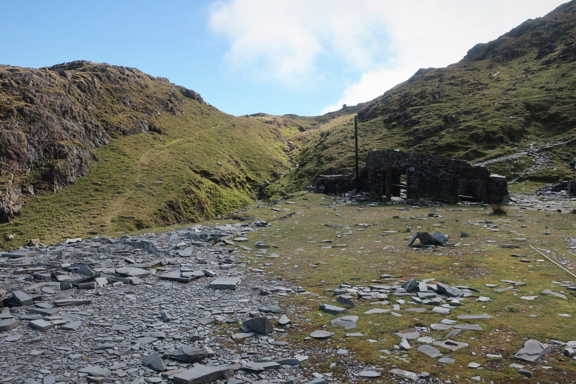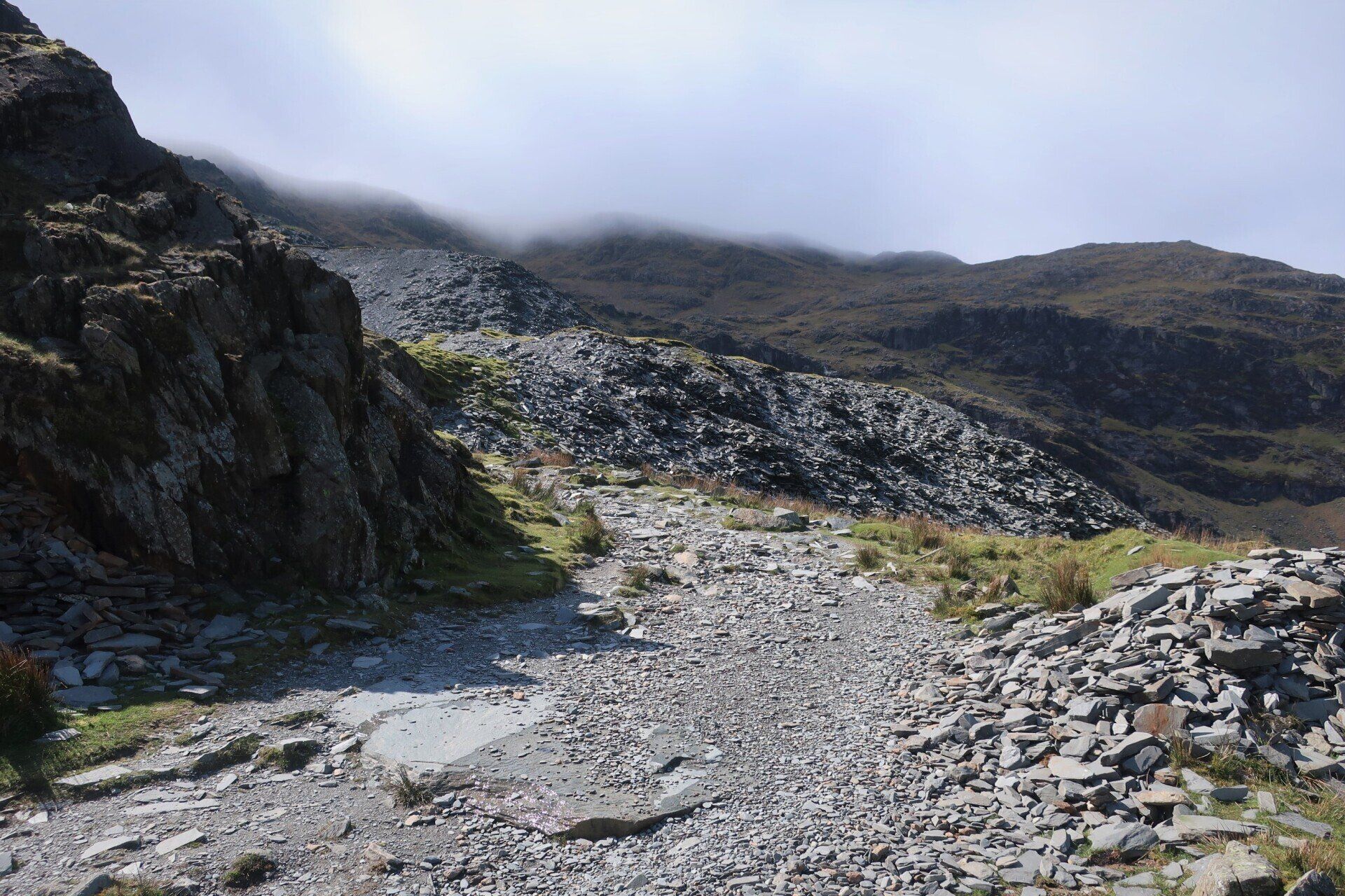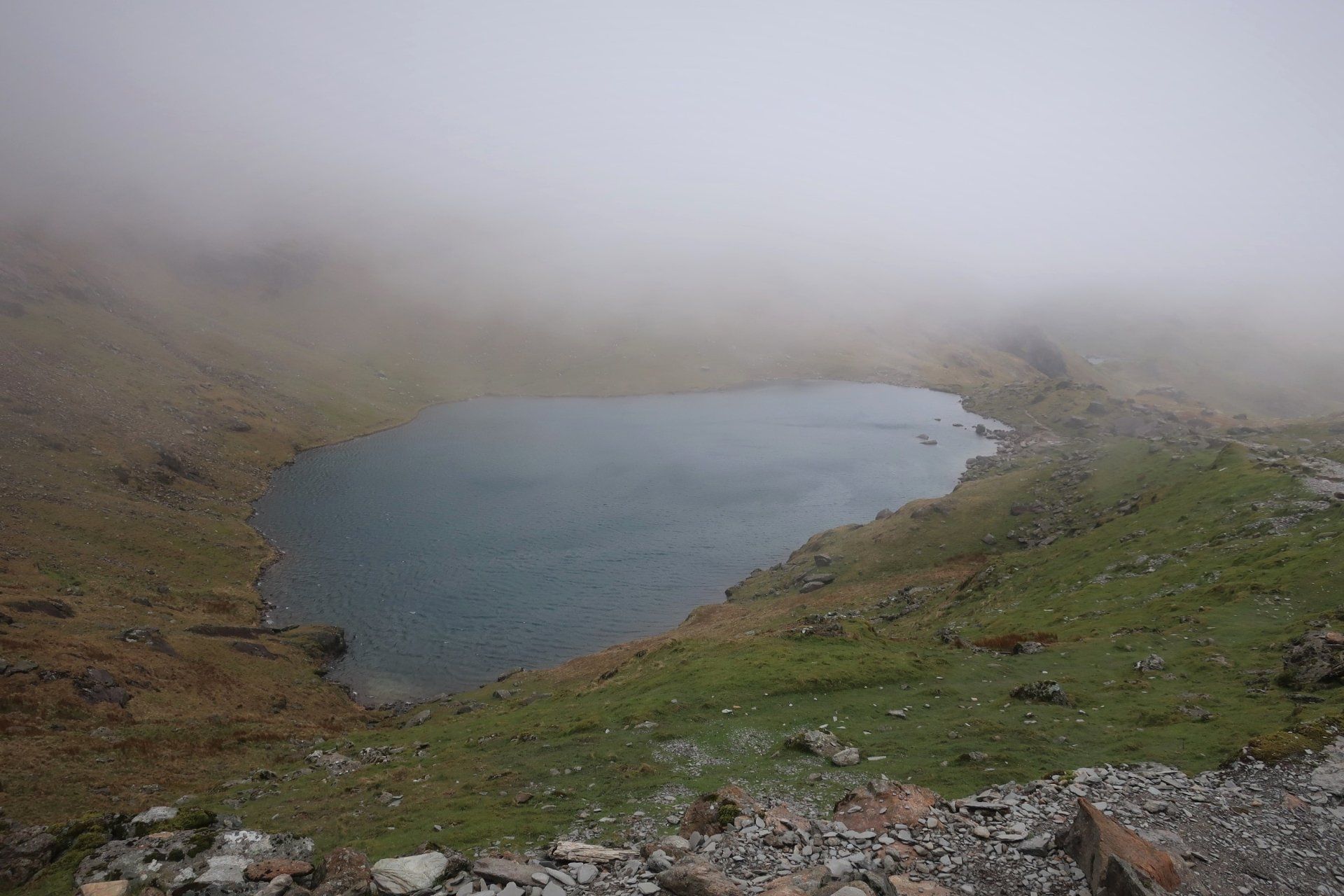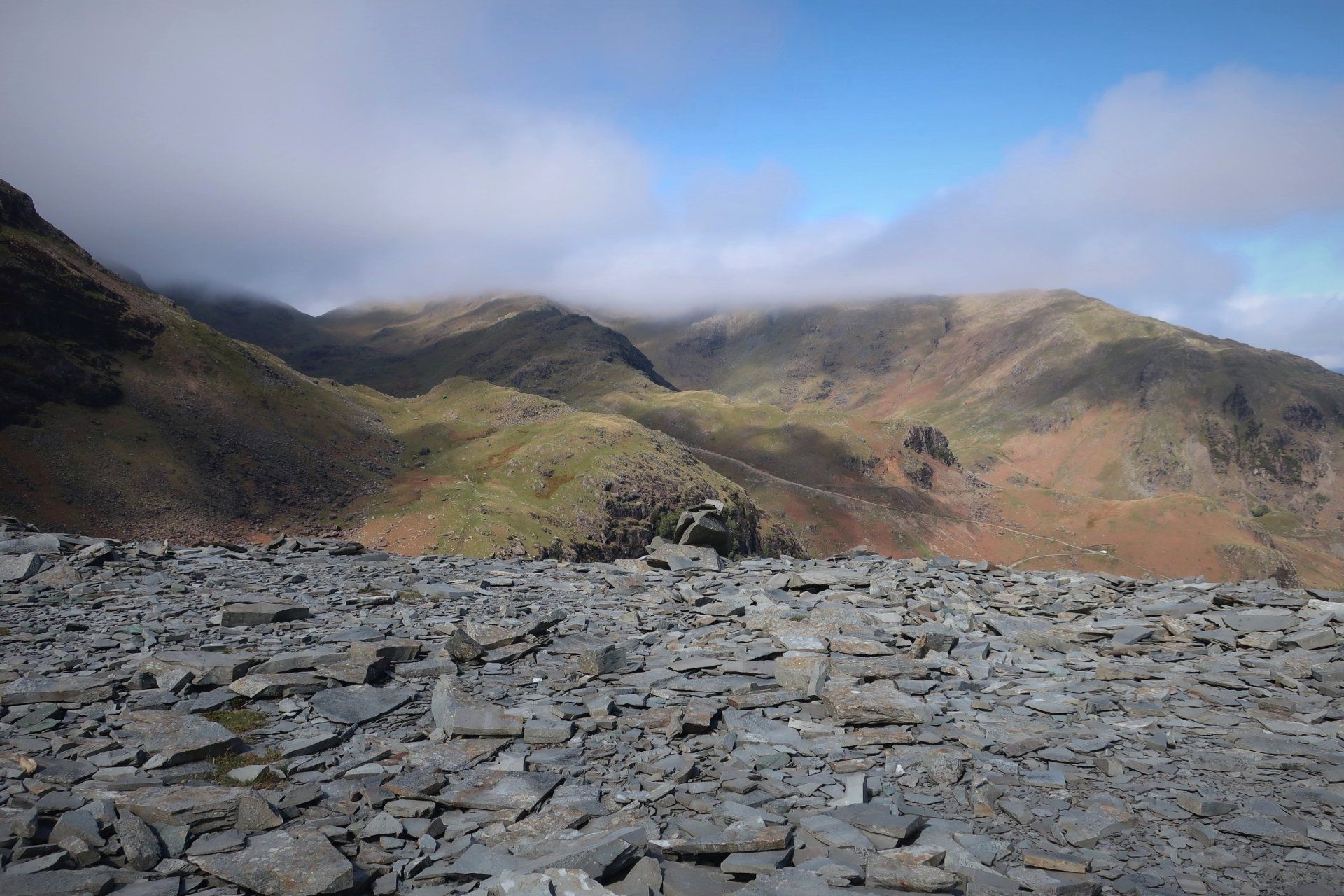 By the time I have returned to Low Water the visibility is improving from that of my ascent, although still poor. I am stopped by a foursome on the way up asking about conditions, with 2 of them opting to turn around, not the first I have seen do that today. A little after this I break through into sunshine and the views open up. At the slate mine workings, the ground is more or less dry, this soaked on my way up. The summit is still well covered but the higher areas seem reasonably clear now…how things change quickly on hills and mountains. I stop and have a snack break, take a few photos and enjoy the view. Coniston Water looks fabulous. This is more like it