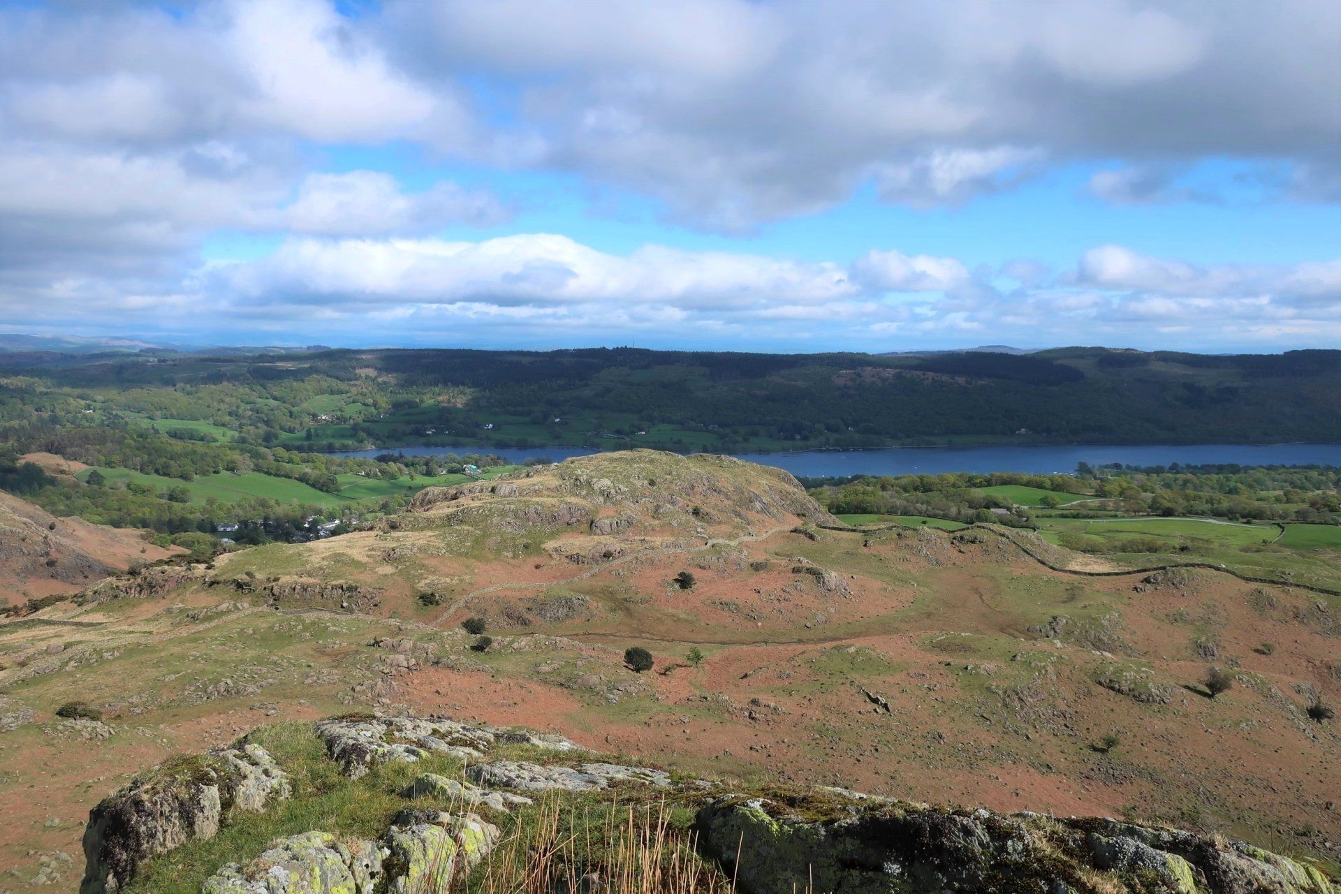 From here I can see there is a small hill that overlooks Coniston Water with a faint trail showing, so I decide to go exploring and check out the view. Some trekking leads me to the far side and indeed some great panoramas, with colours that pop in the sunshine. Nice