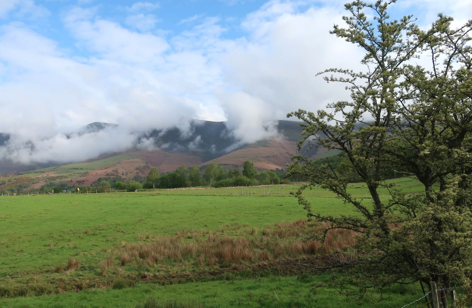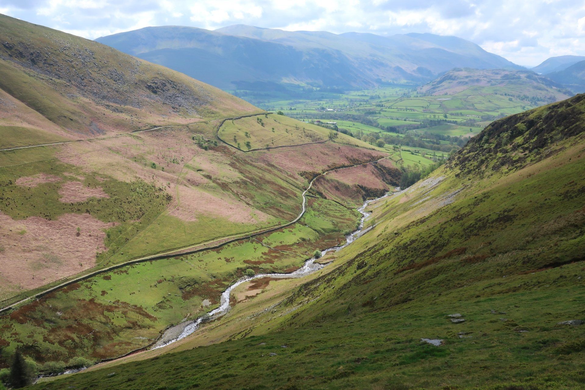 I linger for a while and enjoy, but finely turn around and head for the big stuff, in particular Skiddaw. The summit (at just over 3000ft) is still covered but the slopes dappled with sunshine and the winding track up clear. It is a busy Saturday morning and there are masses of people walking, running, even cycling up. Tempting (sort of) but not for me today, instead I skirt around and head into Glenderaterra Valley