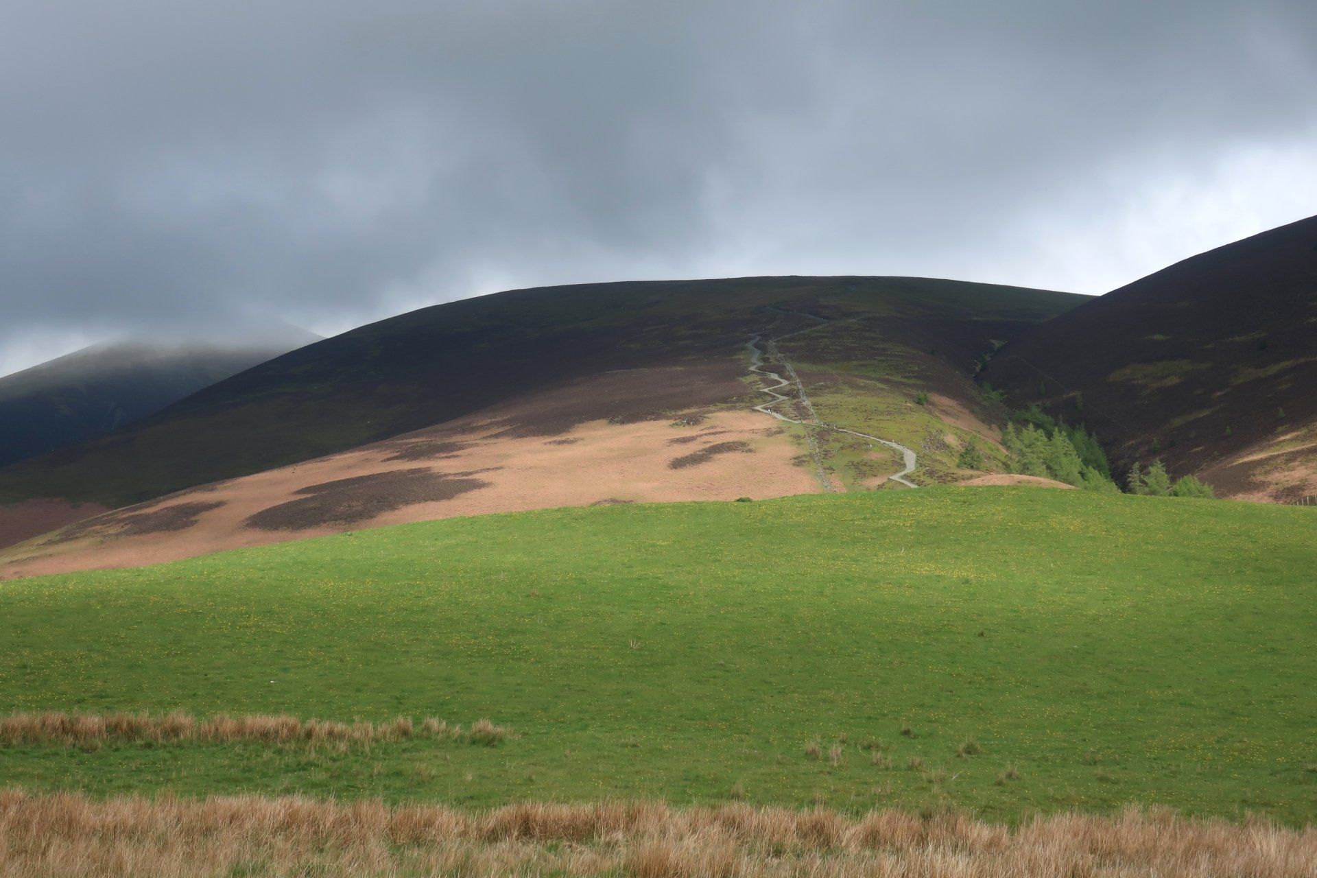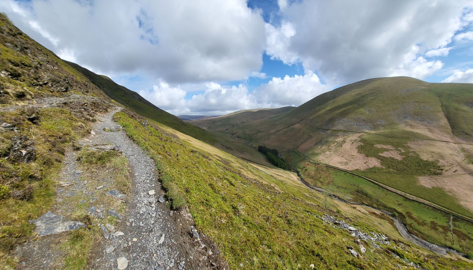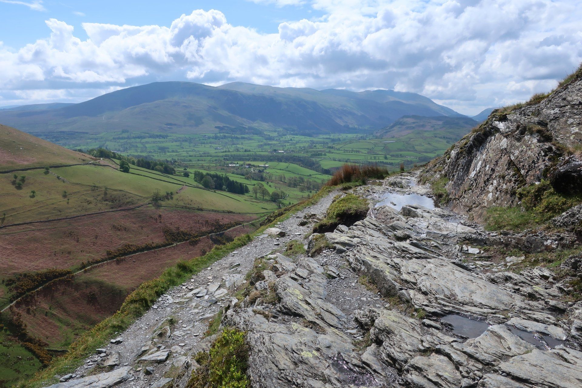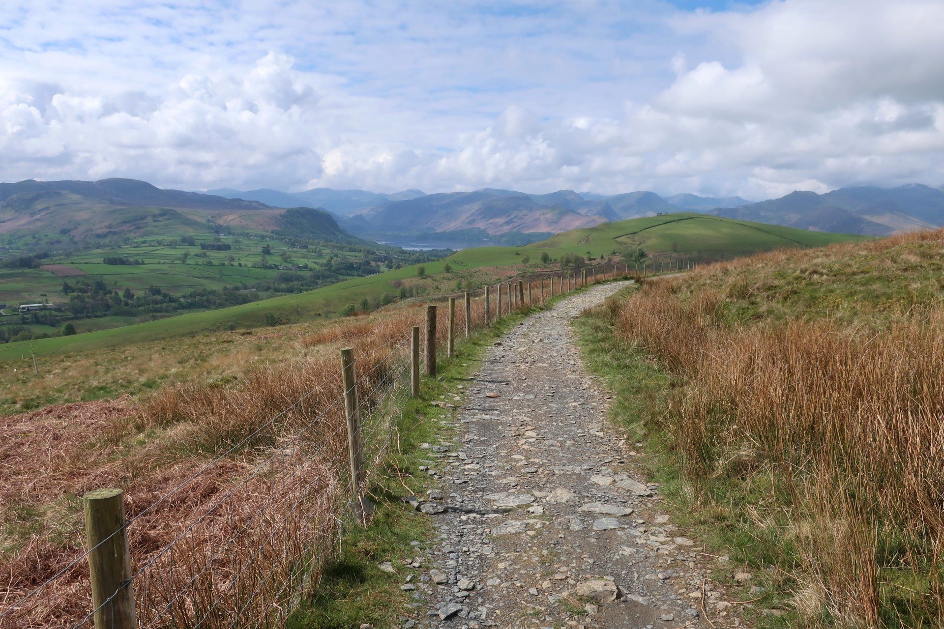 This is much quieter, with tracks soon leading me onto a path perched high on the sides of the hill, winding around, leading eventually into big, open spaces of Back o’ Skiddaw. Again, the Cumbria Way offers such variety as this is barren, wild space, being away from everything. With the clear skies, sun shining, the temperature pleasant, this is lovely