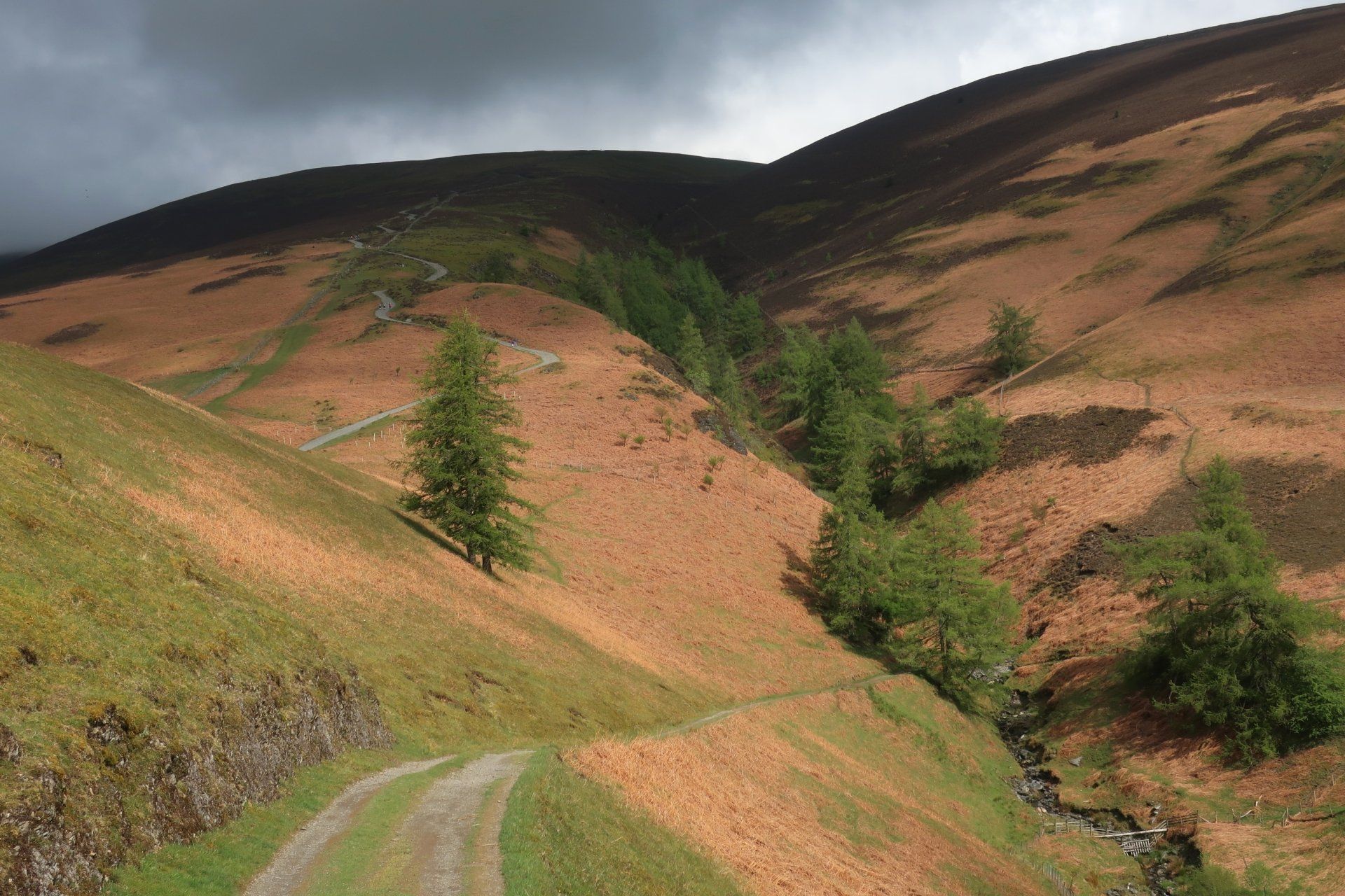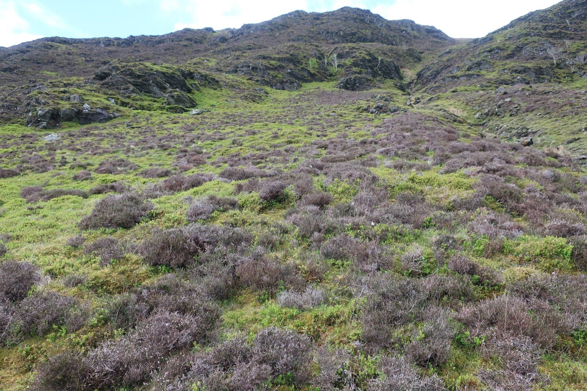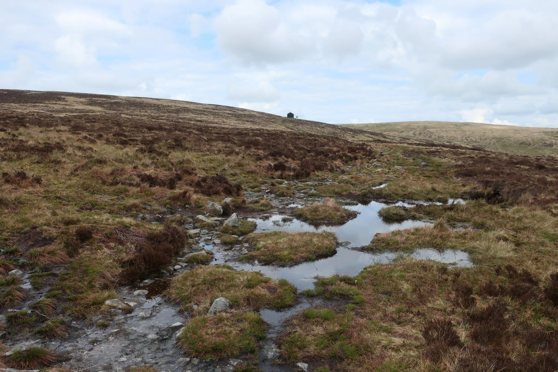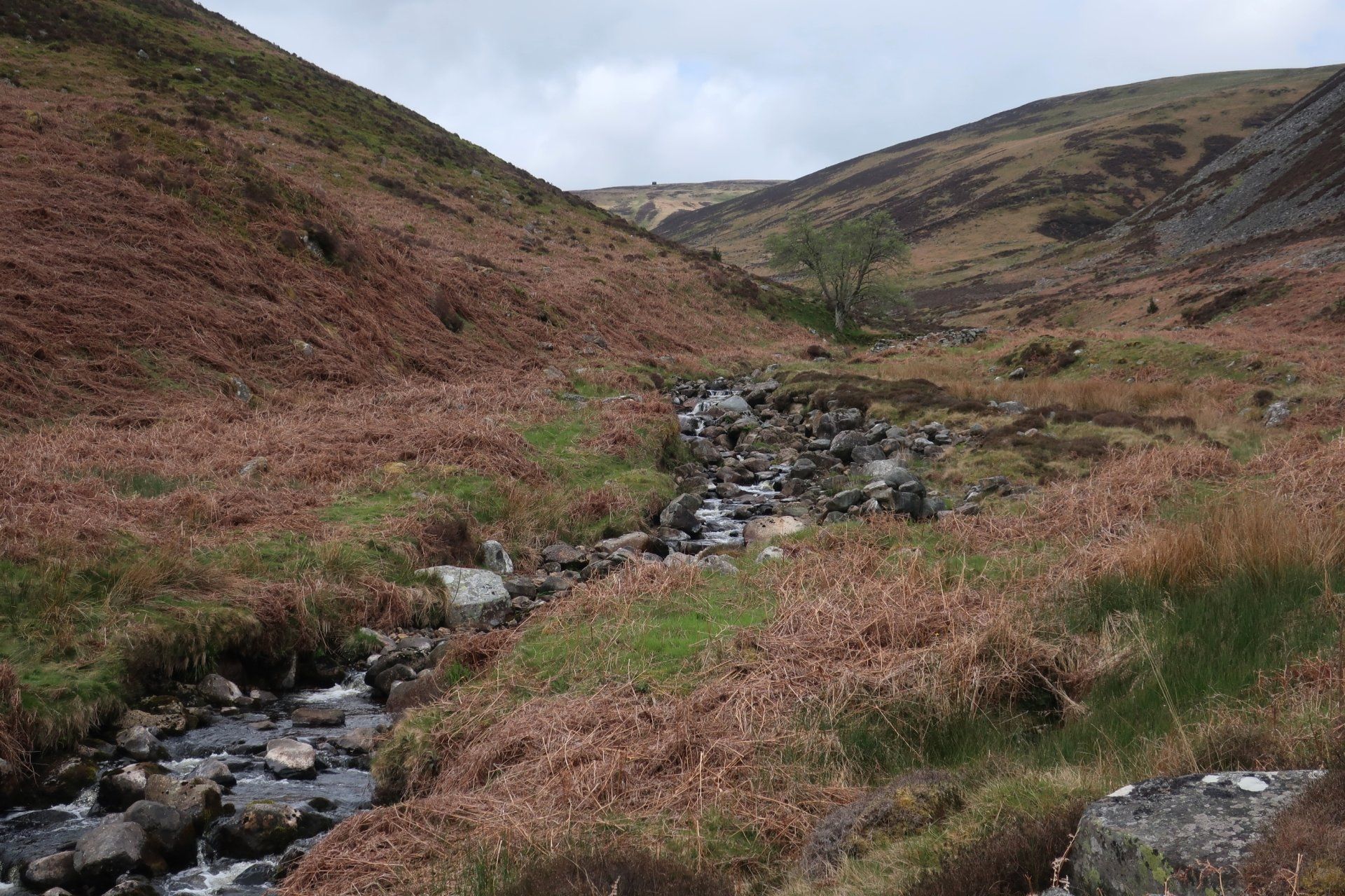 A change in direction and I track the beginnings of the Caldew, a waterway I will be following tomorrow when it has developed into a proper river, this eventually leading me to an offshoot valley, from which I must escape by climbing up and out. This is up to Great Lingy Hill and from my starting point I can see a speck which is the Lingy Hut, my target. The route up (that I take, not all the official route) generally follows the beck, hanging on to the side of the slope, rocky and boggy in places. It is quite intricate so requires full attention, so much so that you sort of forget that you are climbing (well nearly!)