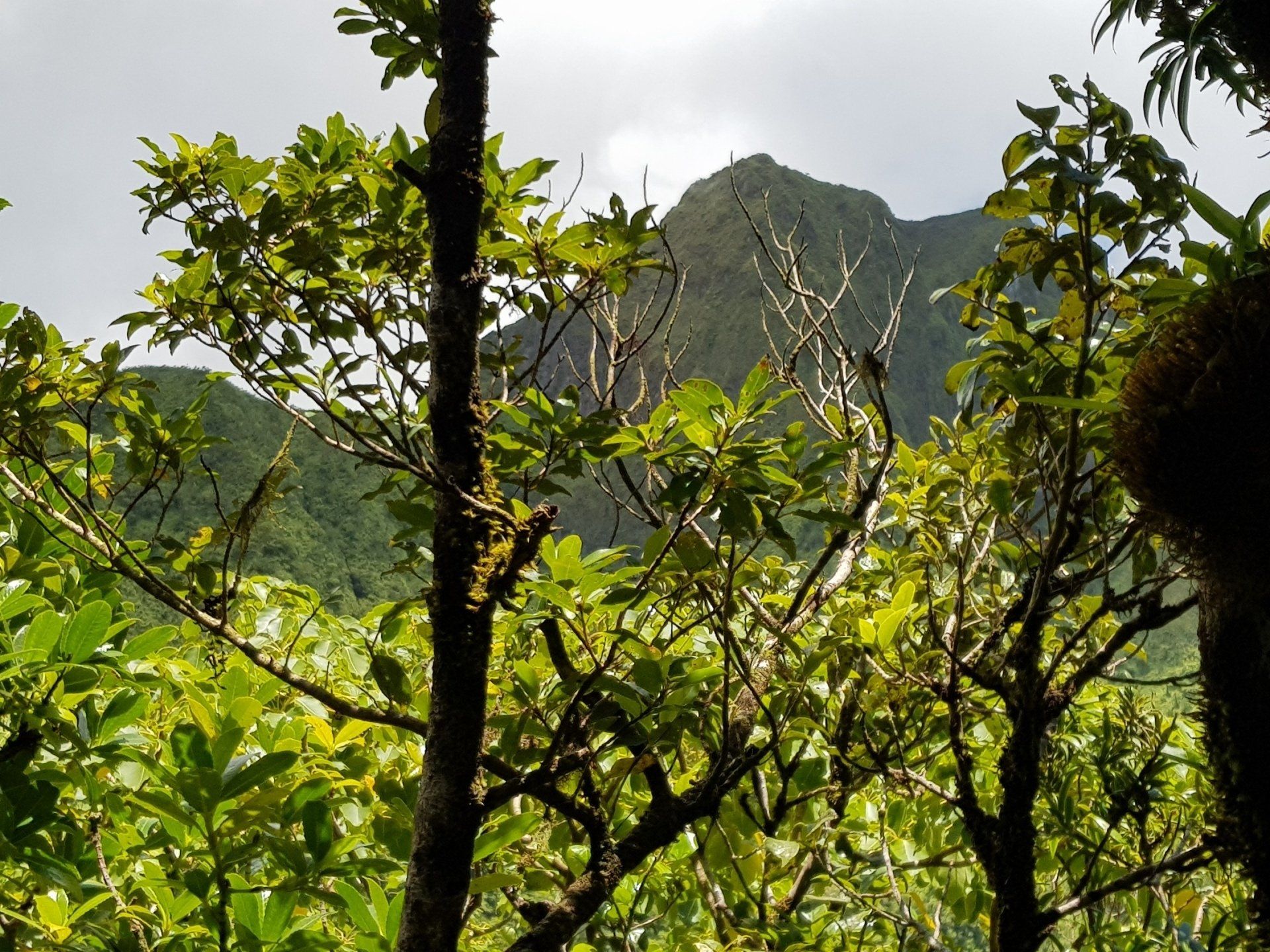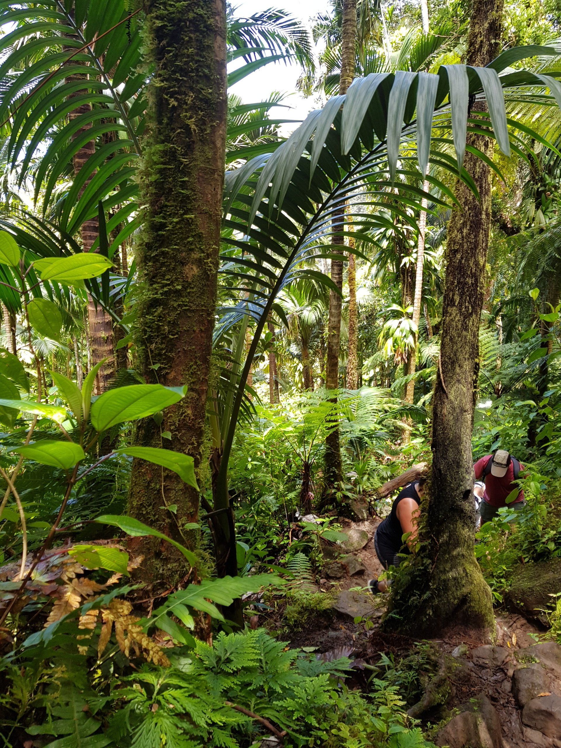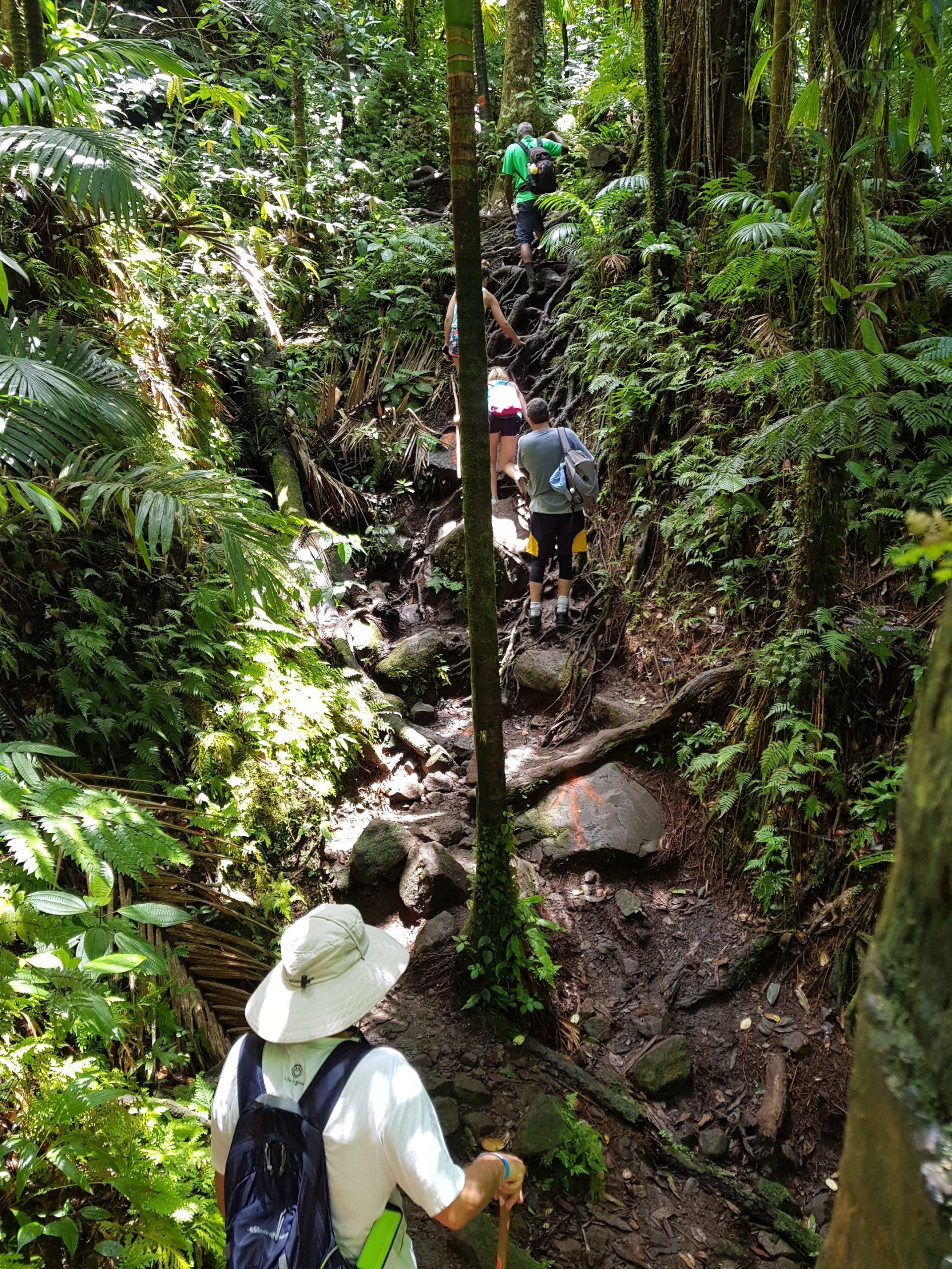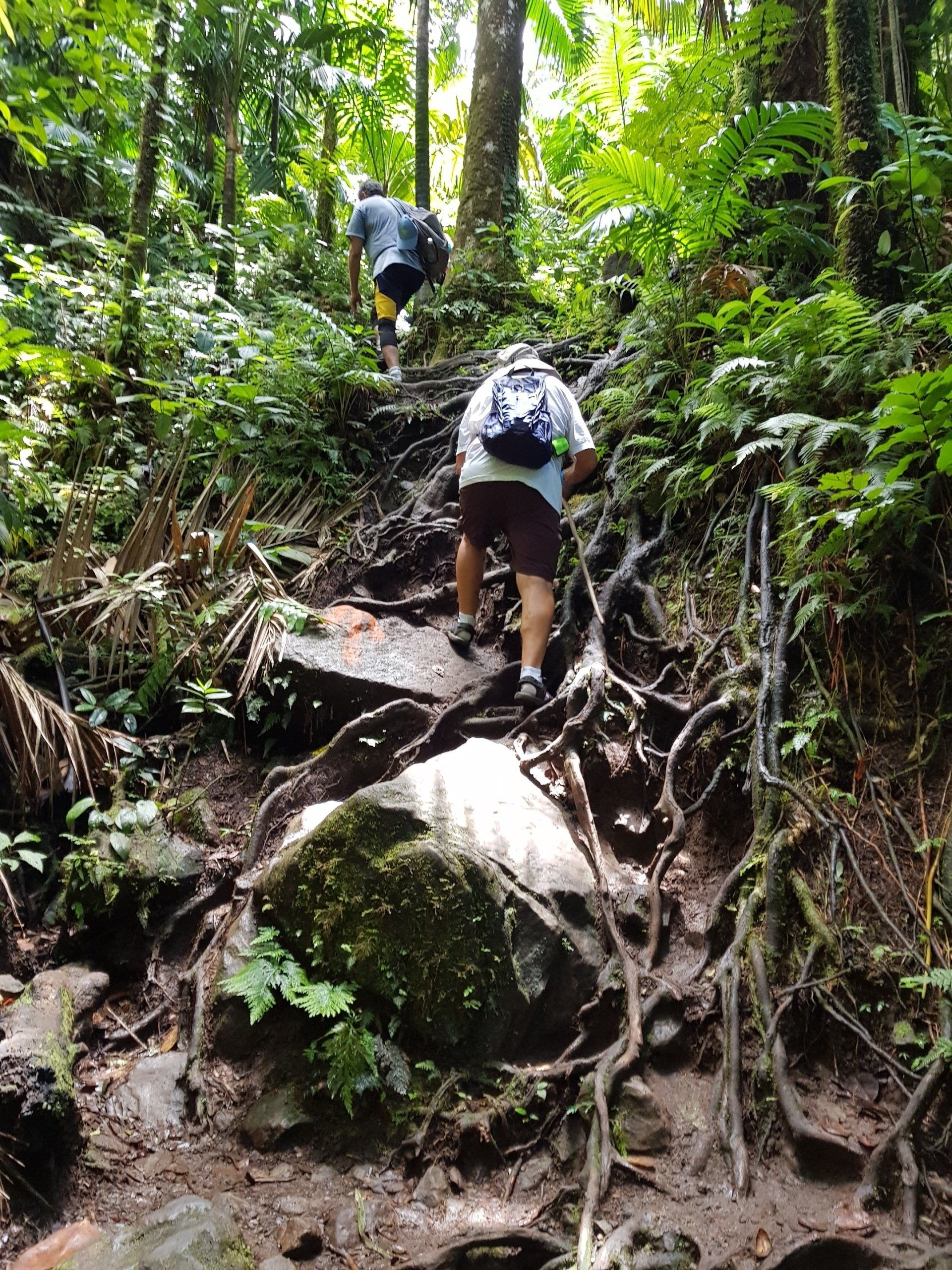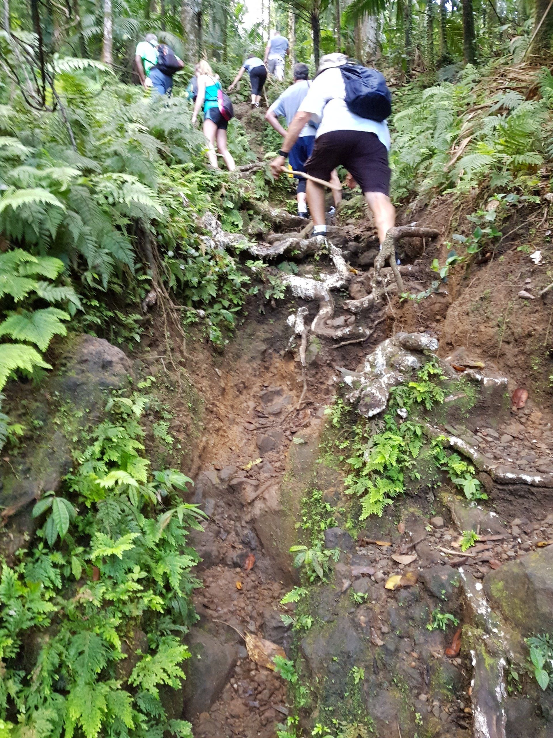 The route weaves though the trees, vines and foliage, along rough authentic trail, mixed with lots of tree roots and some boulders, rising to about 3,000 ft. This is to the rim of the crater of this dormant volcano, not the summit, which is across the crater at 3,792 ft
