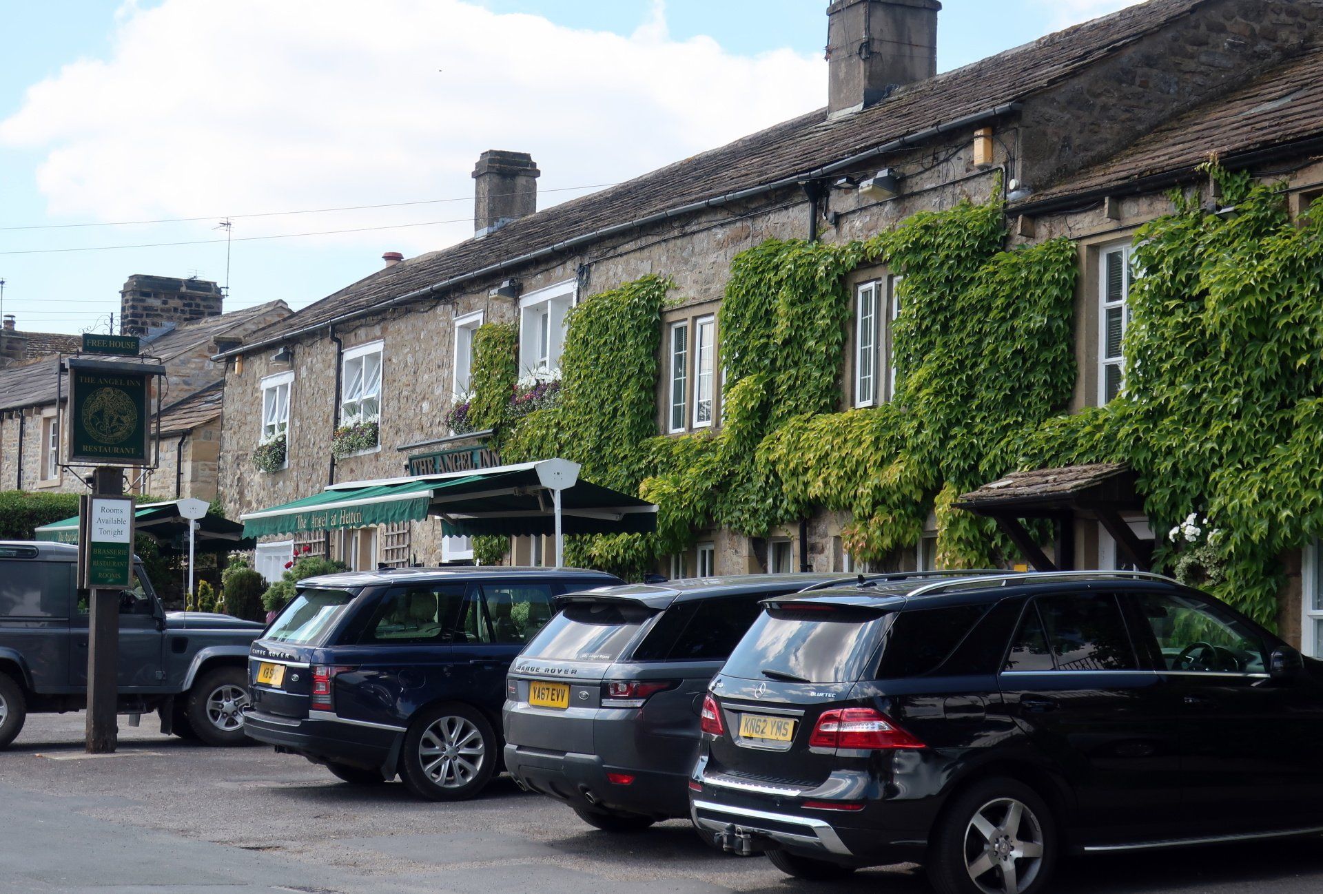Descending from Sharp Haw I pass through a variety of fields, hills and valleys and after about 4 miles reach the tiny village of Hetton, coming across the Angel Inn. Hetton looks a fairly well to do place and this is evidenced by the cars parked outside the Inn – all Range Rovers & Mercs.