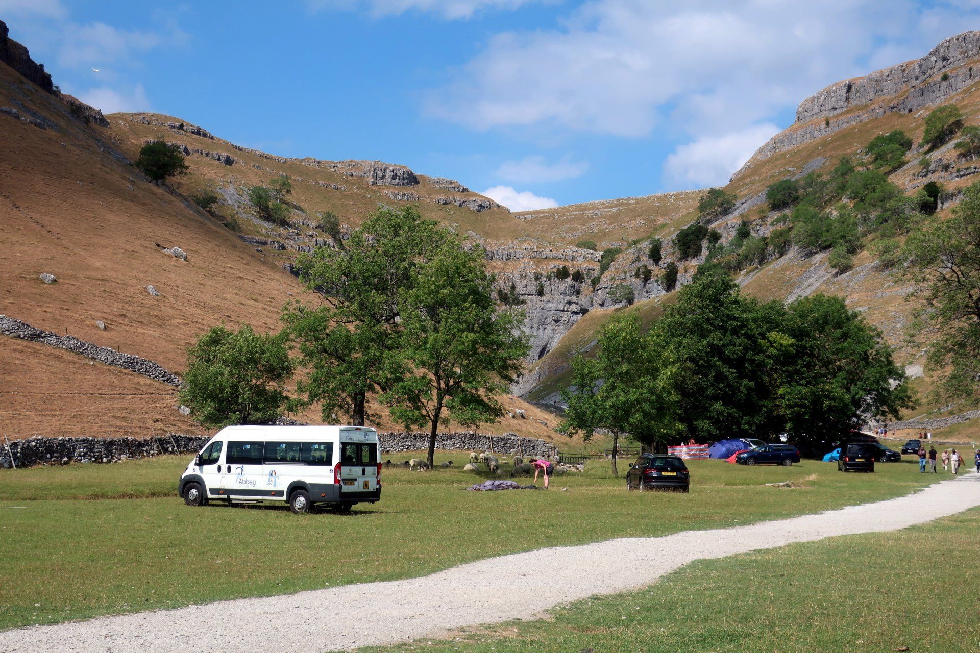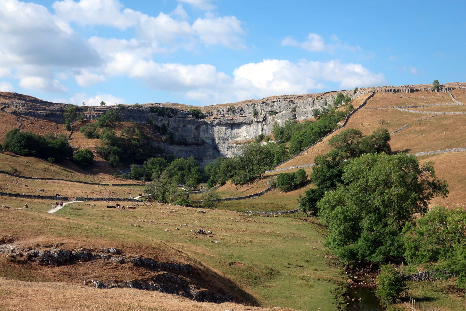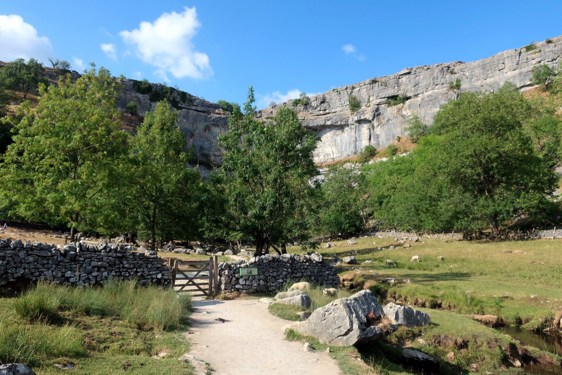 To finish I head up to Malham Cover, probably a couple of miles away. It will actually be on tomorrows route but the weather forecast is not so good and I want to experience in fine weather. The Cove does not disappoint – I really like this. It is a fantastic spectacle, massive limestone slabs at the top, with superb views, and a towering cliff face from the bottom.