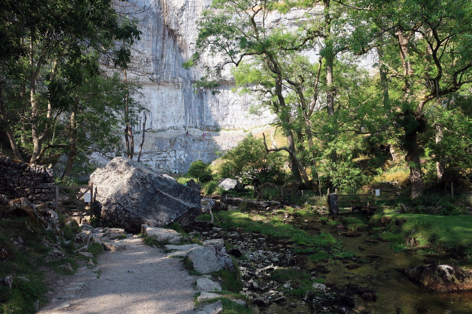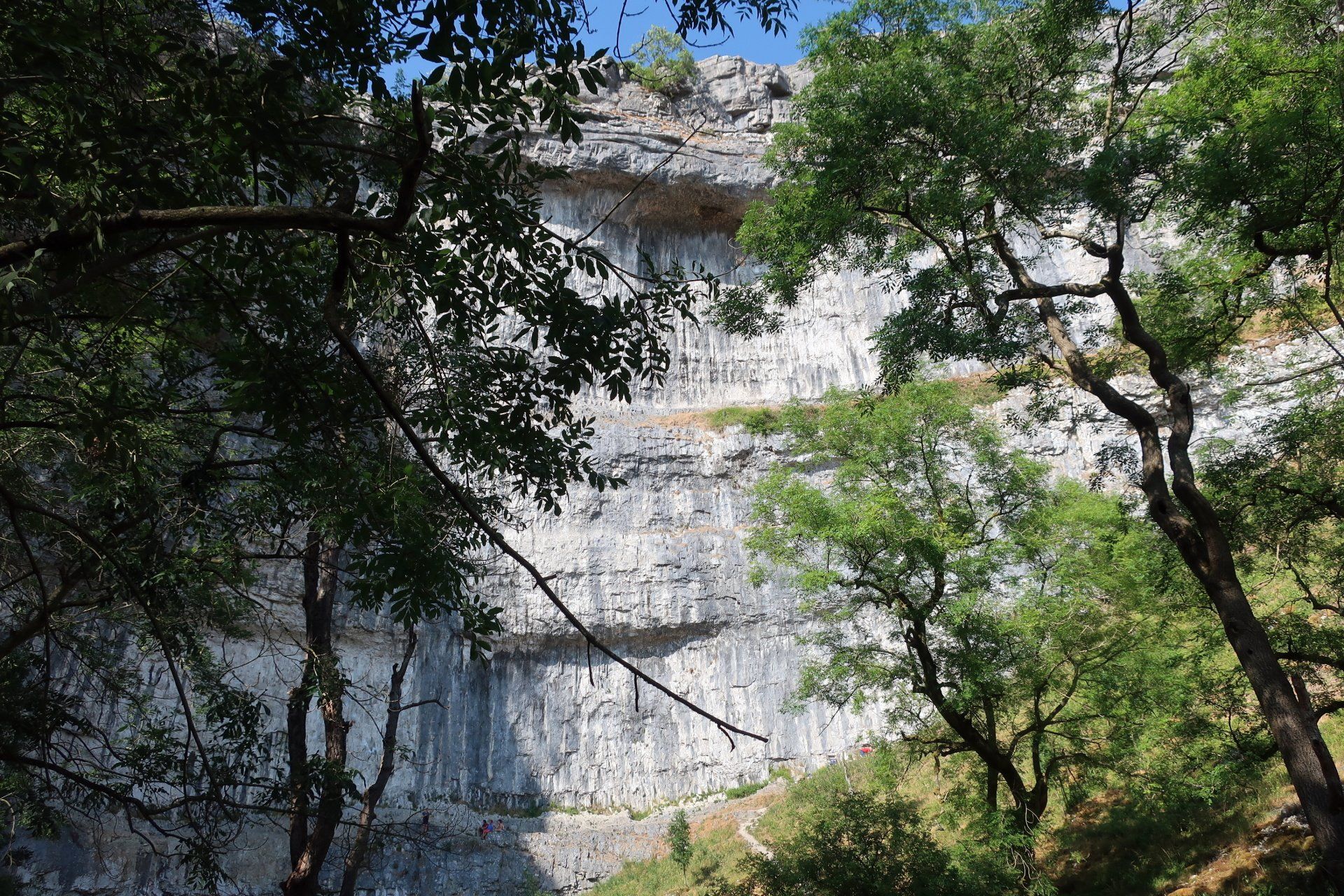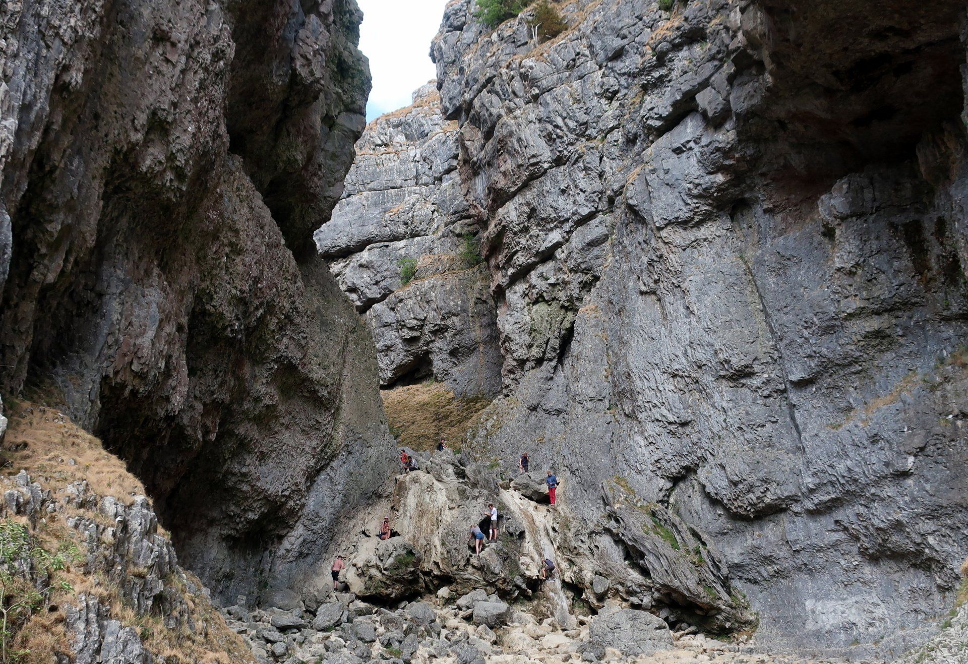 This marks a significant change in the landscape as limestone suddenly becomes much more prevalent. The approach to the scar is impressive, then the path rounds the final corner into a cul-de-sac featuring the cliffs, crags and boulders seen on the picture postcards. It is Sunday afternoon and very busy with walkers, families and a few rock climbers. I watch the climbers for a bit – how do they do that.