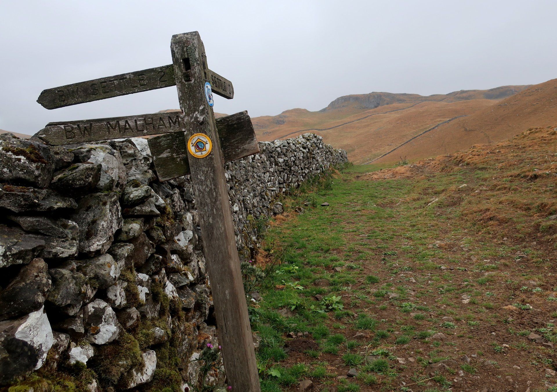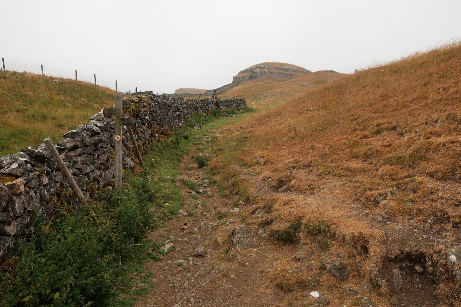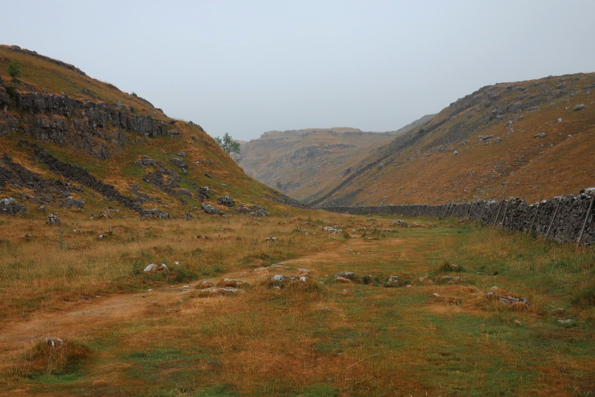 I do like Malham Cove (in all conditions) but one last look back, then I move on up the valley – ironically called Dry Valley. The trail narrows into a V, a mixture of grass and liberal sprinkling of limestone rocks, stones and steps, all very slippery so I rather gingerly make my way up.
