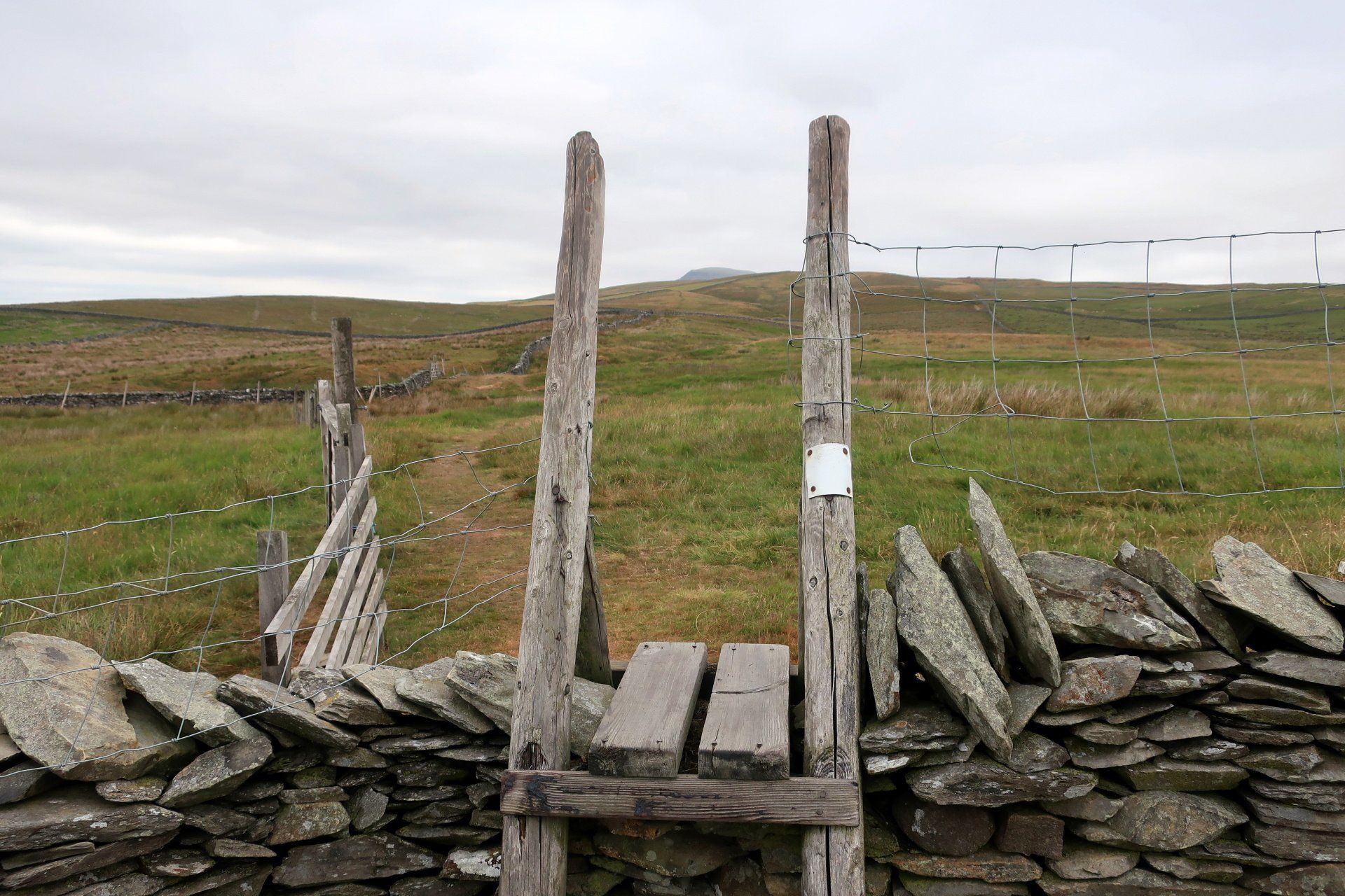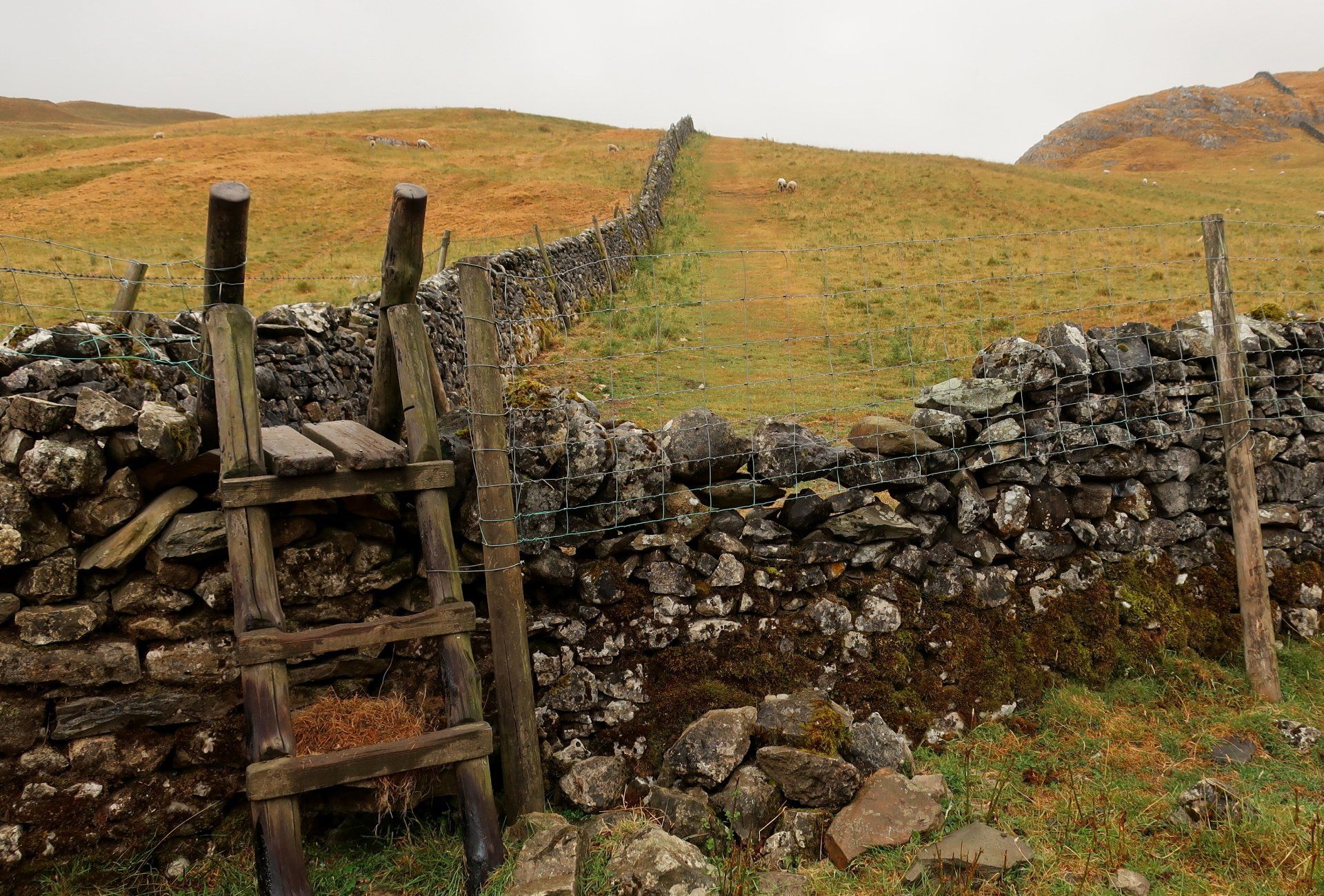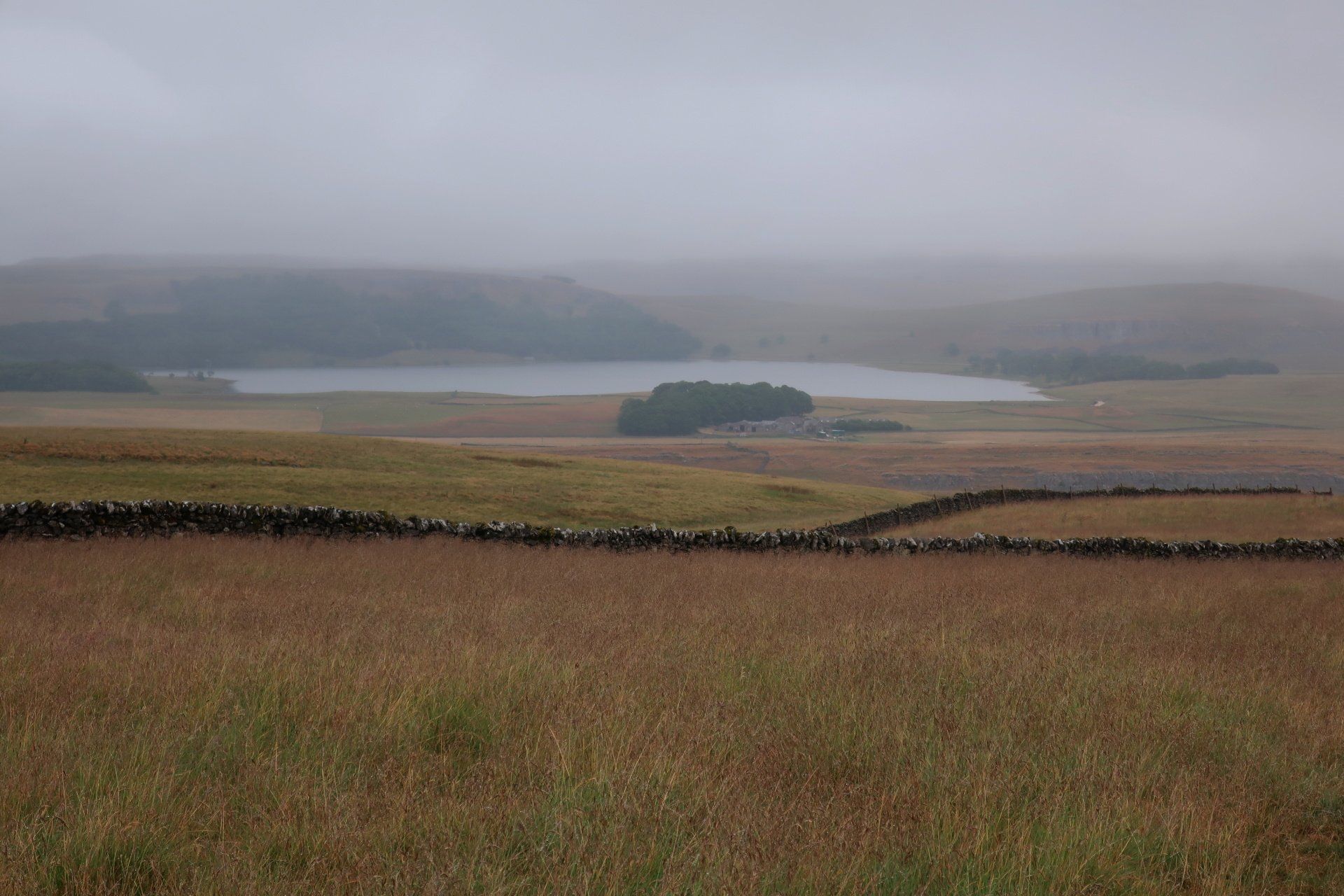 On up the moor and a look back through the murk shows a view of Malham Tarn. It would have been good to go up there yesterday for a look but it was a bit too much in the day. Leaving the Malham area behind the path moves through broad valleys and hills, limestone boulders and crags, generally an isolated mood but then reaching some farms. At Stockdale Farm I pass a huge bull – thankfully the other side of a wall – and take in the power of these animals.
