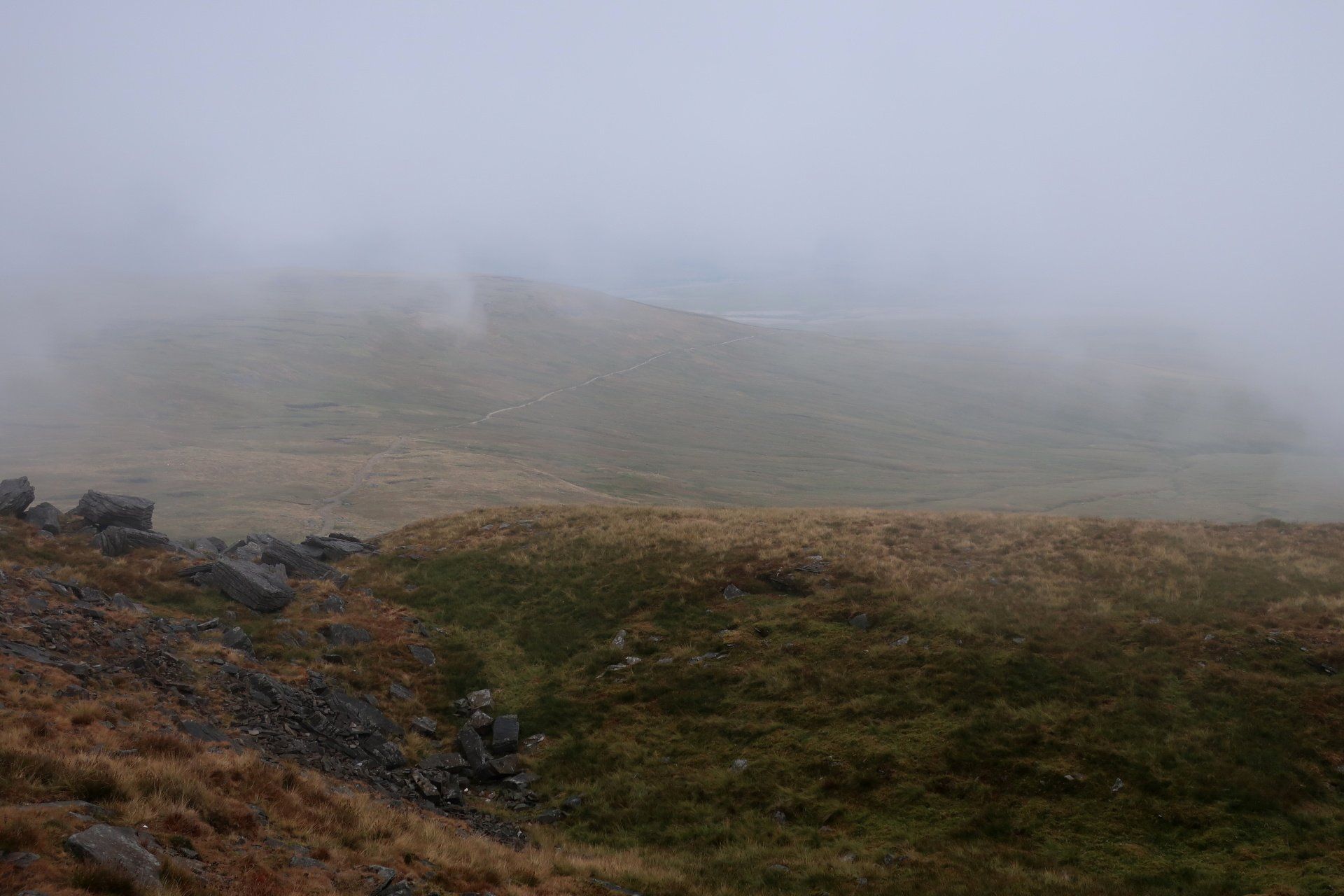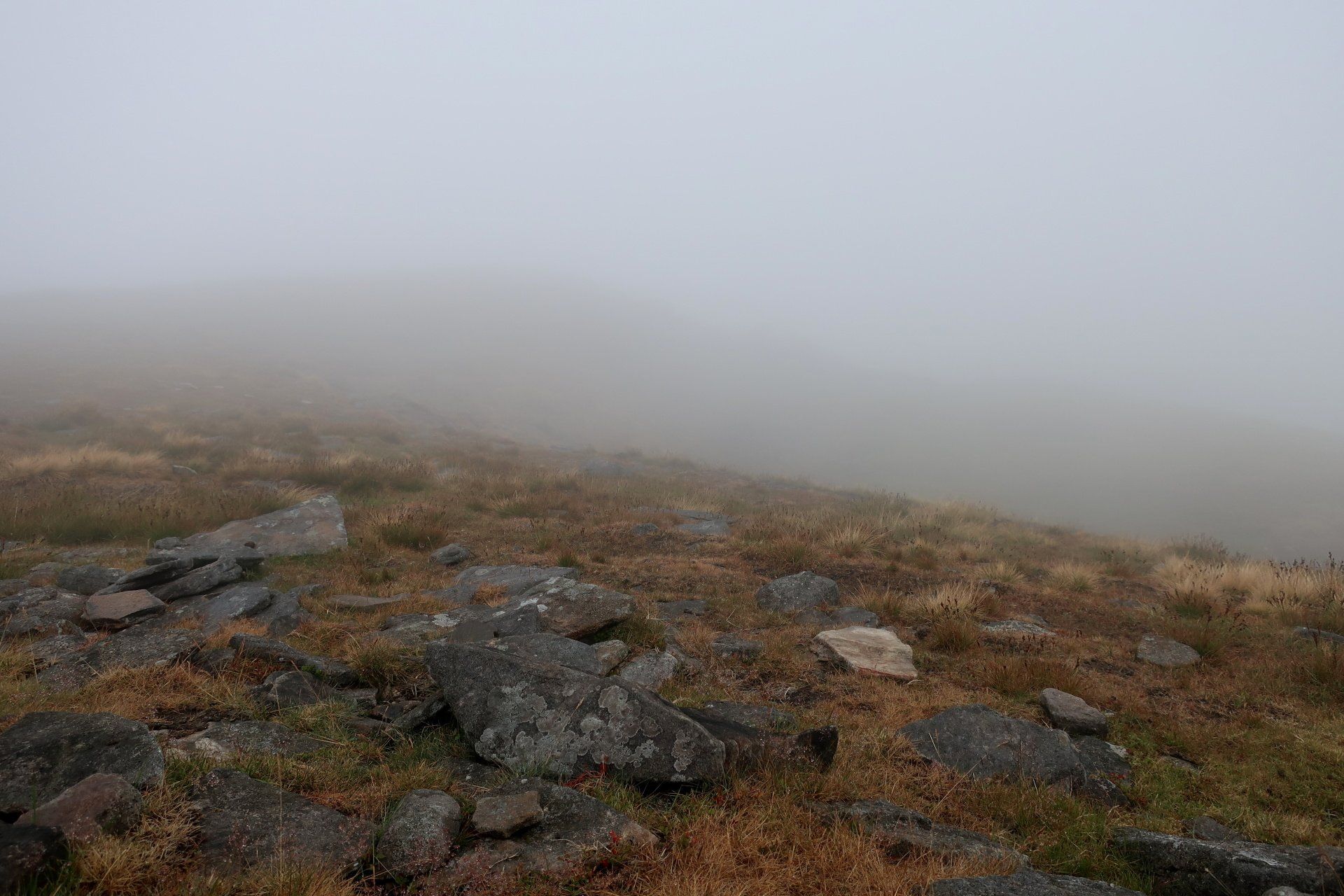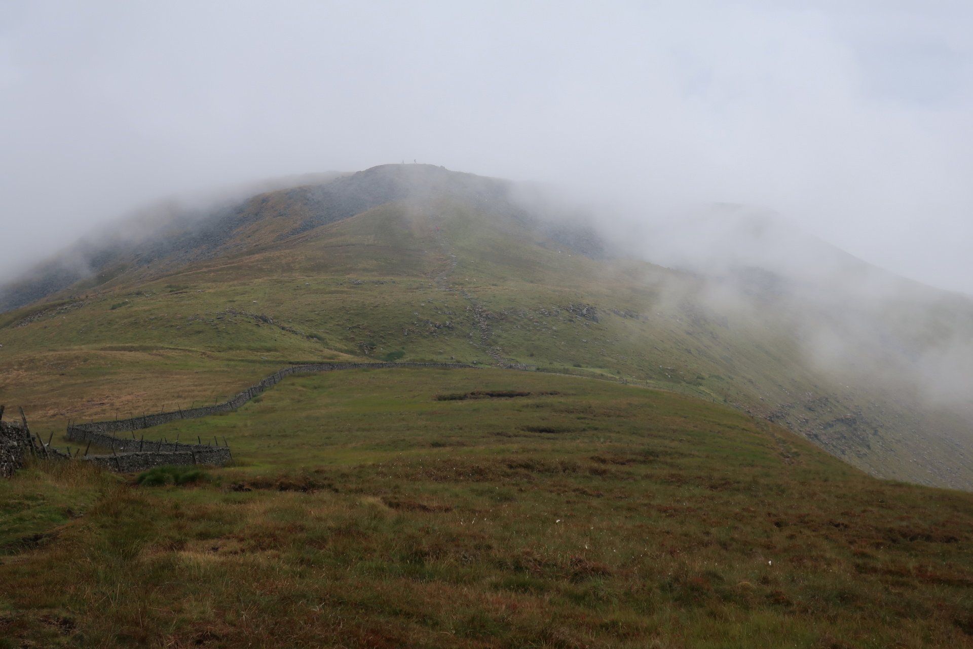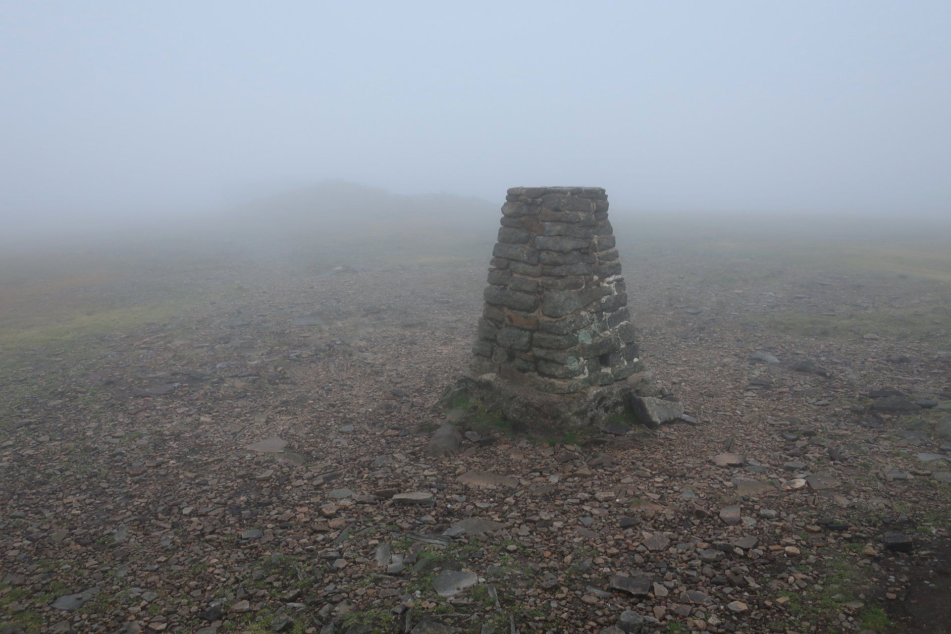 I make my assault on the summit, the last a bit of a scramble (but easy) and come out on top, at which point it starts to rain proper and the mist and low cloud descend. I take shelter behind a convenient wall and have my planned snack. Only problem, I was expecting to be sitting enjoying the view, unfortunately visibility is about 20m. Such a shame. Initially I wait it out but not much changes so I feel I must move on – I don’t want to cool down too much. Off I go into the murk, the plus being the rain has mostly petered out by now.