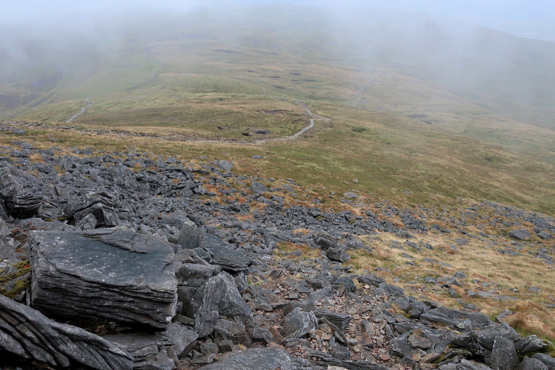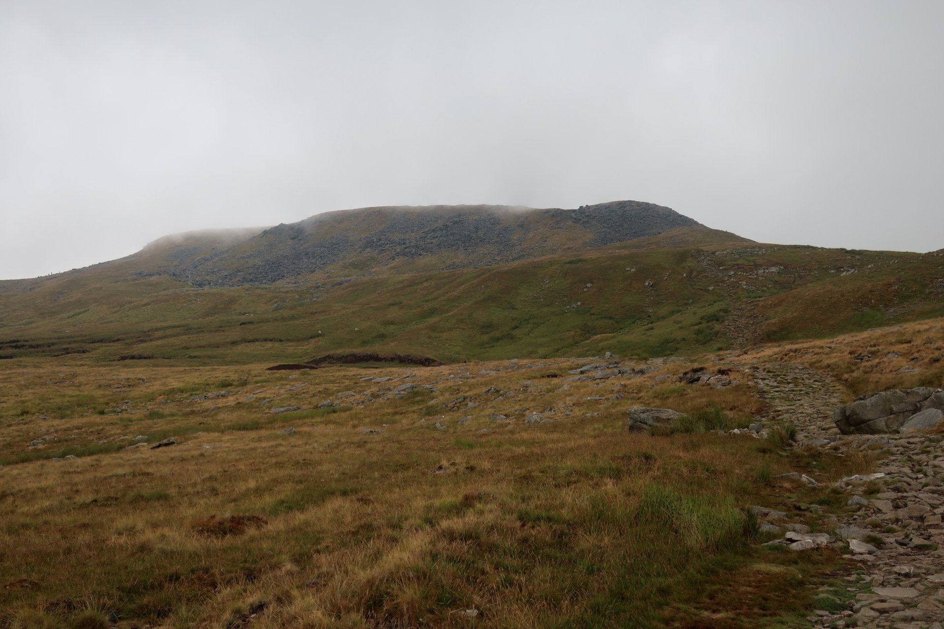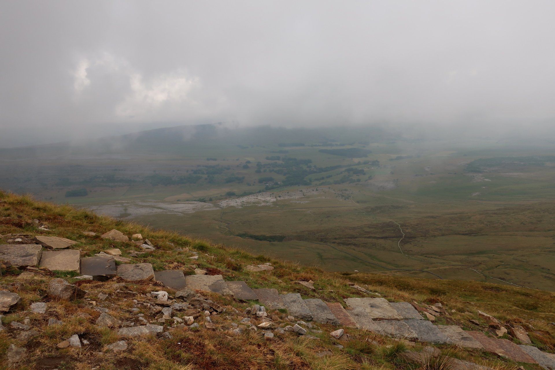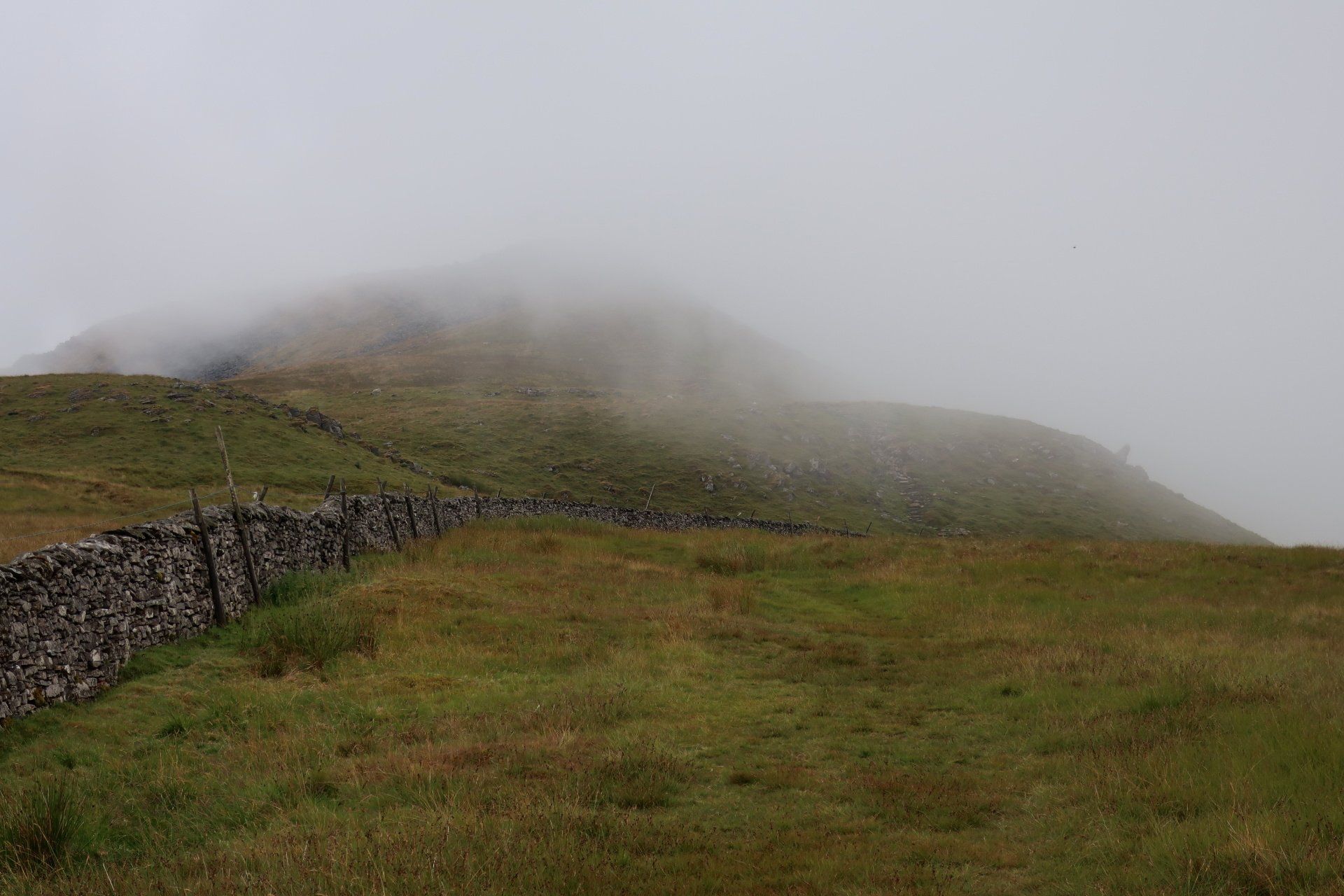 I make my assault on the summit, the last a bit of a scramble (but easy) and come out on top, at which point it starts to rain proper and the mist and low cloud descend. I take shelter behind a convenient wall and have my planned snack. Only problem, I was expecting to be sitting enjoying the view, unfortunately visibility is about 20m. Such a shame. Initially I wait it out but not much changes so I feel I must move on – I don’t want to cool down too much. Off I go into the murk, the plus being the rain has mostly petered out by now.