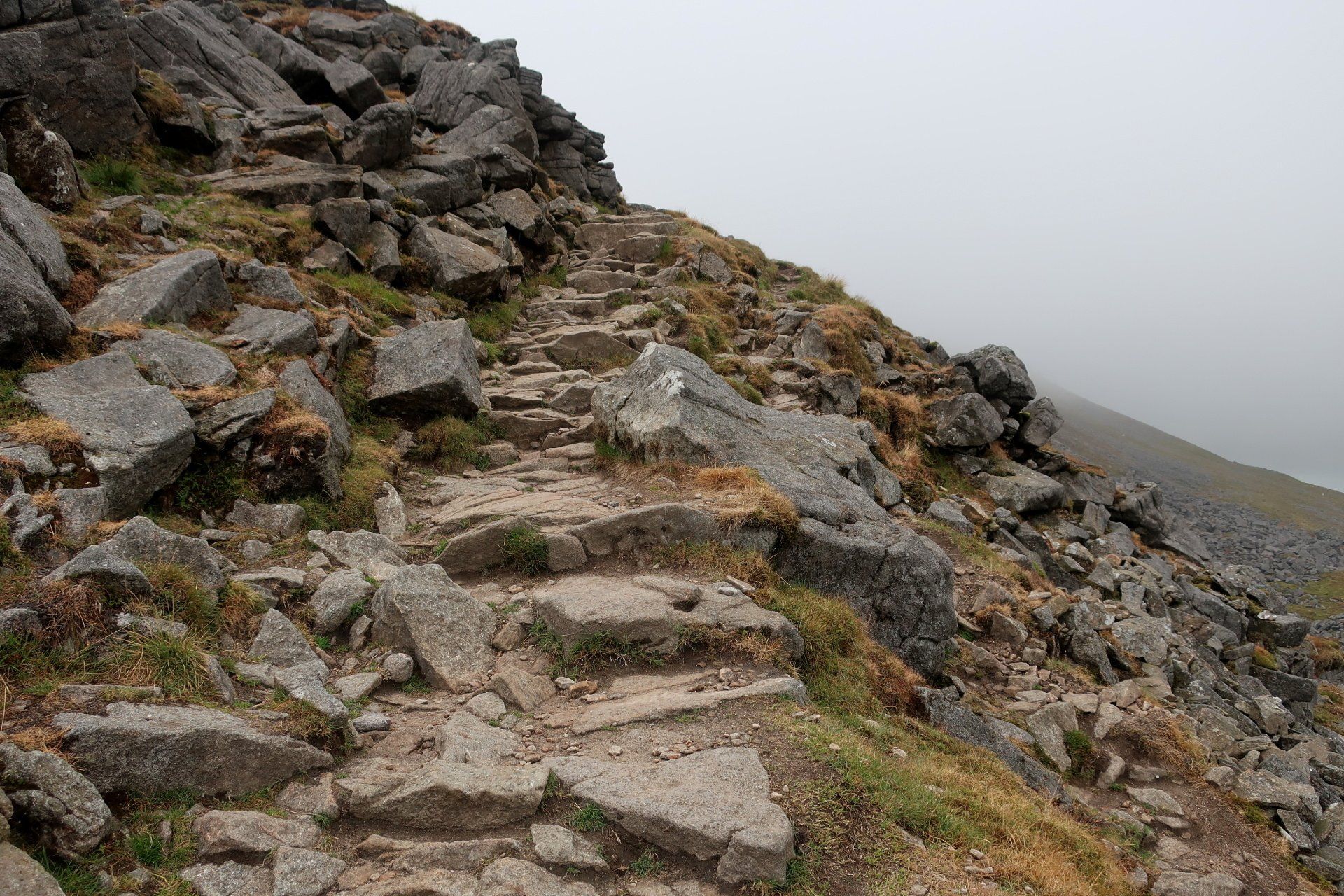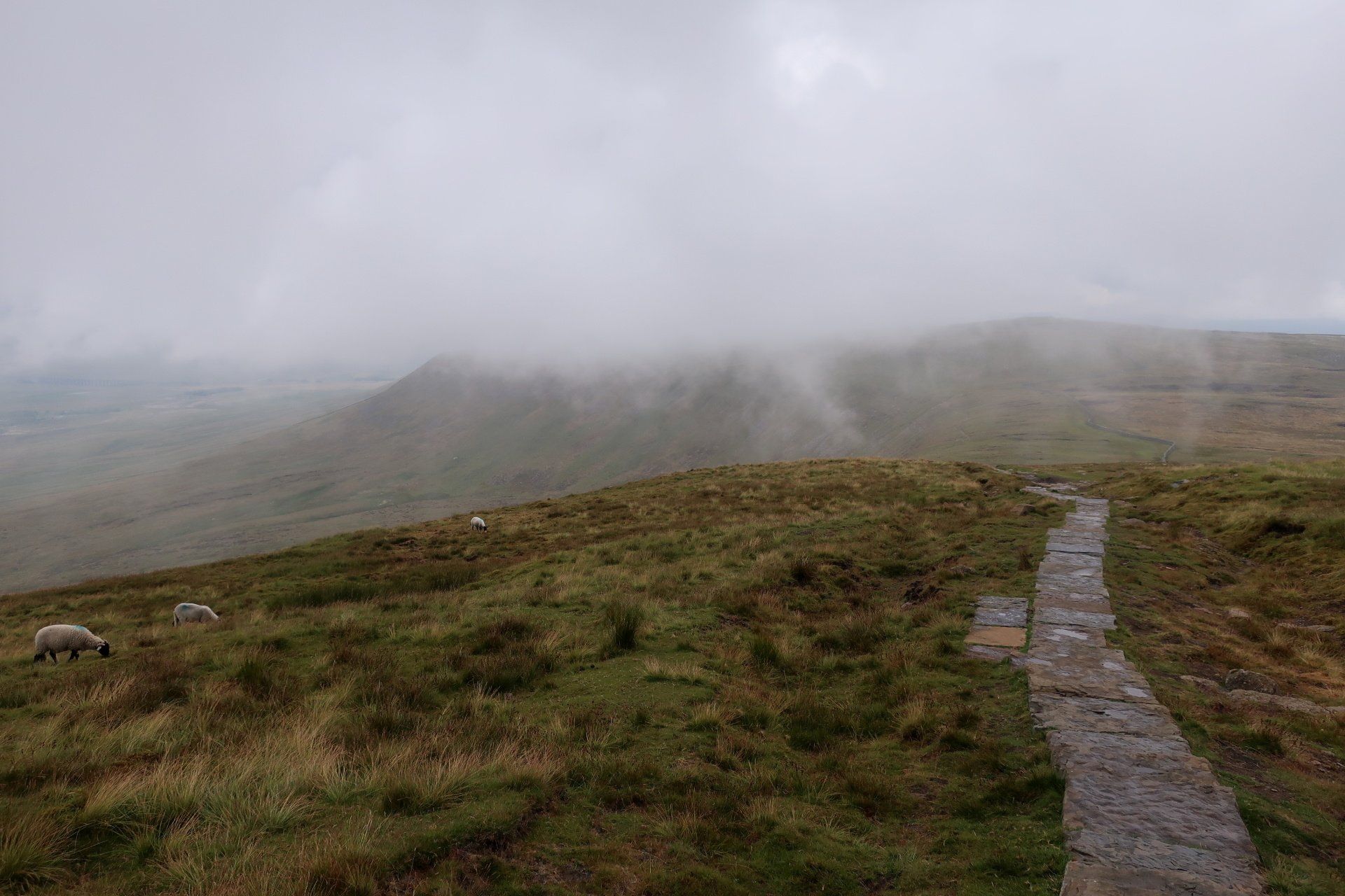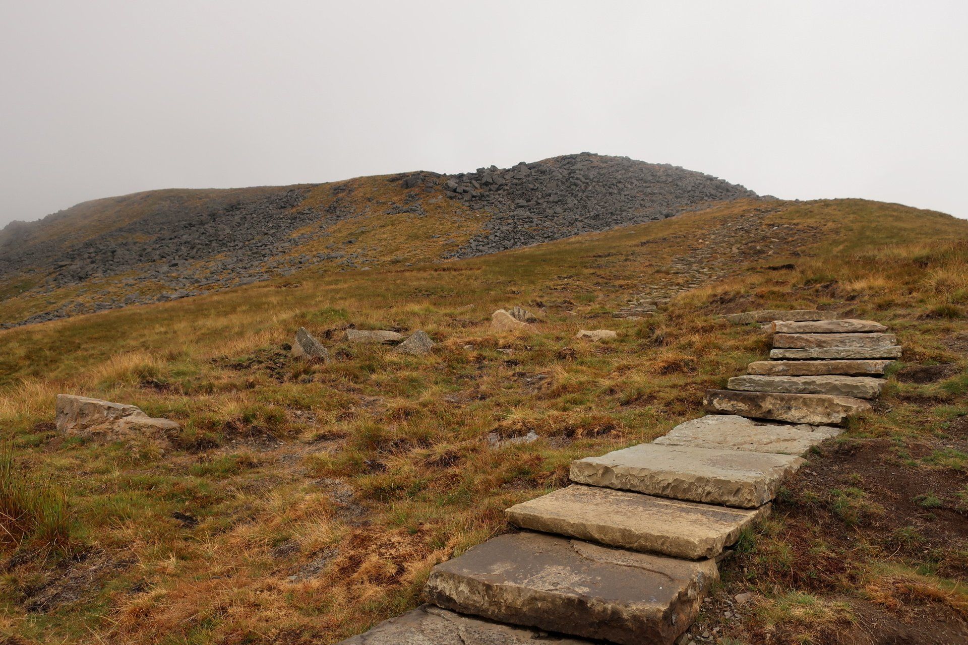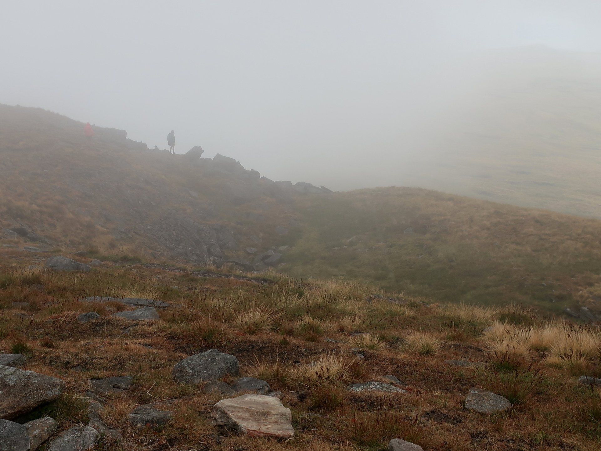 I make my assault on the summit, the last a bit of a scramble (but easy) and come out on top, at which point it starts to rain proper and the mist and low cloud descend. I take shelter behind a convenient wall and have my planned snack. Only problem, I was expecting to be sitting enjoying the view, unfortunately visibility is about 20m. Such a shame. Initially I wait it out but not much changes so I feel I must move on – I don’t want to cool down too much. Off I go into the murk, the plus being the rain has mostly petered out by now.