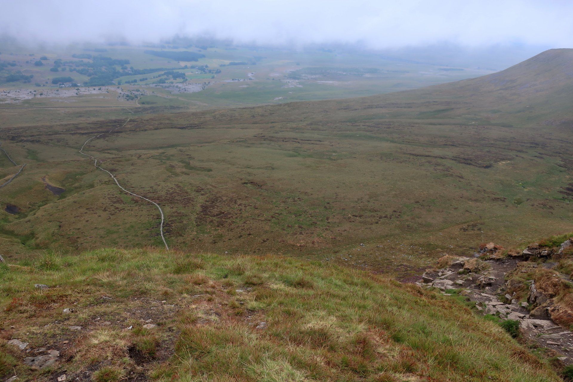 As I leave the shelter of the mountain the wind blows hard, although the rain has now stopped completely, but I need to keep wrapped up for a while. As I move along the ridge I get good glimpses of some fine views, including looking back at Ingleborough and down into the valley below, after a while these scenes becoming clearer as the cloud lifts. I am not sure whether it is the weather generally improving or whether it is localized to Ingleborough and the more I move away the better it gets, either way, same result.