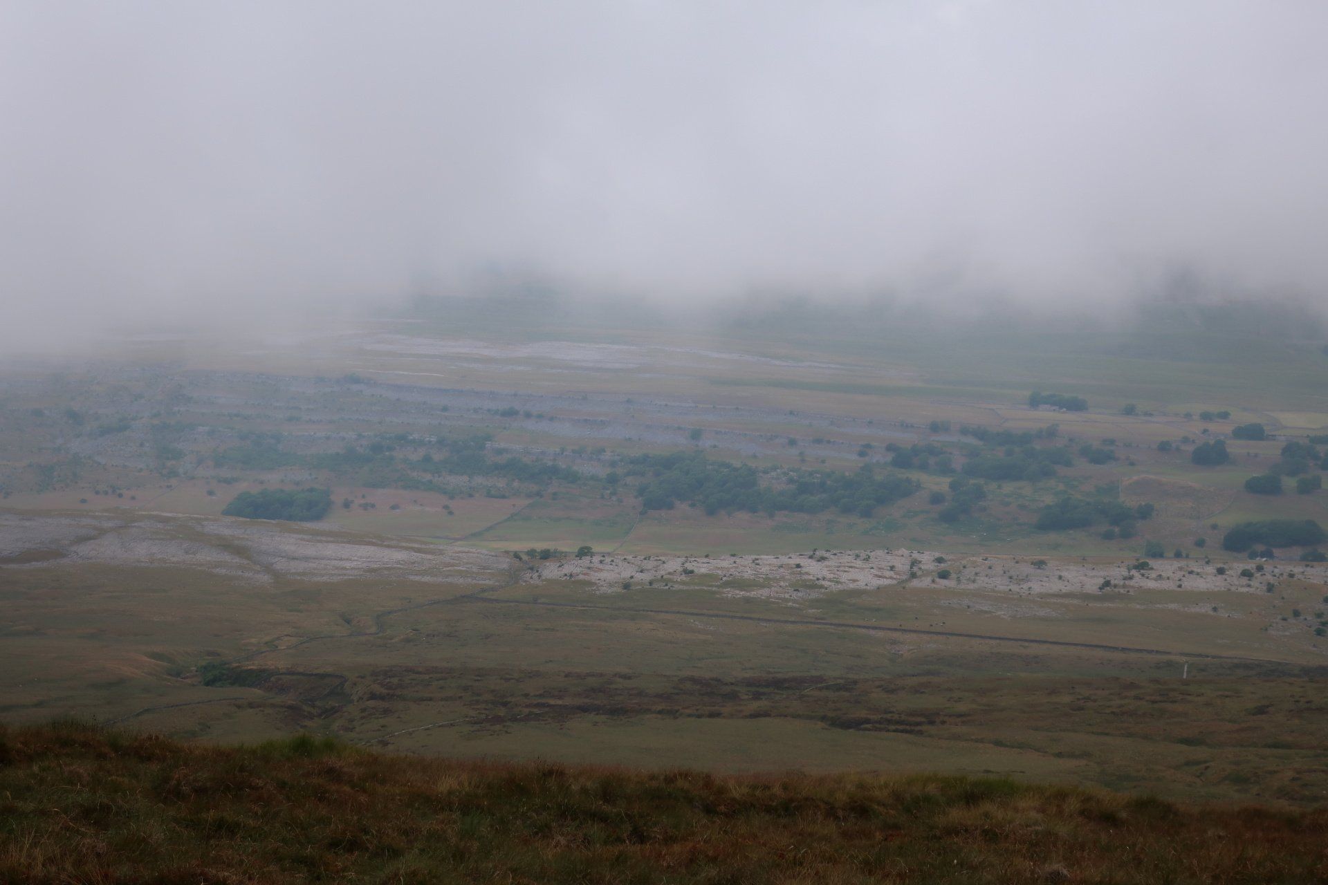 The benefits of GPS guide me to the trig point – certainly no other way of finding it….like actually being able to see it!. I do see a few people around, just ghostly shapes in the mist. There is no point in hanging around so I head back, as I do so the mist / cloud suddenly lifts, just like that, but only for a minute, then closes right back in. Strange.
