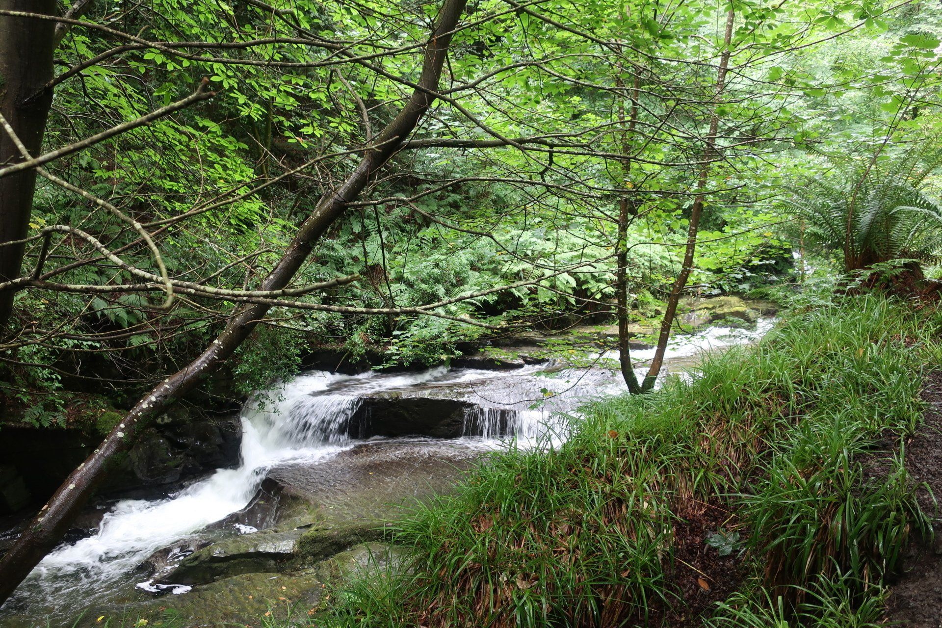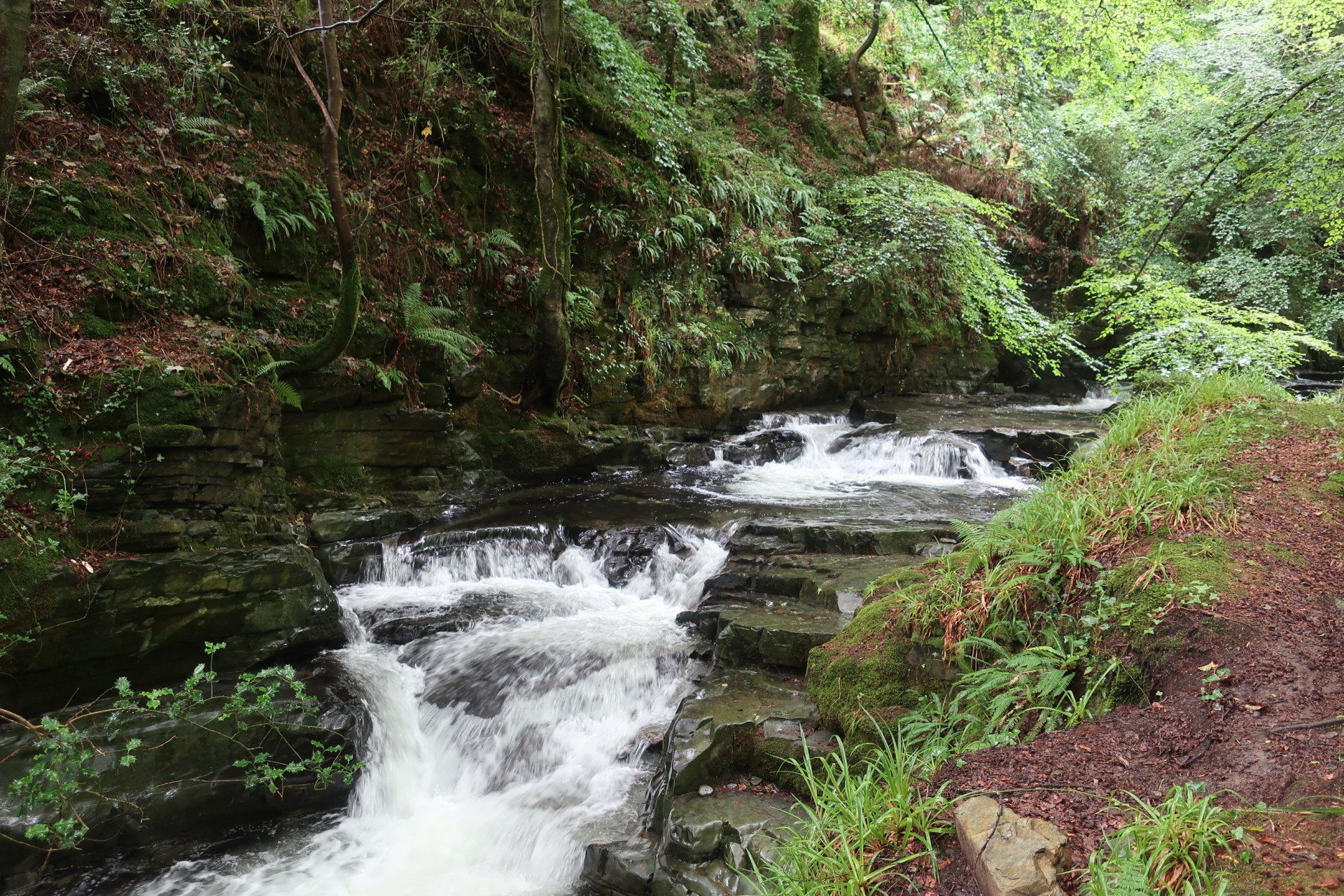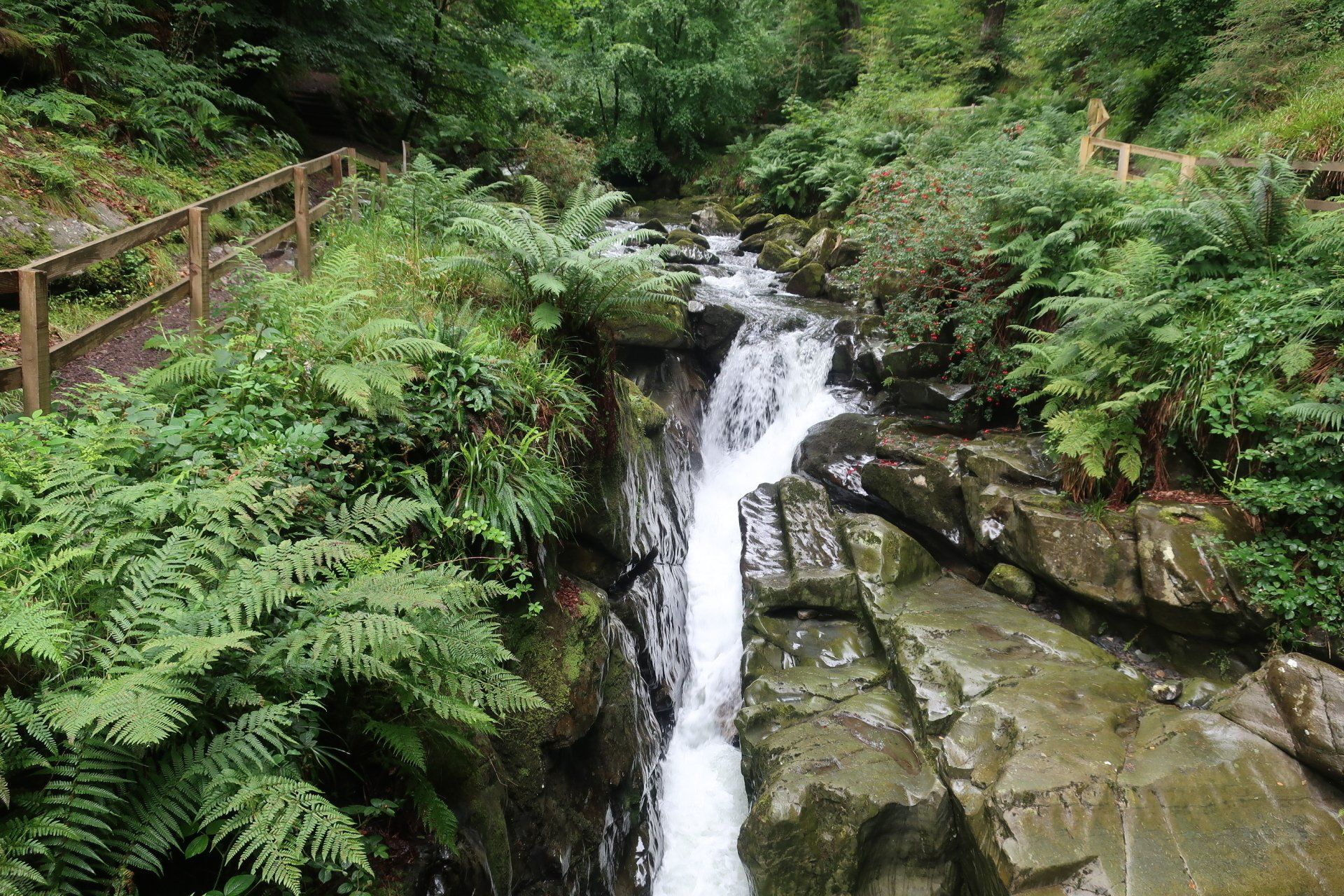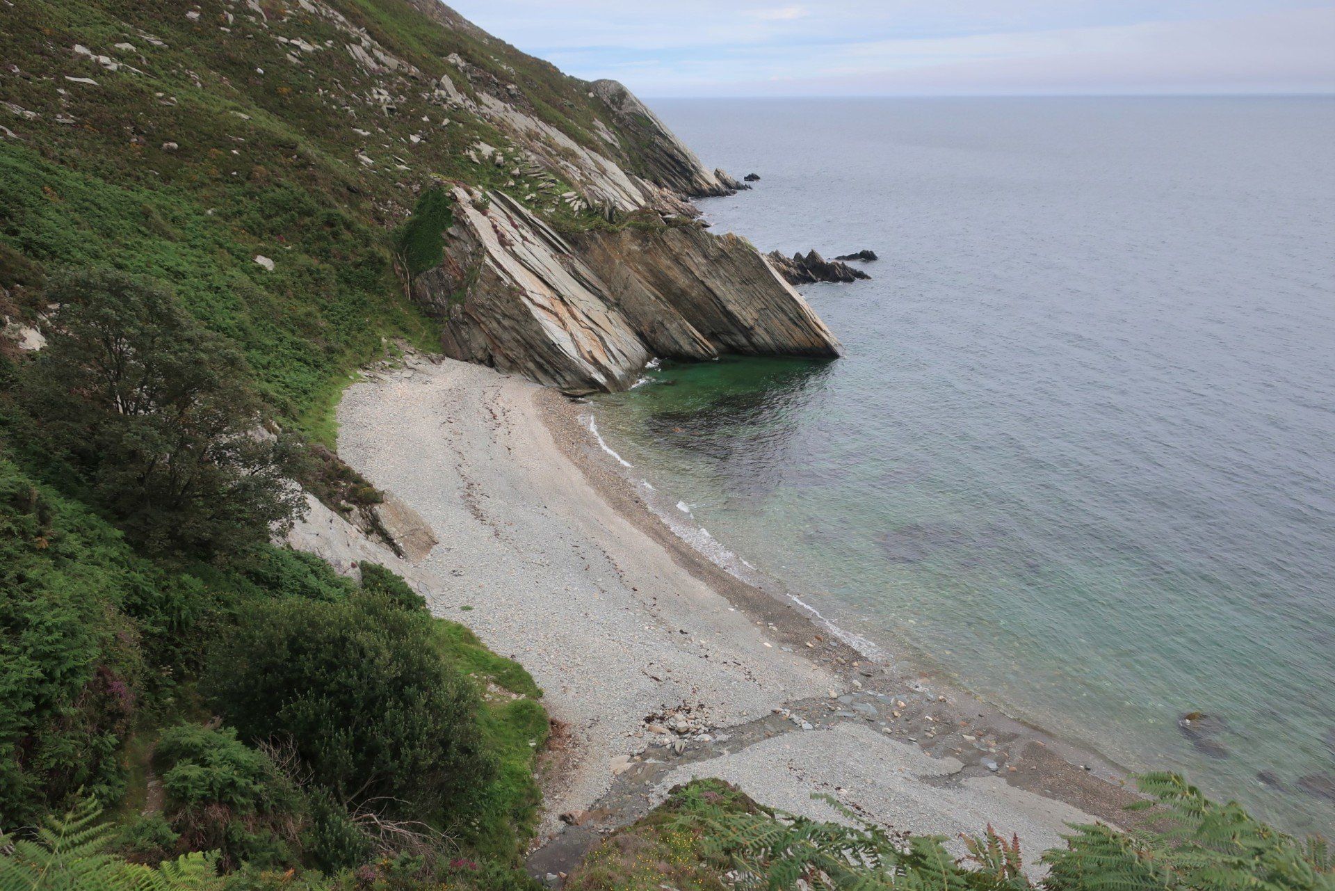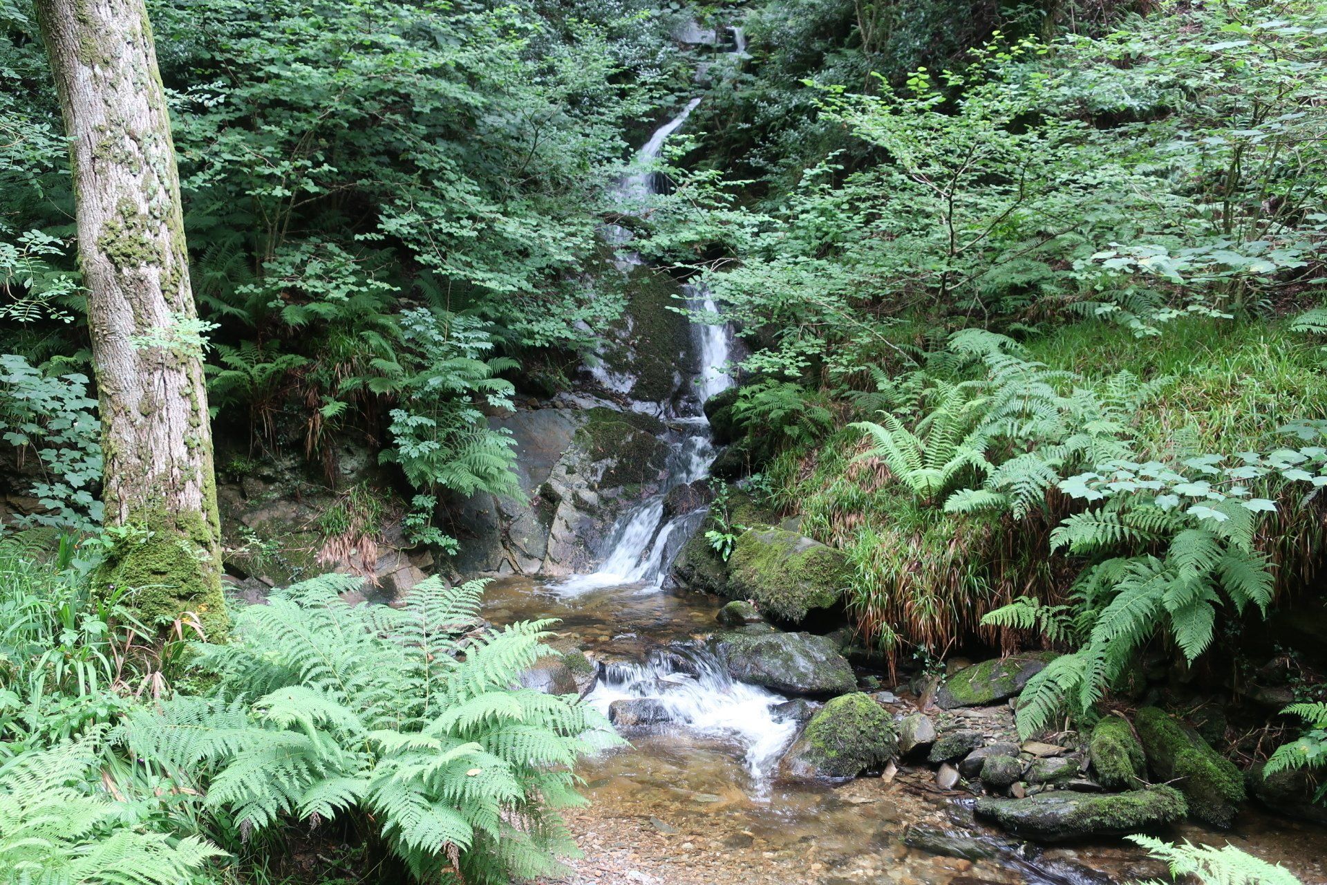 A few more miles, following the river which discharges into the sea at Port Cornaa, then back inland on the small lanes (on a long, steepish climb) until I reach my second glen – Dhoon Glen. This is different again, a steep sided valley, stepping down to the beach at Dhoon Bay, a mile or so up & down. It is most noticeable for an impressive waterfall “Big Girl”, at 130ft a decent fall. Again, lots of trees and paths winding around the streams make this very attractive and enjoyable, reinvigorating me despite the climbing